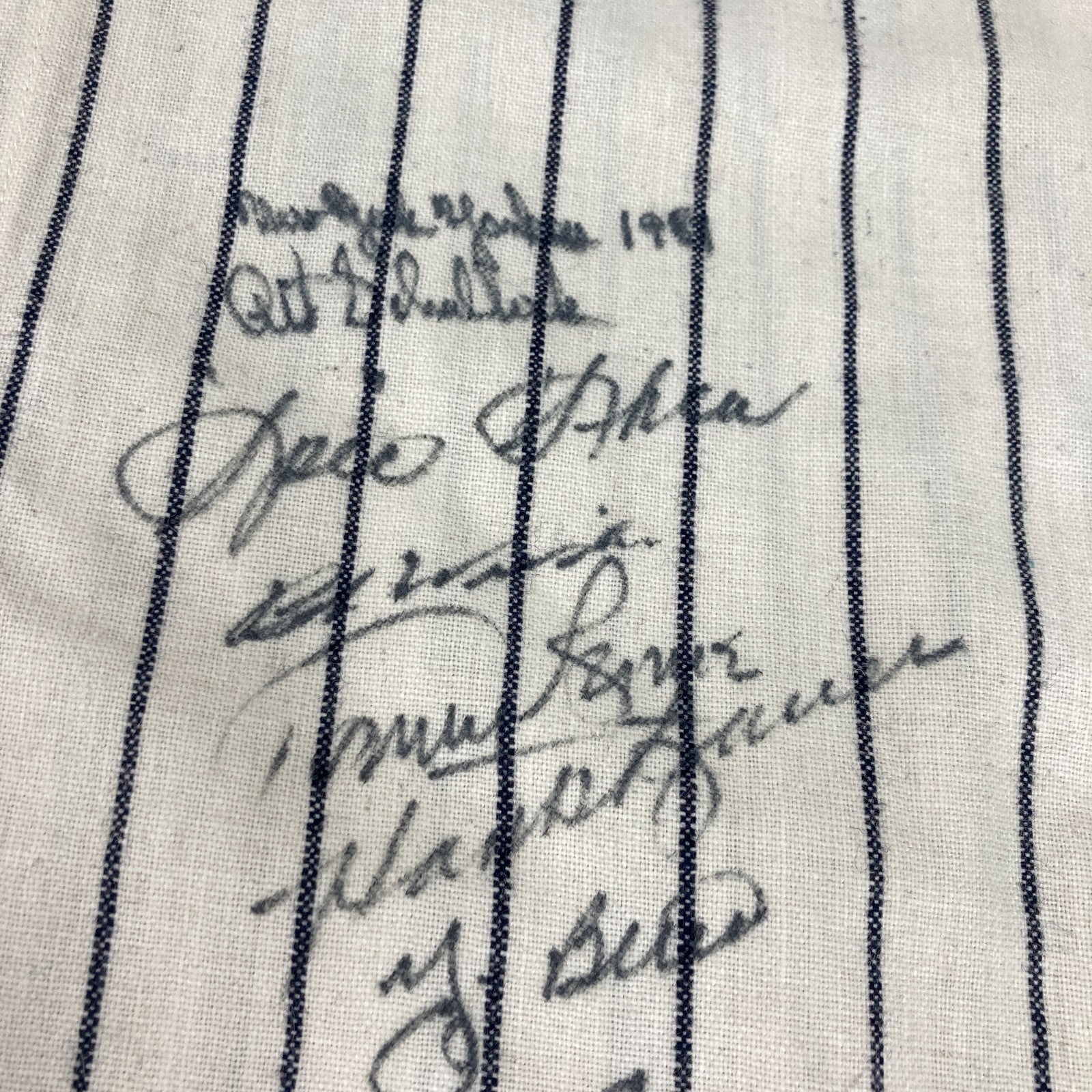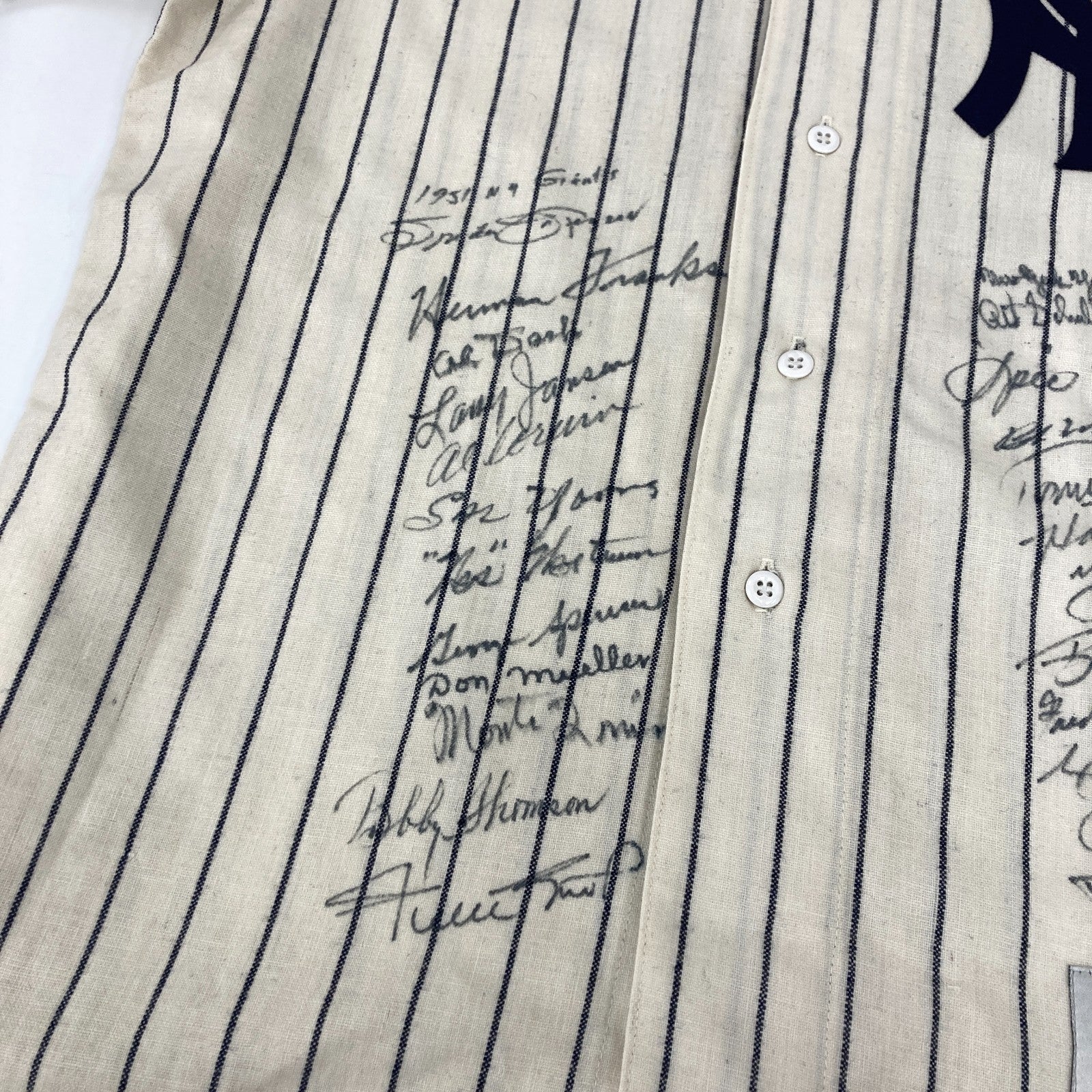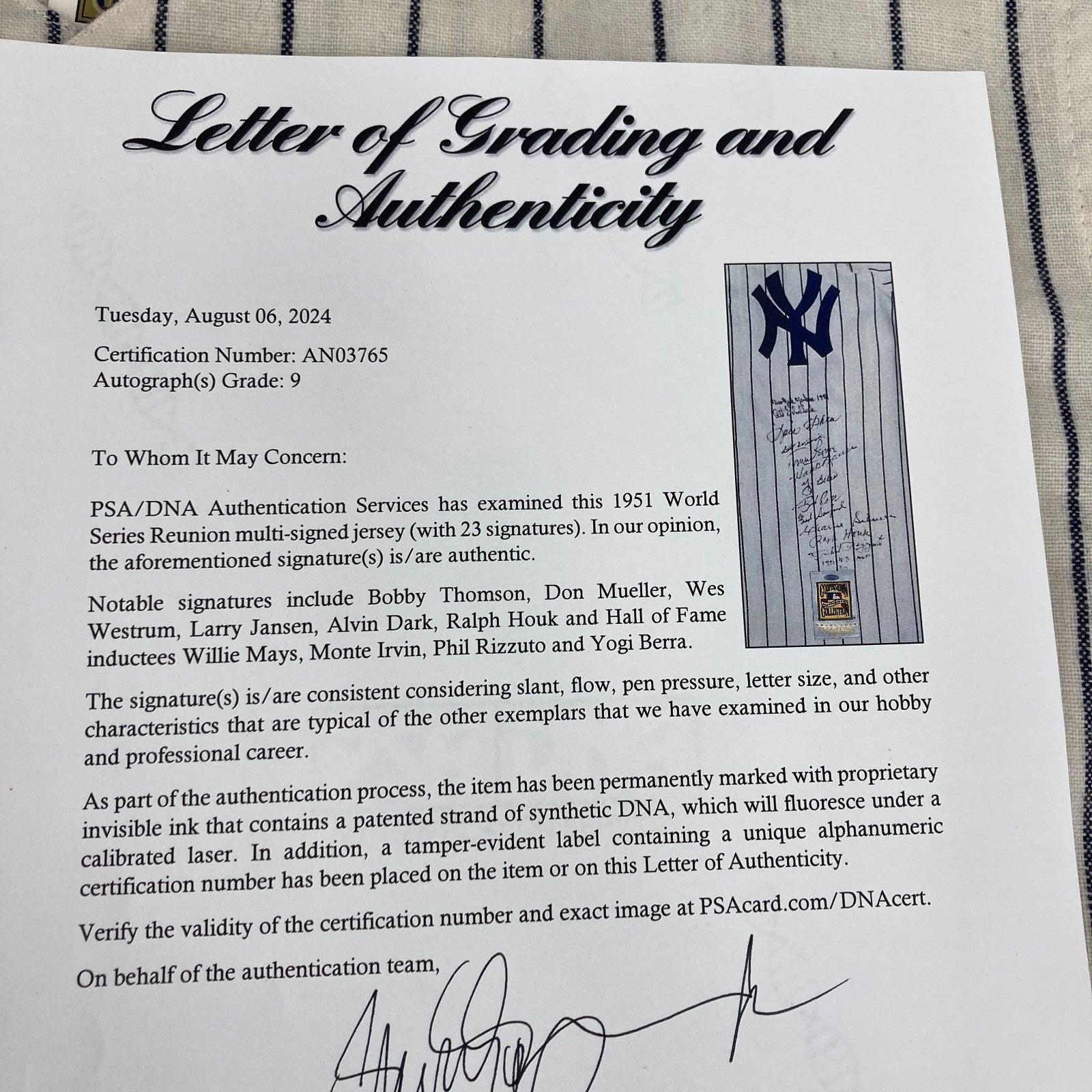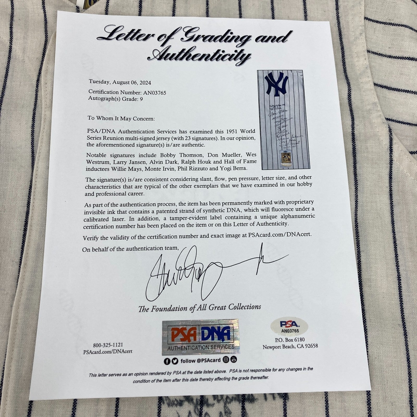 1951 New York Yankees and Giants autographed limited edition jersey. Top of the line pinstriped throwback jersey by Mitchell & Ness (number 10 on back which was worn by Phil Rizzuto) has been signed on the front by a total of (23) members of the Yankees and Giants. Notables include Willie Mays, Phil Rizzuto, Yogi Berra, Monte Irvin, Ralph Houk, Wes Westrum, Hank Bauer, Bobby Thomson, and others.There is a Steiner authentication hologram affixed. Includes full LOA from PSA/DNA.
