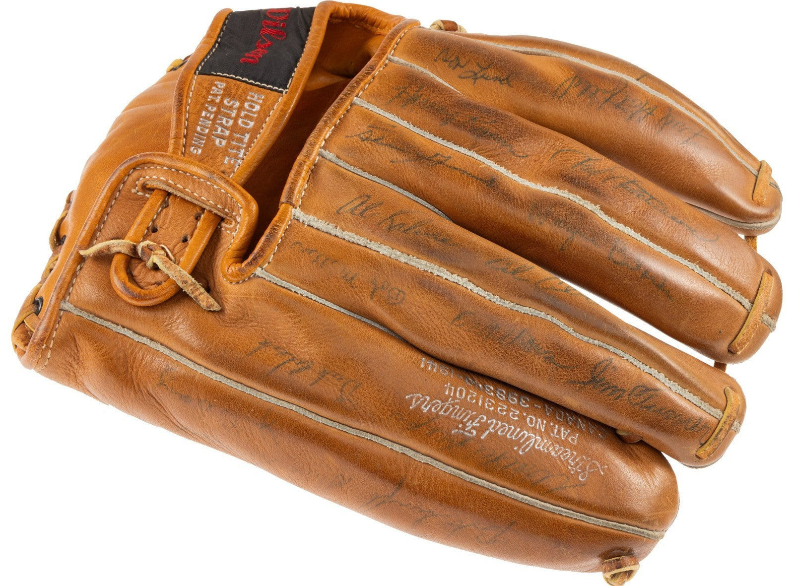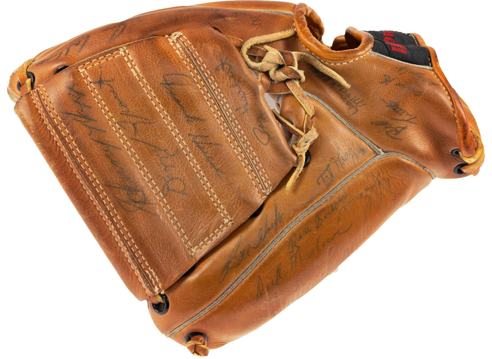 We are safe in surmising that this Lefty Grove Wilson baseball glove (left handed) was signed at a Tigers and Yankees game given all the players are from those two teams. Whoever chased down these signatures had an amazing success rate as 55 names are present.