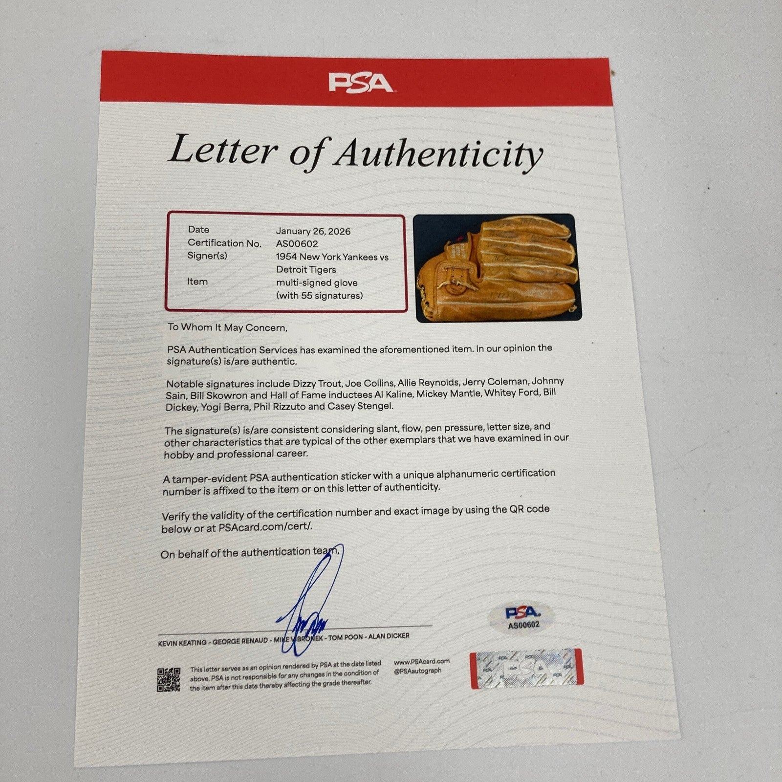 Signatures include: Mickey Mantle, Casey Stengel, Phil Rizzuto, Bill Dickey, Eddie Robinson, Whitey Ford, Gene Woodling, Johnny Sain, Ed Lopat, Gil McDougald, Irv Noren, Yogi Berra, Dizzy Trout, Jerry Coleman, Jim McDonald, Allie Reynolds, Bobby Brown, Ralph Houk, Tom Gorman, Frank Crosetti, Willy Miranda, Andy Carey, Tom Morgan, Hank Bauer, Bob Cerv, Don Lund, Joe Collins, Fred Hutchinson, Harvey Kuenn, Steve Gromek, Al Kaline, Jim Turner, Fred Hartfield, Bob Miller, Wayne Belardi, Al Aber, Walt Dropo, Dick Weik, Bob Swift, Charlie Silvera, Bob Kuzava, Steve Souchok and Jim Delsing. Full LOA from PSA/DNA. Full LOA from Beckett Authentication Services.