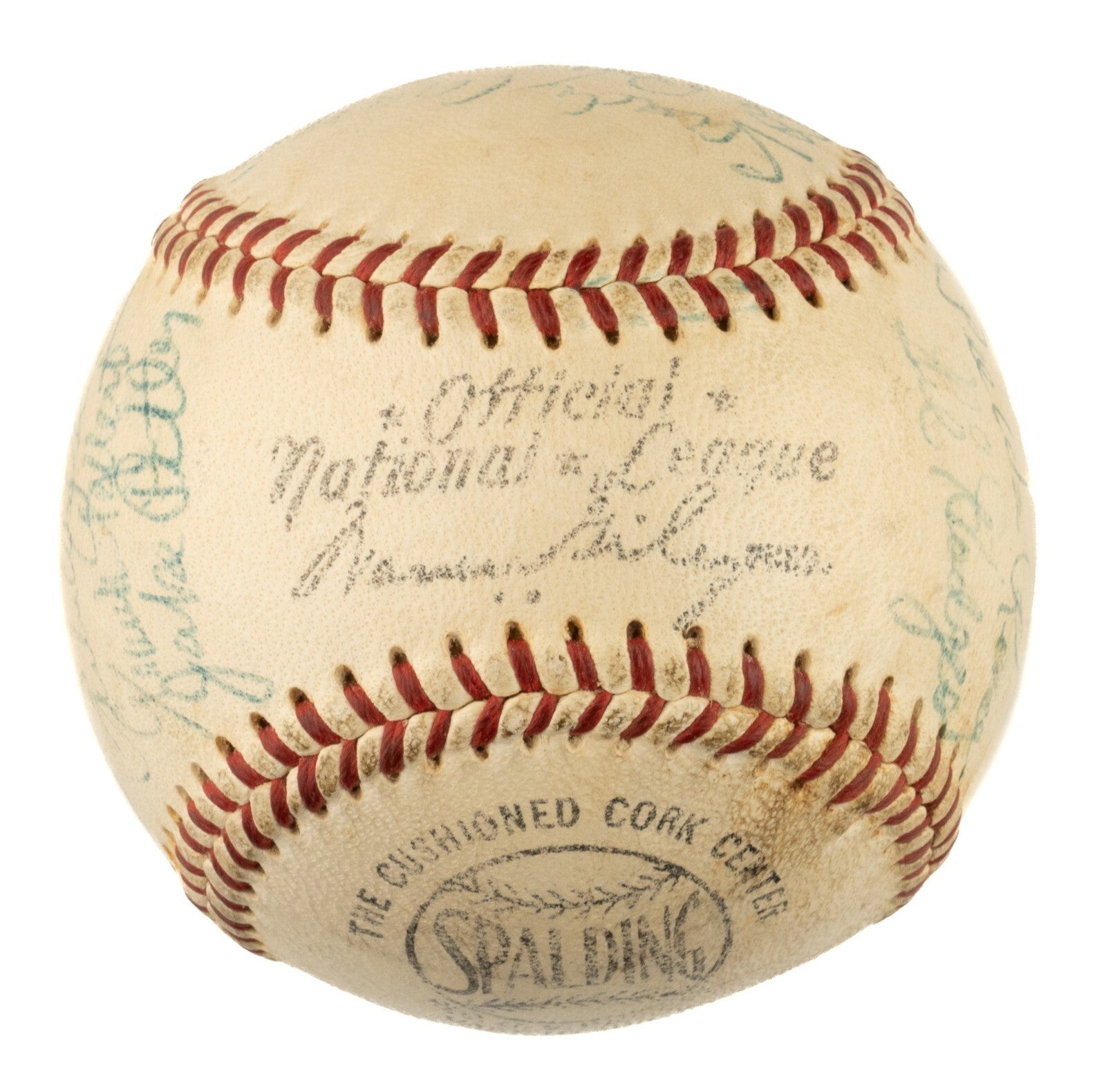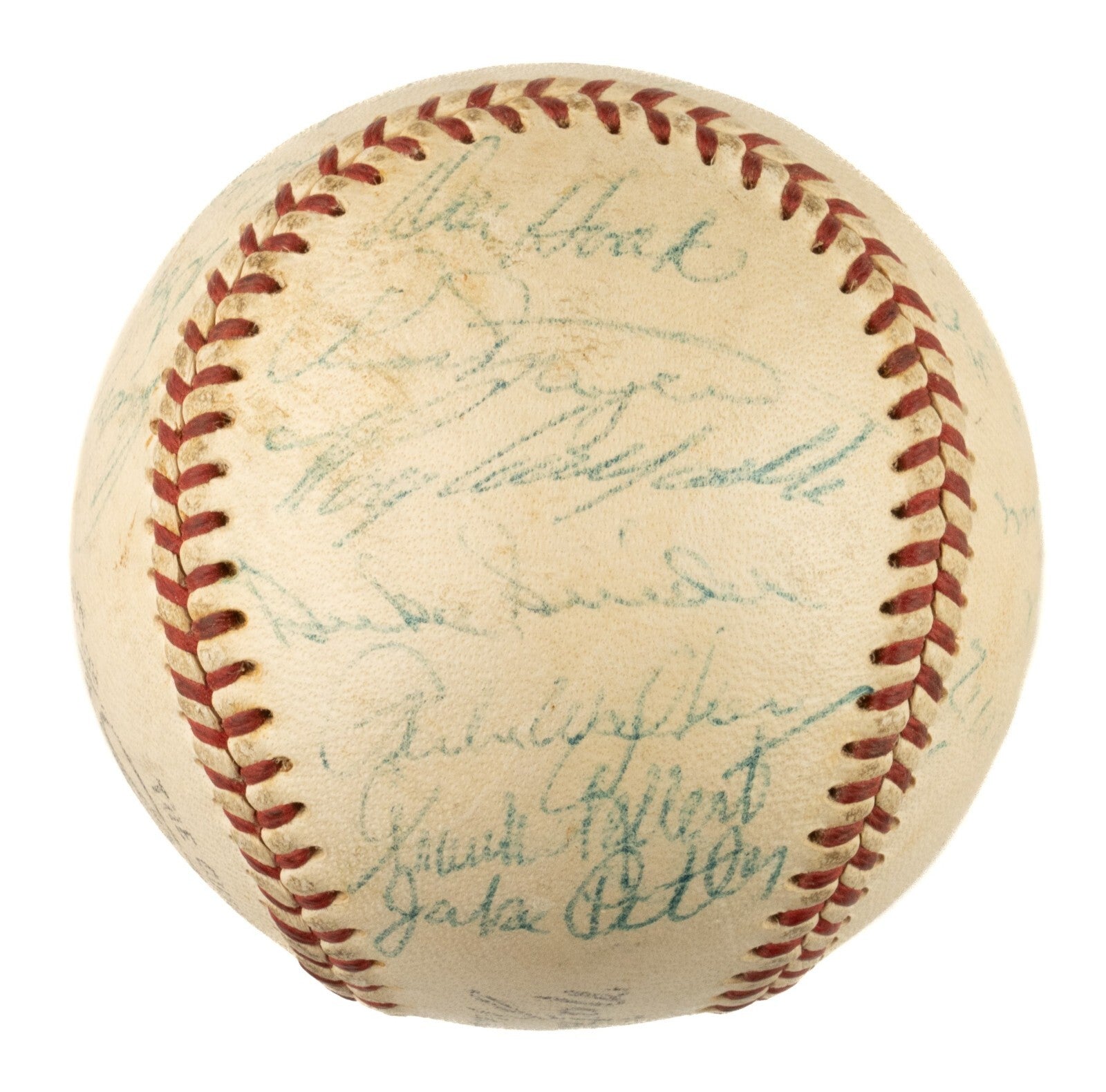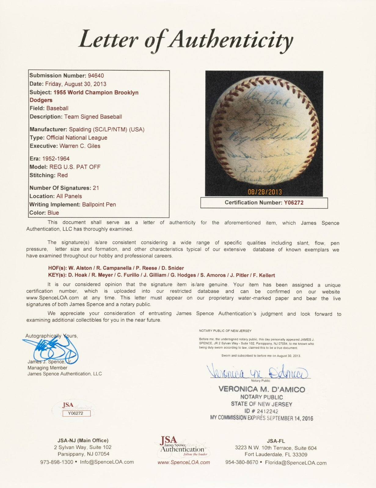 Official National League baseball (Giles) signed in blue ink by the following 21 members of the 1955 World Champion Brooklyn Dodgers: Campanella, Alston (Mgr., sweet spot), Snider, Reese, Hodges, Amoros, Roebuck, Erskine, Labine, Zimmer, Bessent, Newcombe, Hoak, Meyer, Walker, Kellert, Pitler (coach), Furillo, Spooner, Podres, and Gilliam. The notation "1955 Champs" is written below Alston's signature on the sweet spot. 1955 marked the Dodgers' only World Championship in Brooklyn, and team-signed balls from that historic season have always been highly prized by collectors. This example is also notable for the absence of any "clubhouse" signatures, which are quite common for 1950s Dodgers team balls. In Very Good to Excellent condition overall. Full LOA from James Spence/JSA.