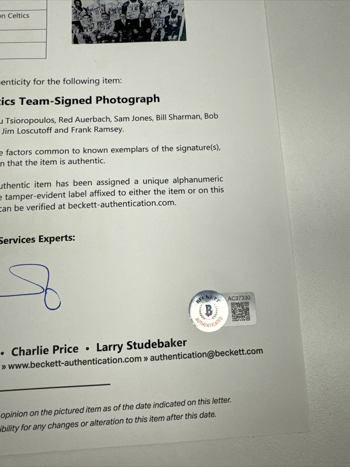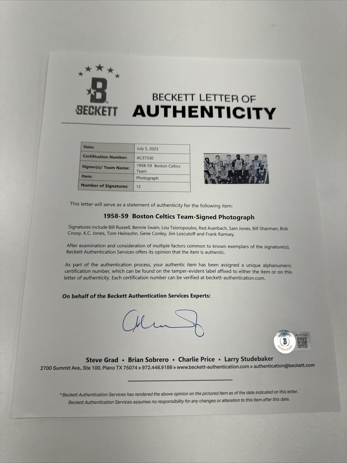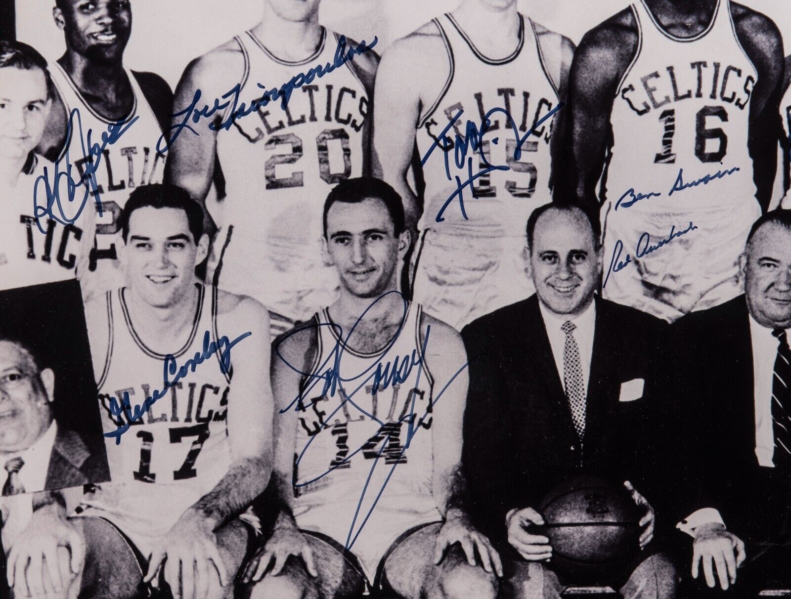 Offered is a 1958-59 Boston Celtics team-signed photograph framed to 32-by-26 inches. The Celtics captured the first of their astounding eight consecutive NBA titles that season, powered behind the play of Hall of Famers Bob Cousy and Bill Russell. The photo is signed by Hall of Famers Bill Russell, Bob Cousy, and Red Auerbach, with additional signatures from Lou Tsirorpoulos, Tom Heinsohn, Gene Conley, Bennie Swan, Bill Sharman, Jim Loscutoff, Sam Jones, and Frank Ramsey. The frame displays some chipping, and the item comes with an LOA from Beckett Authentication for the signatures.