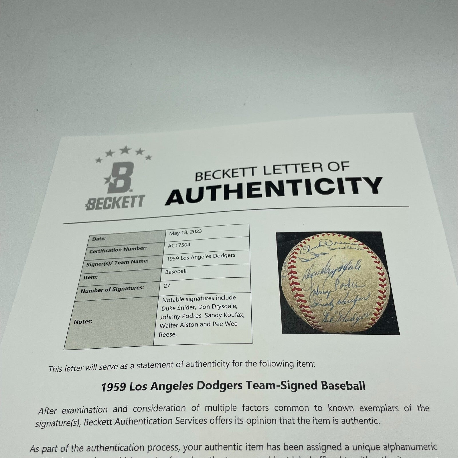 Stunning 1959 Los Angeles Dodgers Team Signed Baseball. Official National League (Giles) sphere is signed by approximately twenty-seven World Champion Dodgers, including Hall of Famers Koufax, Drysdale, Snider, Reese, Hodges and Alston. Other notables in attendance include Podres, Erskine, Labine, Furillo, Gilliam, Wills, Fairly, Roseboro, Moon and Dressen. The blue ink autographs grade an overall 9/10 in strength. Full LOA from Beckett Authentication Services.