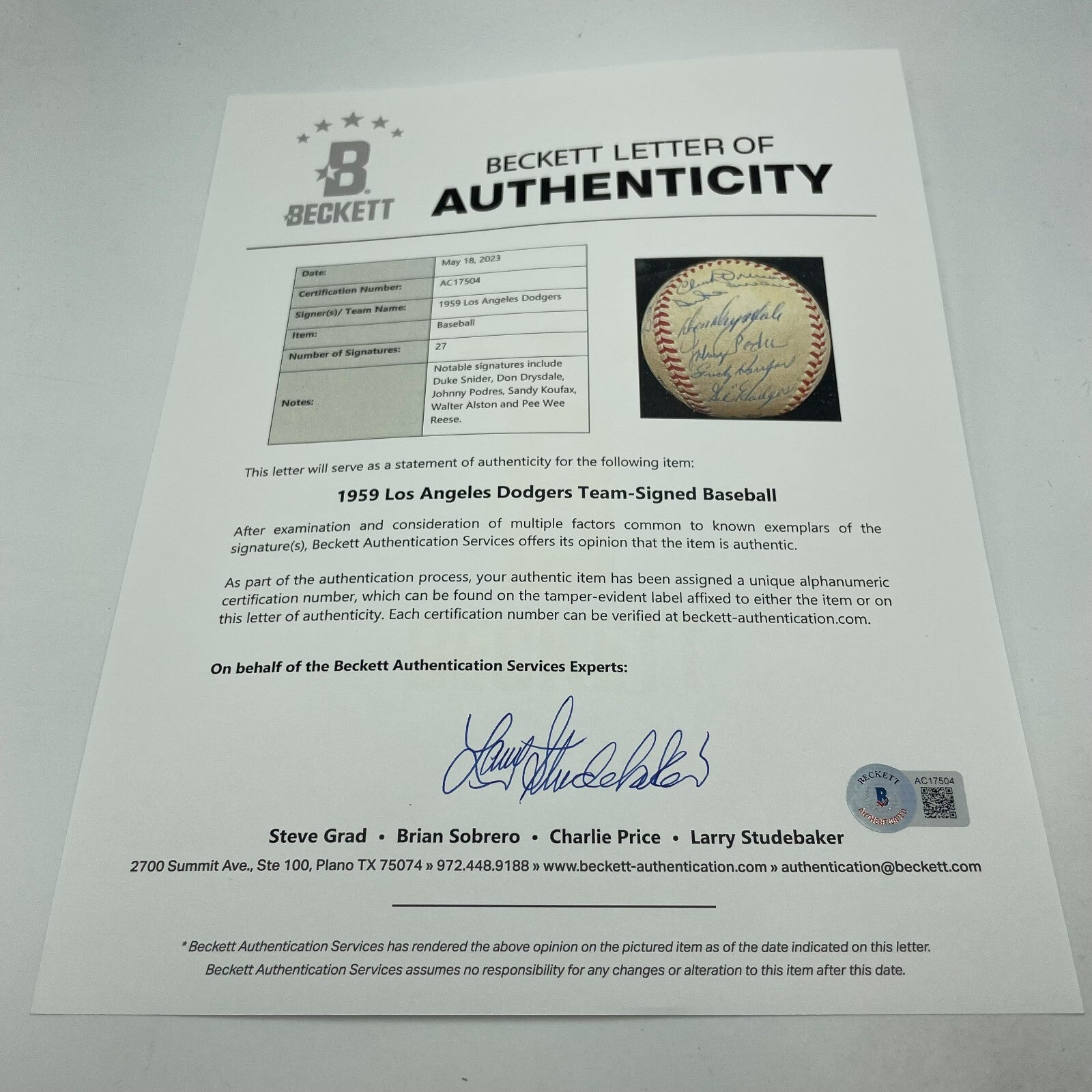 1959 Los Angeles Dodgers World Series Champs Team Signed Baseball Koufax Beckett