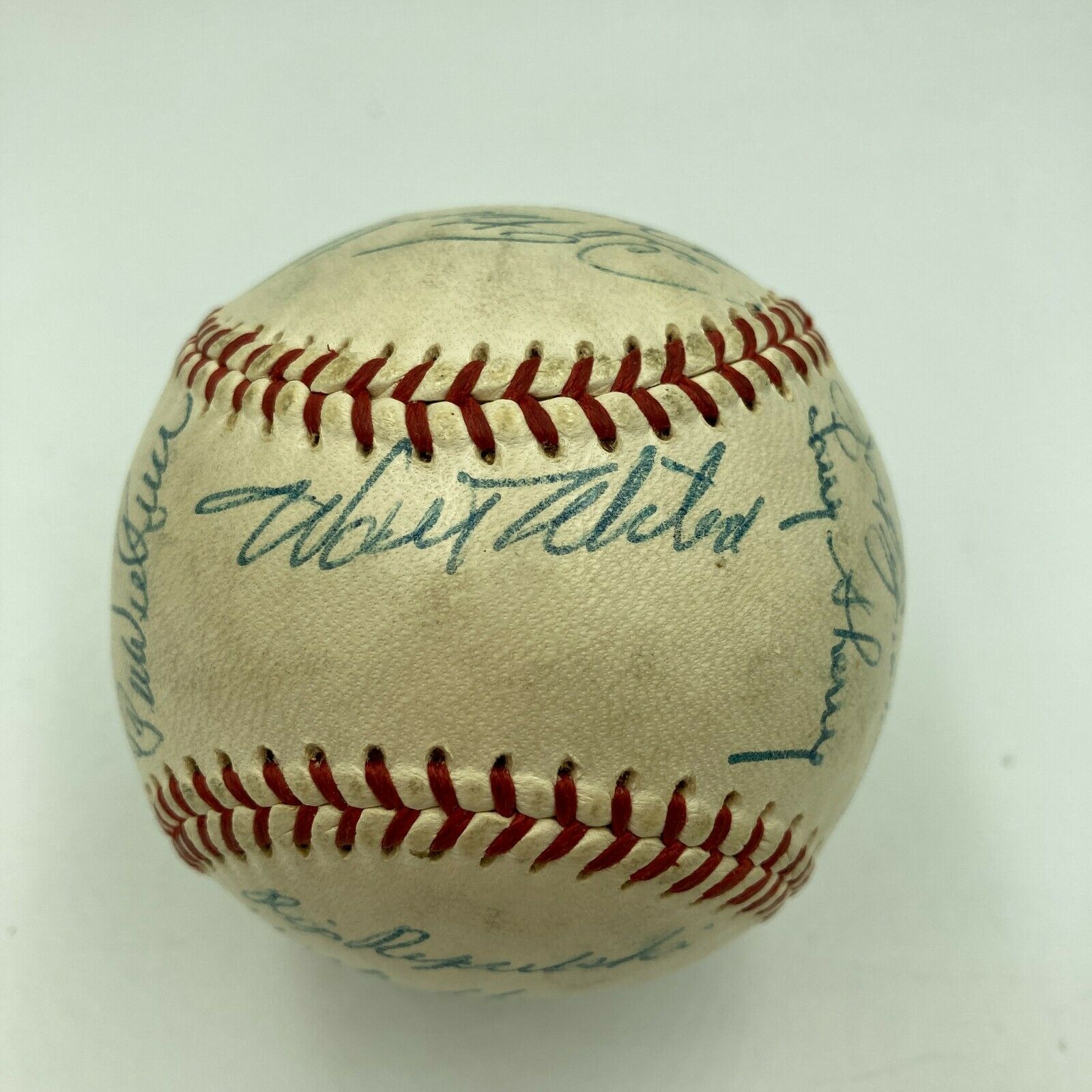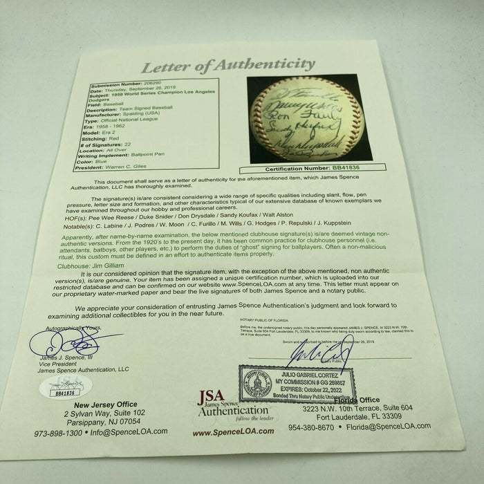 Beautiful 1959 Los Angeles Dodgers World Series Champs Team Signed Baseball. 22 signatures with Sandy Koufax, Don Drysdale, Pee Wee Reese, Duke Snider, Walt Alston and many others. Full letter JSA COA.