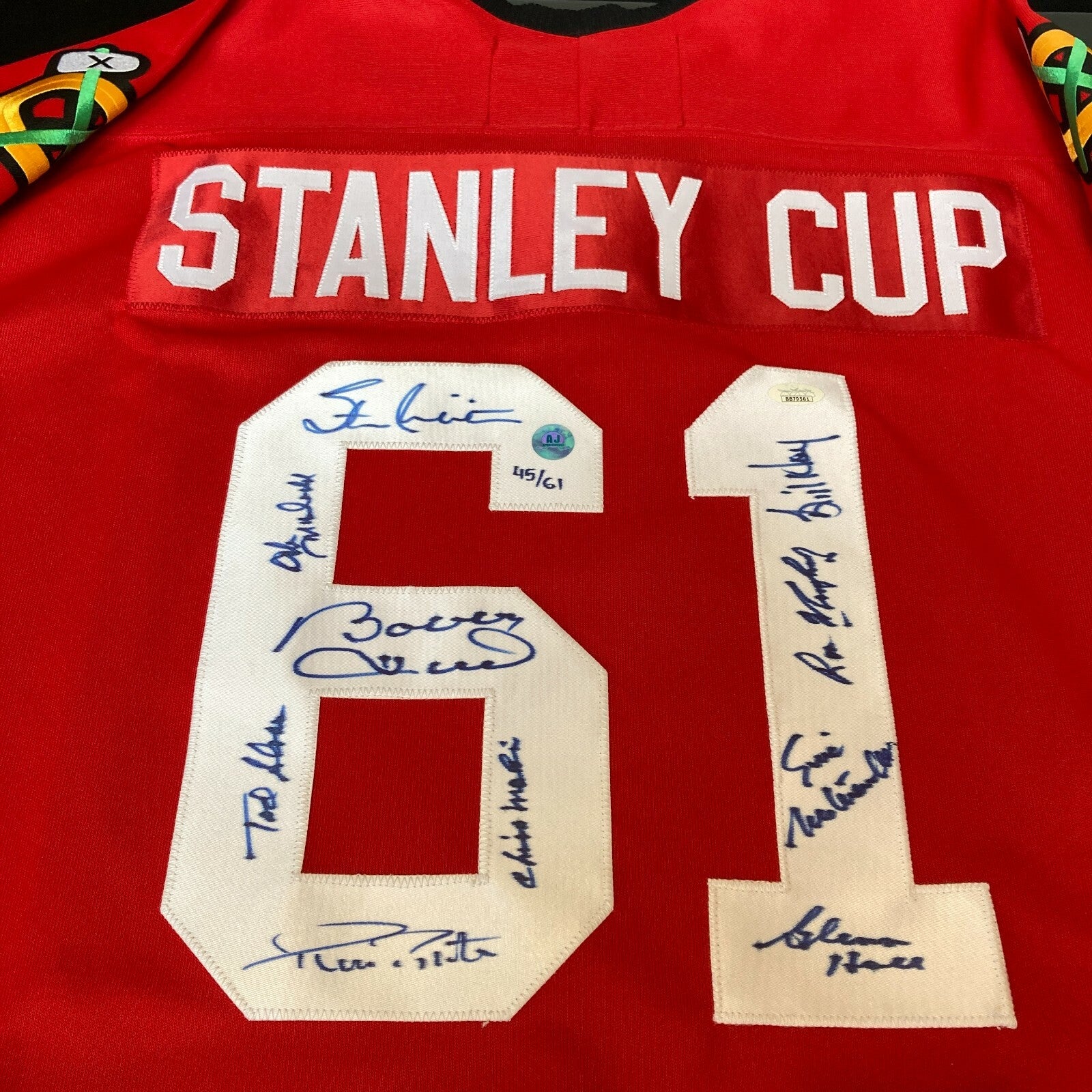 Back in the days of the NHL's "Original Six", it took a lot to beat the "Flying Frenchmen" of Montreal and Gordie Howe's Detroit Red Wings. Headed by scoring machines Bobby Hull and Stan Mikita, the Chicago Blackhawks came through in the 1960-1961 season to claim Lord Stanley's Cup. Blackhawks boosters get a big boost with this 1960-1961 champion Blackhawks multi-signed commemorative hockey jersey. This classic CCM creation is sized "XL", as noted on the factory label inside the collar. A vibrant red garment, this crisp shirt is like-new and sports colorful logo patches on the front and both sleeves. A total of (10) 1960-1961 Blackhawks team members have signed this limited edition jersey on the back number "61" patches, with a "Stanley Cup" nameplate above. Signatures include: Hall of Famers Bobby Hull, Stan Mikita, Bill Hay, Pierre Pilote, Glenn Hall; and stars Eric Nesterenko, Ron Murphy, Ted Sloan, Ab McDonald and Chico Maki. Just to the right of Mikita's autograph at top on the number "6", this piece is LE numbered "45/61". Full photo LOA from JSA.