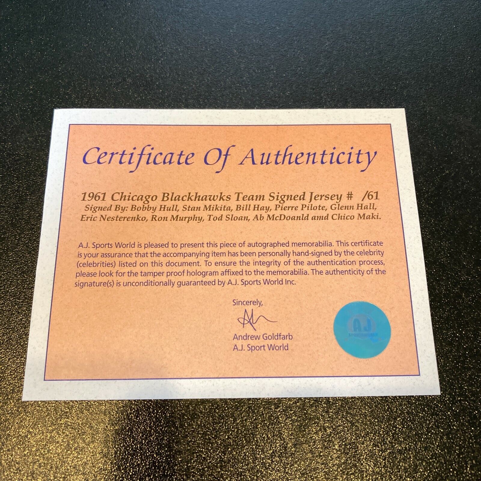 1961 Chicago Blackhawks Stanley Cups Champions Team Signed Jersey JSA COA