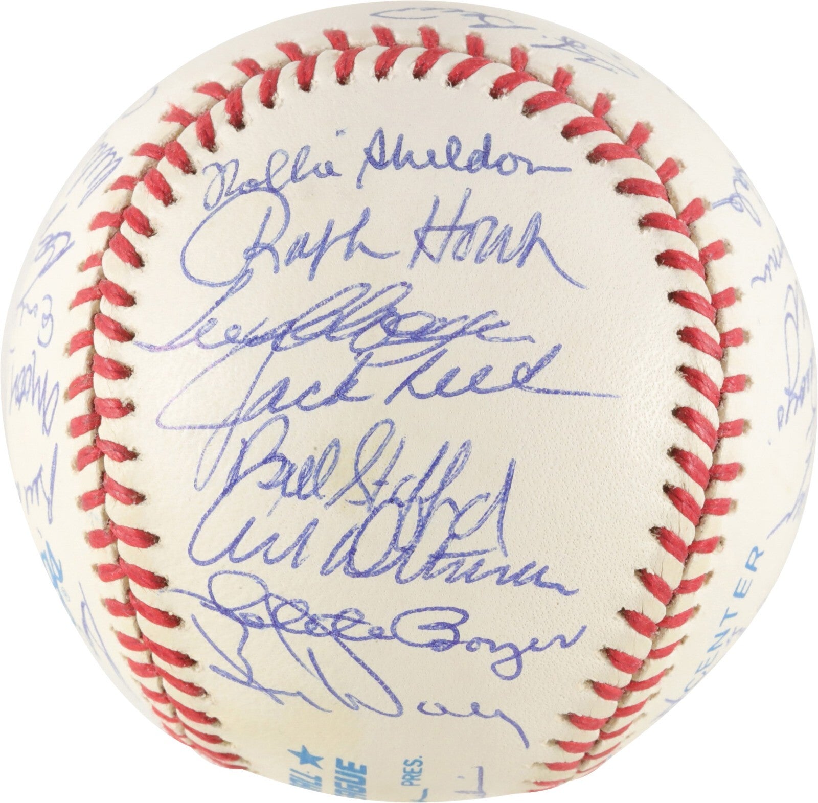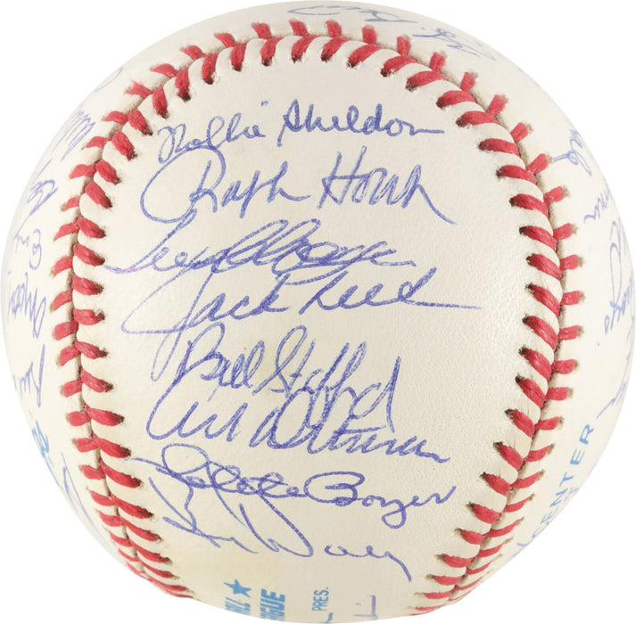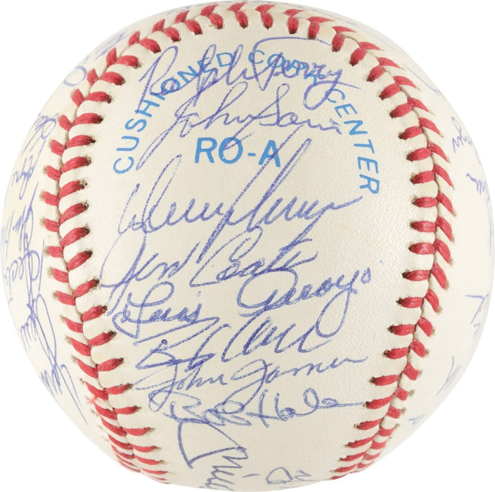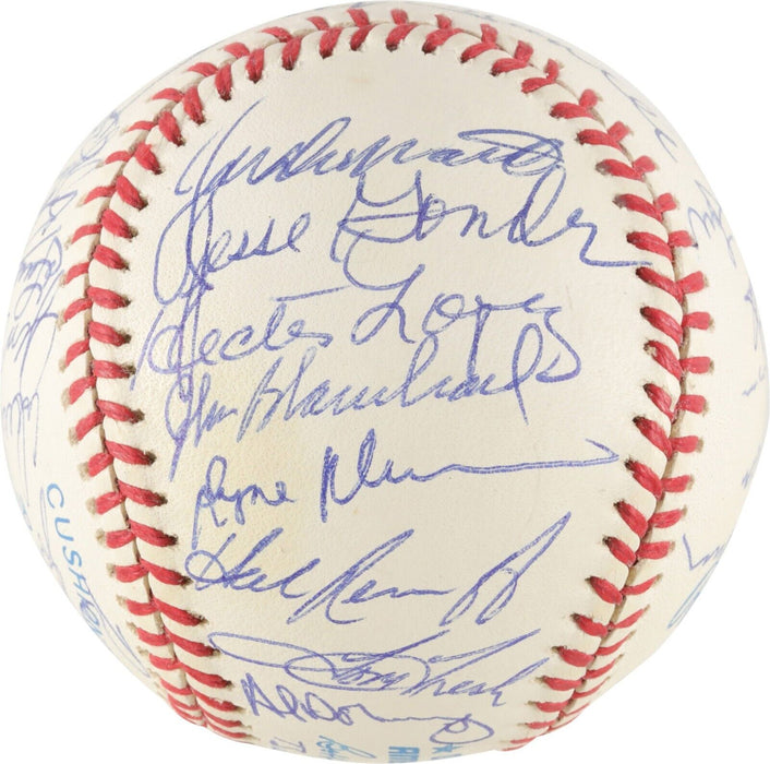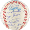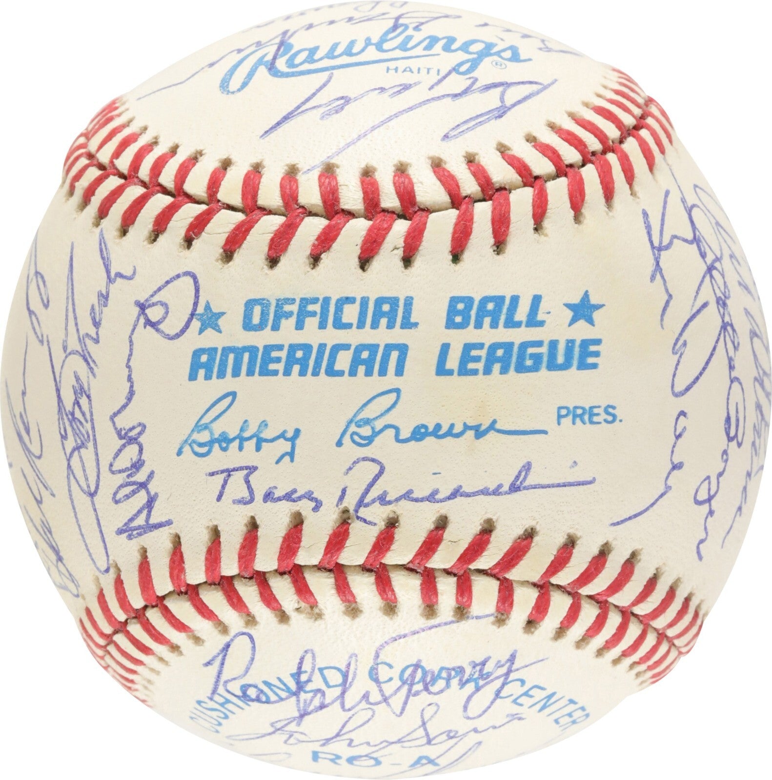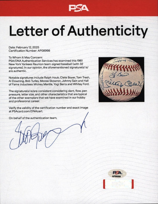 Official American League baseball signed in blue ink by thirty-three former members of the 1961 World Champion New York Yankees, including Mickey Mantle (sweet spot), Berra (sweet spot), Ford, Turley, Gardner, Skowron, Torgeson, McDevitt, Hale, James, Cerv, Arroyo, Coates, Sain, Terry, DeMaestri, Gonder, Lopez, Blanchard, Duren, Reniff, Tresh, Downing, Richardson (on ball label), Daley, Boyer, Ditmar, Stafford, Reed, Clevenger, Houk (Mgr.), and Sheldon. All the signatures are boldly scripted and average 9-10. Near Mint condition. Full LOA from PSA.