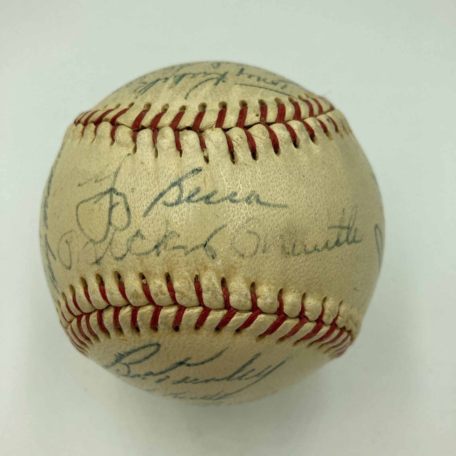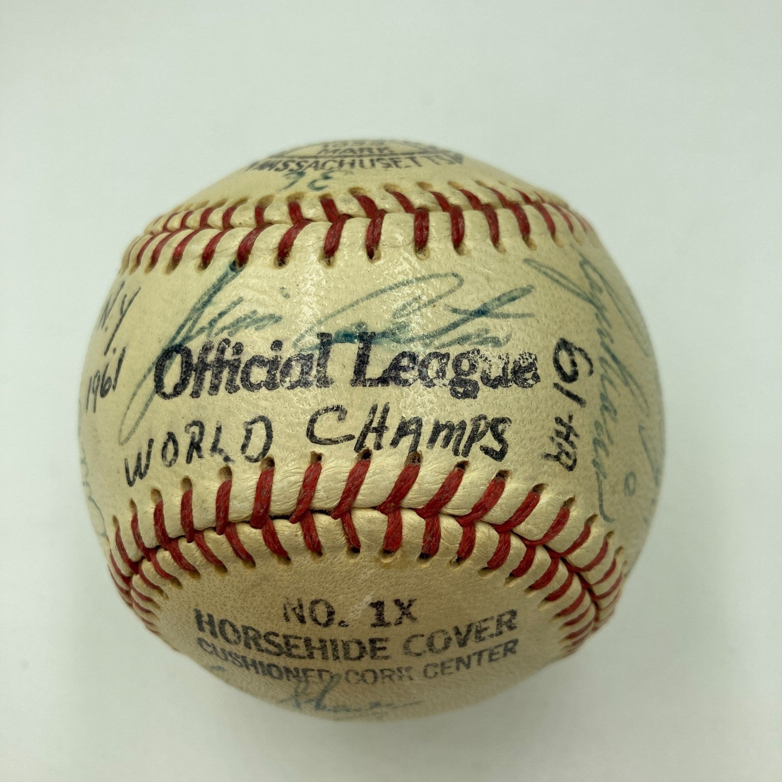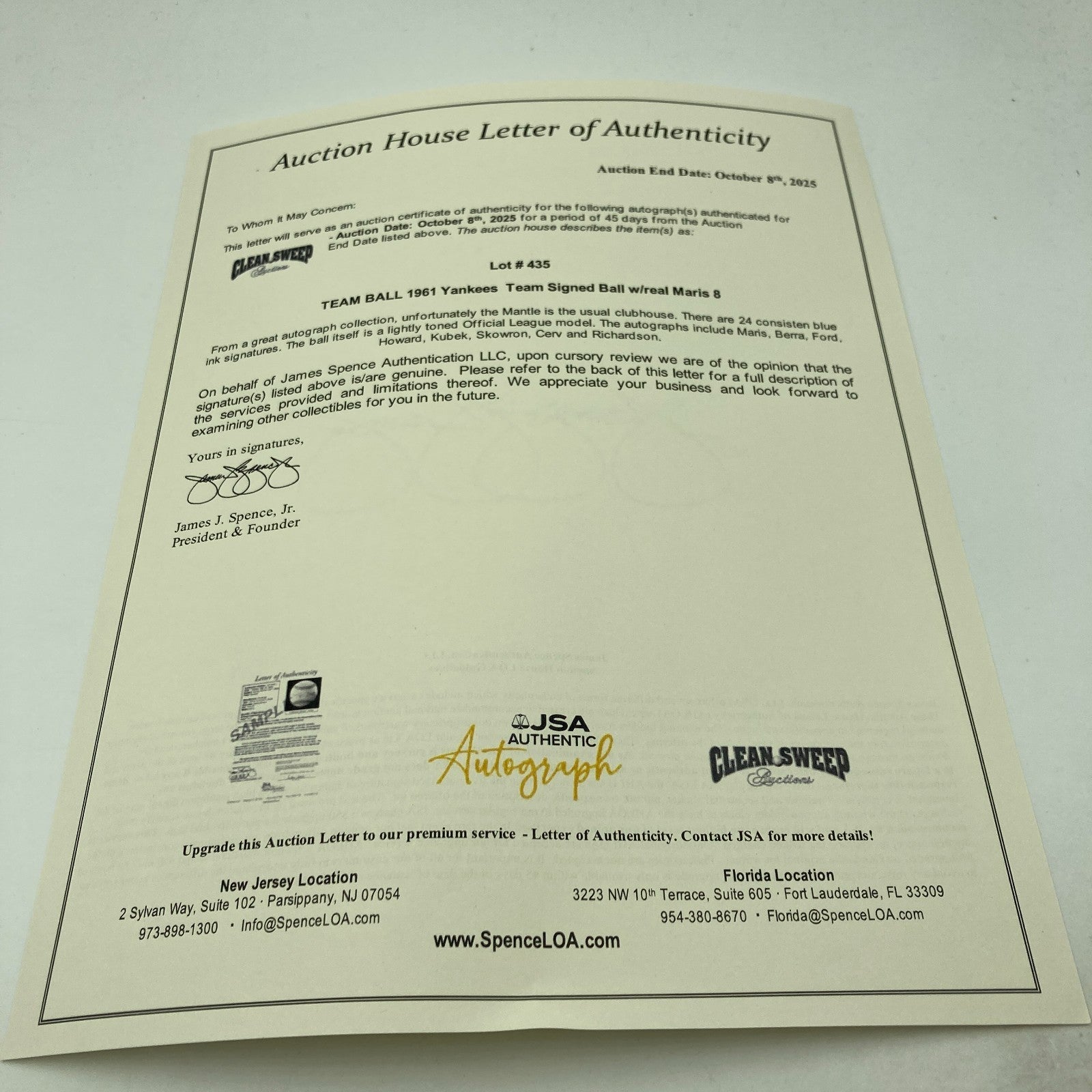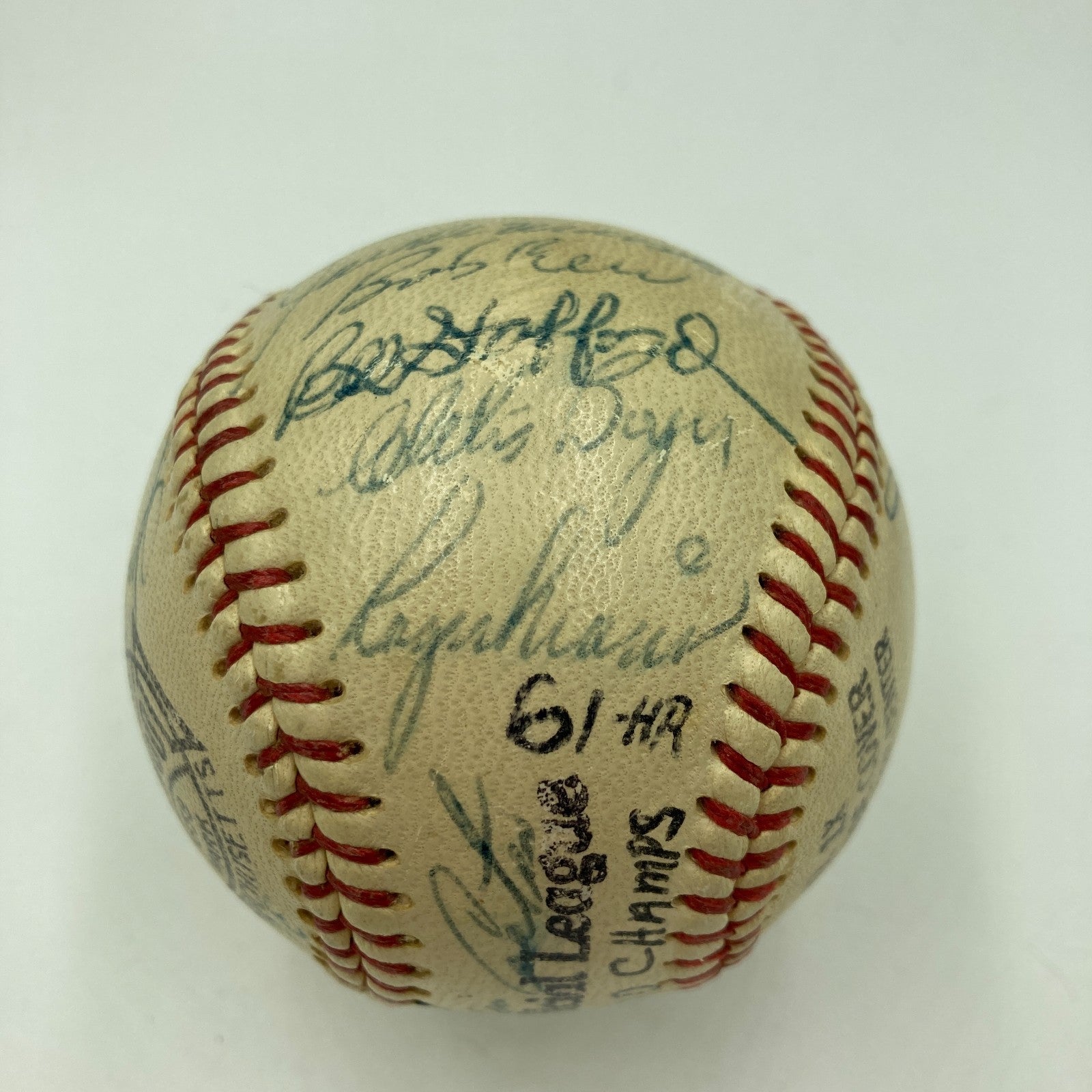 There are 24 consisten blue ink signatures. The ball itself is a lightly toned Official League model. The autographs include Maris, Berra, Ford, Howard, Kubek, Skowron, Cerv and Richardson. Mantle is clubhouse. Comes with JSA Auction LOA.