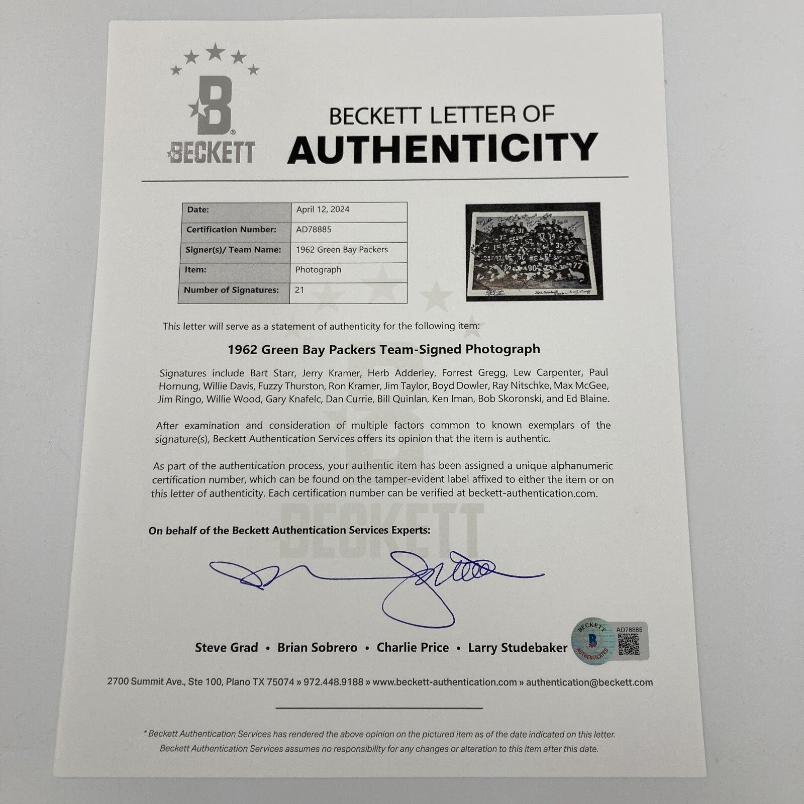 1962 Green Bay Packers Multi-Signed Oversized Goof Around Team Photograph. The 1962 Green Bay Packers clinched the NFL Championship with a dominant season, showcasing their prowess by defeating the New York Giants 16-7 in the title game. Under Vince Lombardi's leadership, their formidable defense and strategic offense solidified their legacy as one of the NFL's greatest teams. Here we present a charming "goof around" 17.5x23" photograph signed by a nice number of players from Packers '62 roster. Signed in bold sharpie, it includes signatures from: McGee, Skoronski, Nitschke, Dowler, Taylor, Ron Kramer, Thurston, Davis, Hornung, Currie, Gregg, Bart Starr, Jerry Kramer, Adderley and others. Full LOA from Beckett Authentication Services.