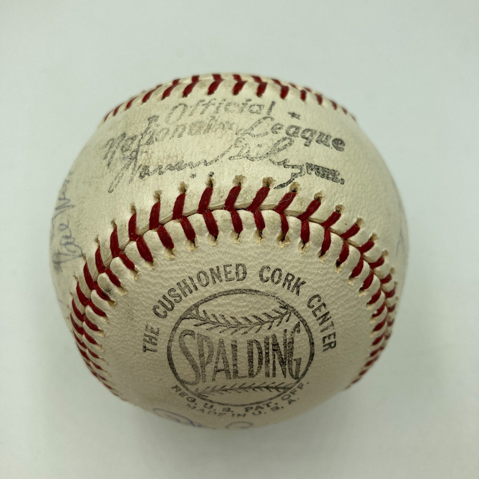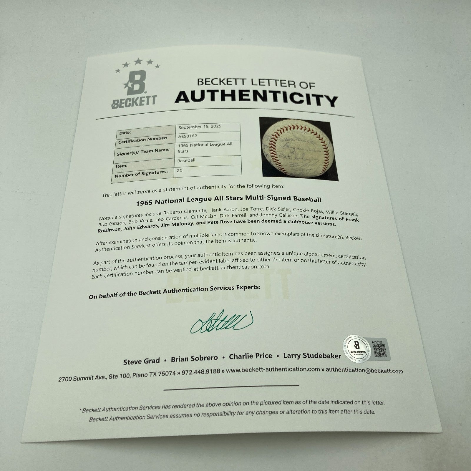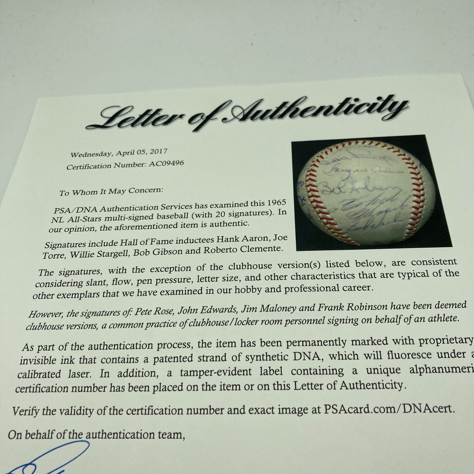Official National League (Giles) baseball is signed by twenty National League All-Stars, including Hall of Famers, Roberto Clemente, Hank Aaron, Willie Stargell, Bob Gibson, and Joe Torre. Frank Robinson, John Edwards, Jim Maloney and Pete Rose are clubhouse. Full LOA from PSA/DNA. Full LOA from Beckett Authentication Services.