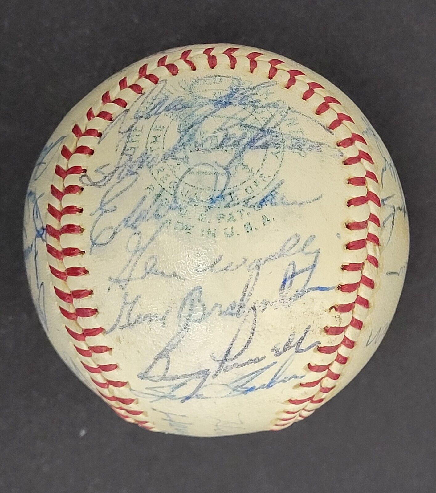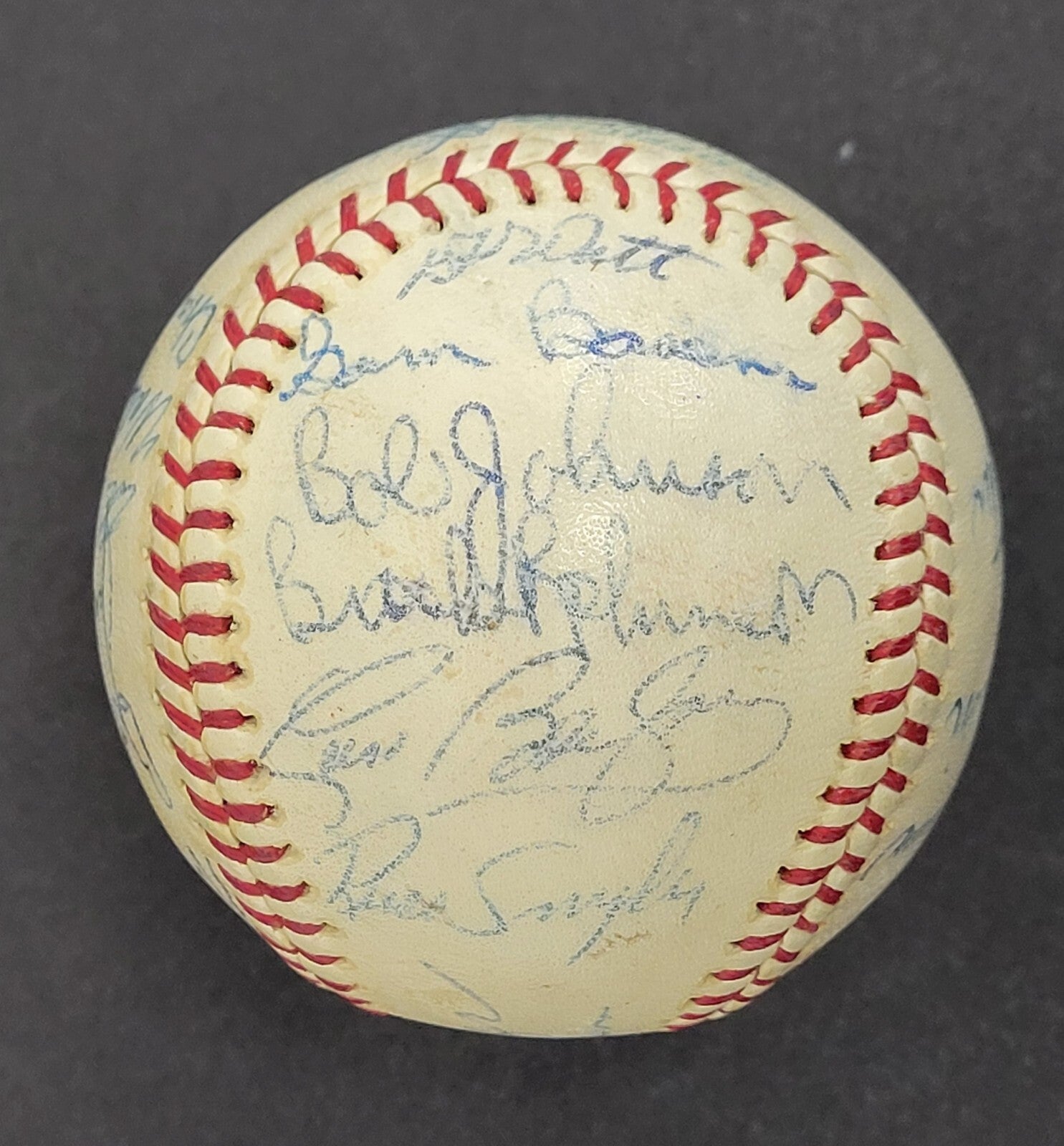 1966 Baltimore Orioles World Series Champions team signed baseball. Official American League Joe Cronin baseball signed by 27 members of the Orioles Championship team including Brooks Robinson, Frank Robinson, Boog Powell, Hank Bauer and Paul Blair among others. Accompanied by a JSA Letter of Authenticity.