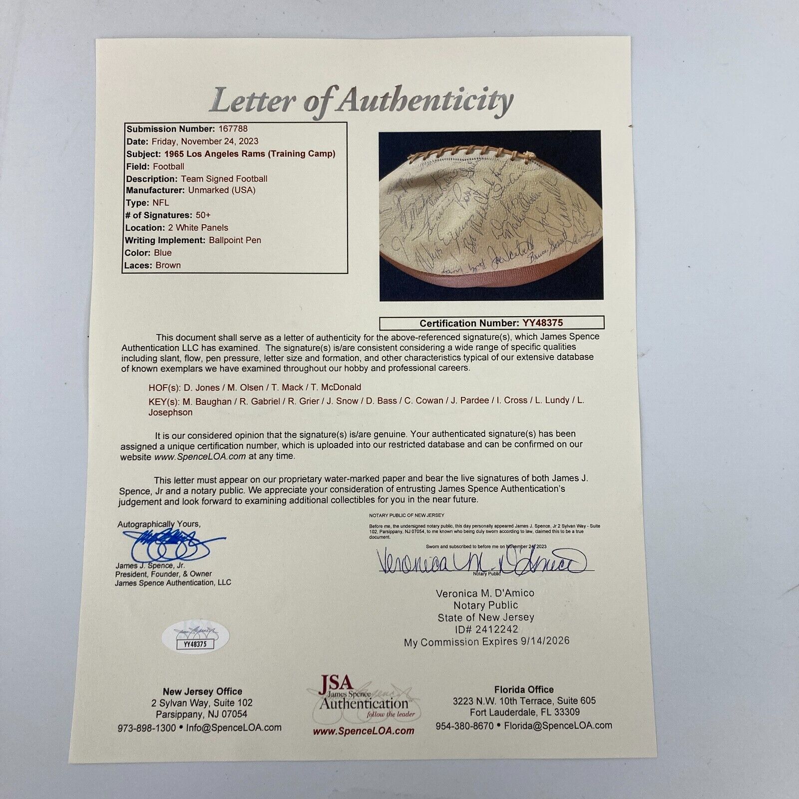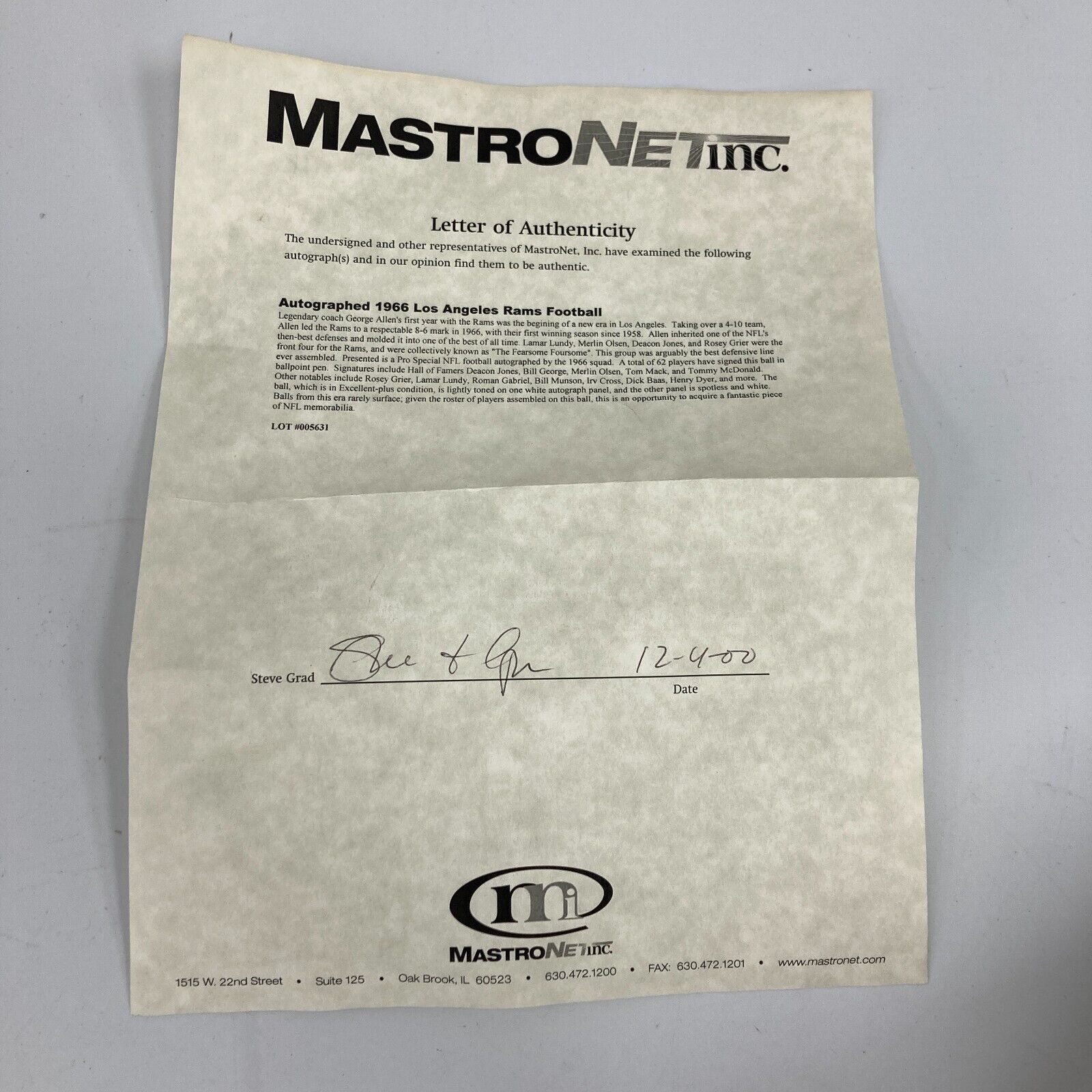 First year head coach George Allen took over the Los Angeles Rams in 1966, and put an end to a long string of losing seasons. During Allen's five years at the helm in LA, the Rams had winning records every season, including two first place finishes. A big part of the success, was the "Fearsome Foursome" defensive line unit of "Deacon" Jones, Merlin Olsen, Lamar Lundy, and "Rosey" Grier, who have all contributed autographs to the offered 1966 Rams team-signed football. Constructed with two white panels and two brown panels, this NFL Pro Special ball hosts a total of (57) autographs including (5) Hall of Famers. All autographs are located on the two white panels, with one panel presenting as bright white, while the other is moderately toned.