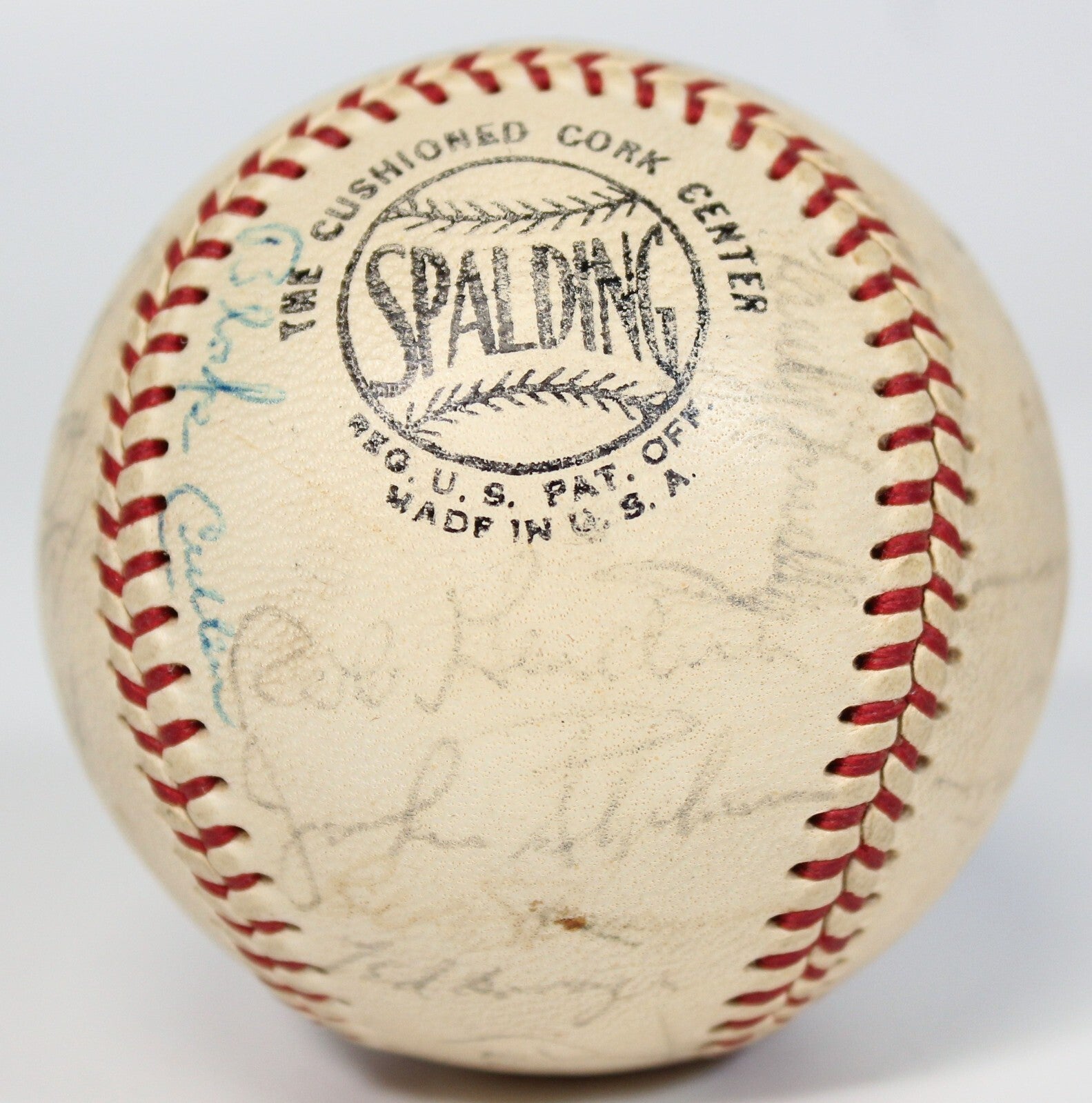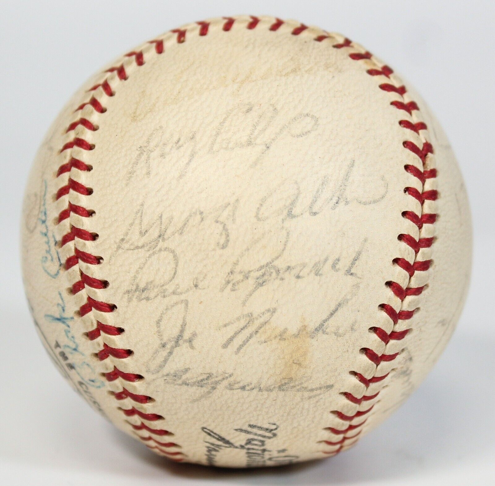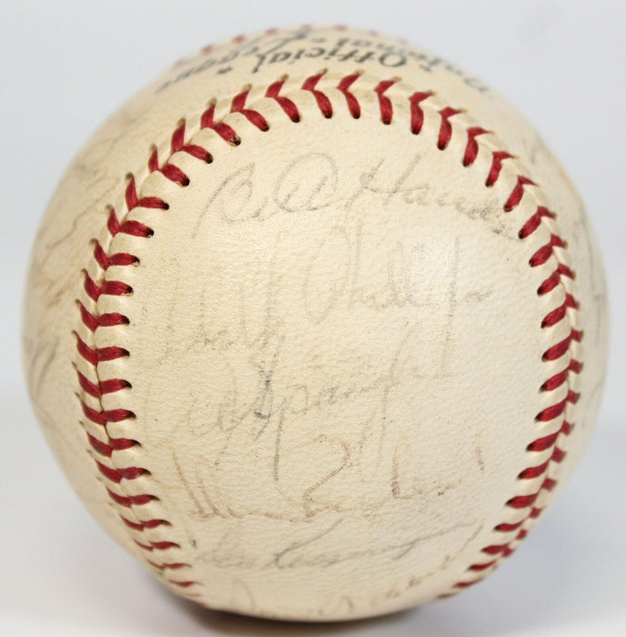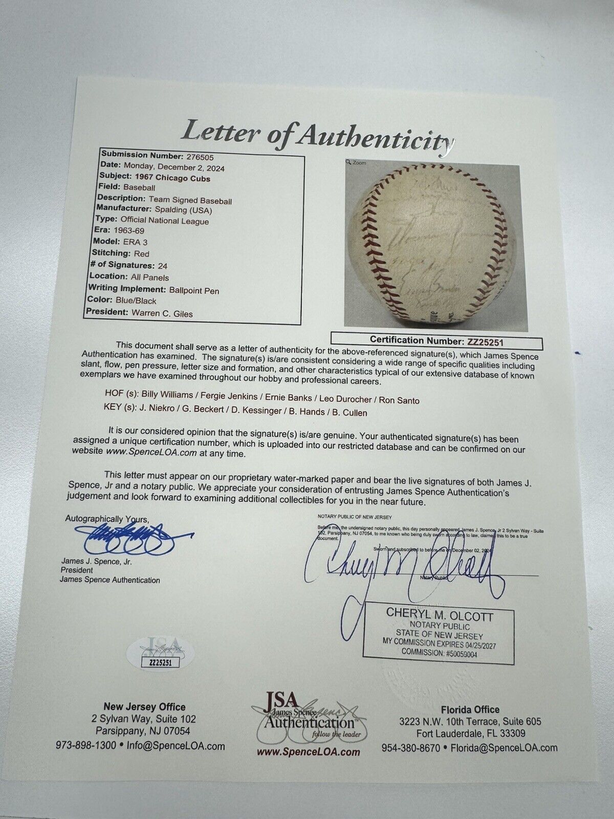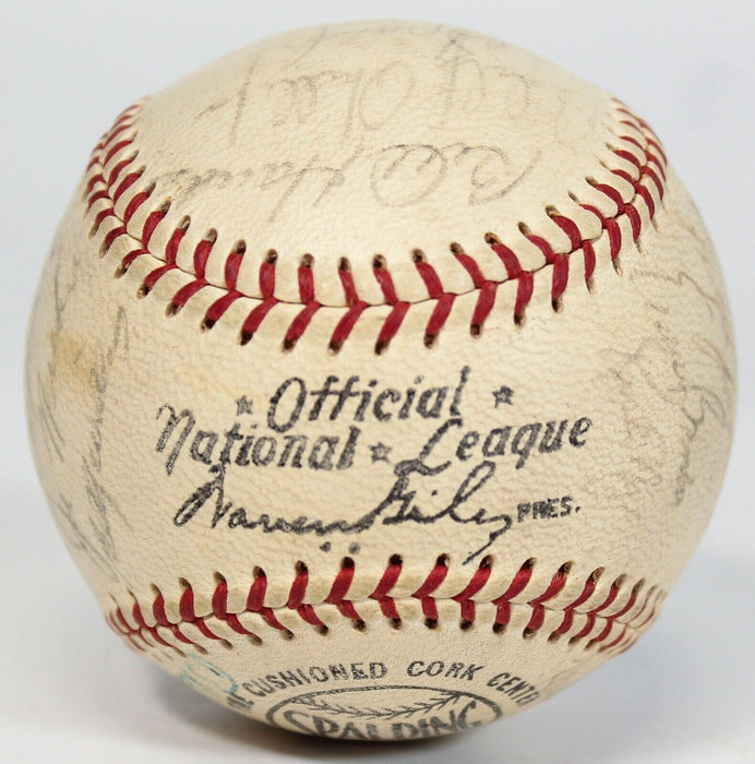 Spalding Official NL (Giles) baseball, signed by 24 members of the 1967 Chicago Cubs. The signatures are faded, but largely legible, and include Bill Hands, Adolfo Phillips, Billy Williams (HOF), Ron Santo (HOF), Fergie Jenkins (HOF), Ernie Banks (HOF), Al Spangler, Glenn Beckert, Leo Durocher (HOF), Don Kissinger, Randy Hundley, Ted Savage, Rich Nye, Lee Thomas, Chuck Hartenstein, Joe Niekro, Ray Culp, Paul Popovich, Ron Gardner, Jim Stephenson, Joe Amalfitano, George Altman, Pete Mikkelsen, and Blake Cullen (traveling secretary). Full LOA from James Spence Authentication.