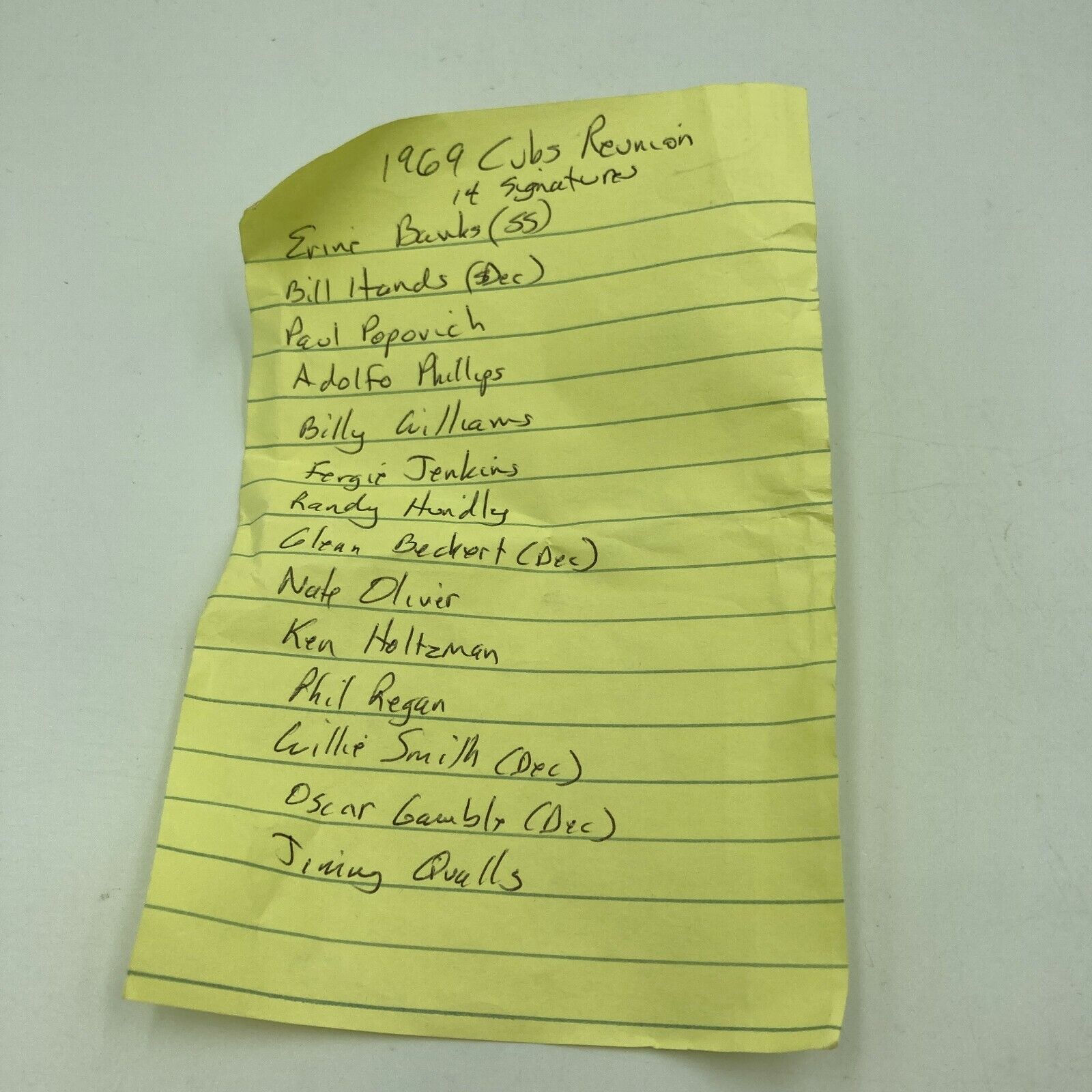 Chicago Cubs 1969 team signed reunion baseball with 14 signatures including: Billy Williams, Ernie Banks, Fergie Jenkins and Ron Santo among others. Full letter JSA COA.