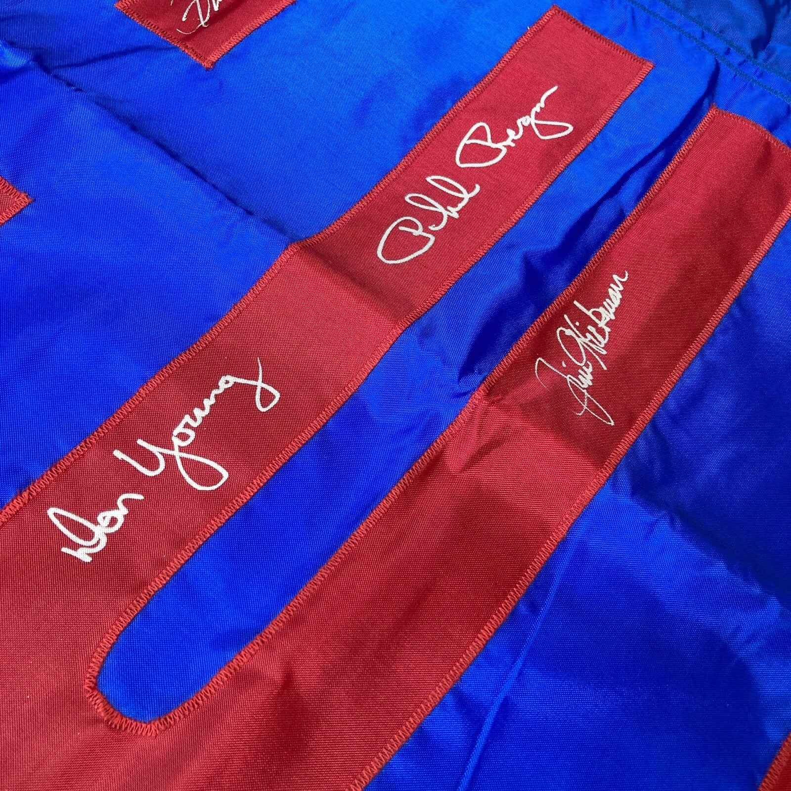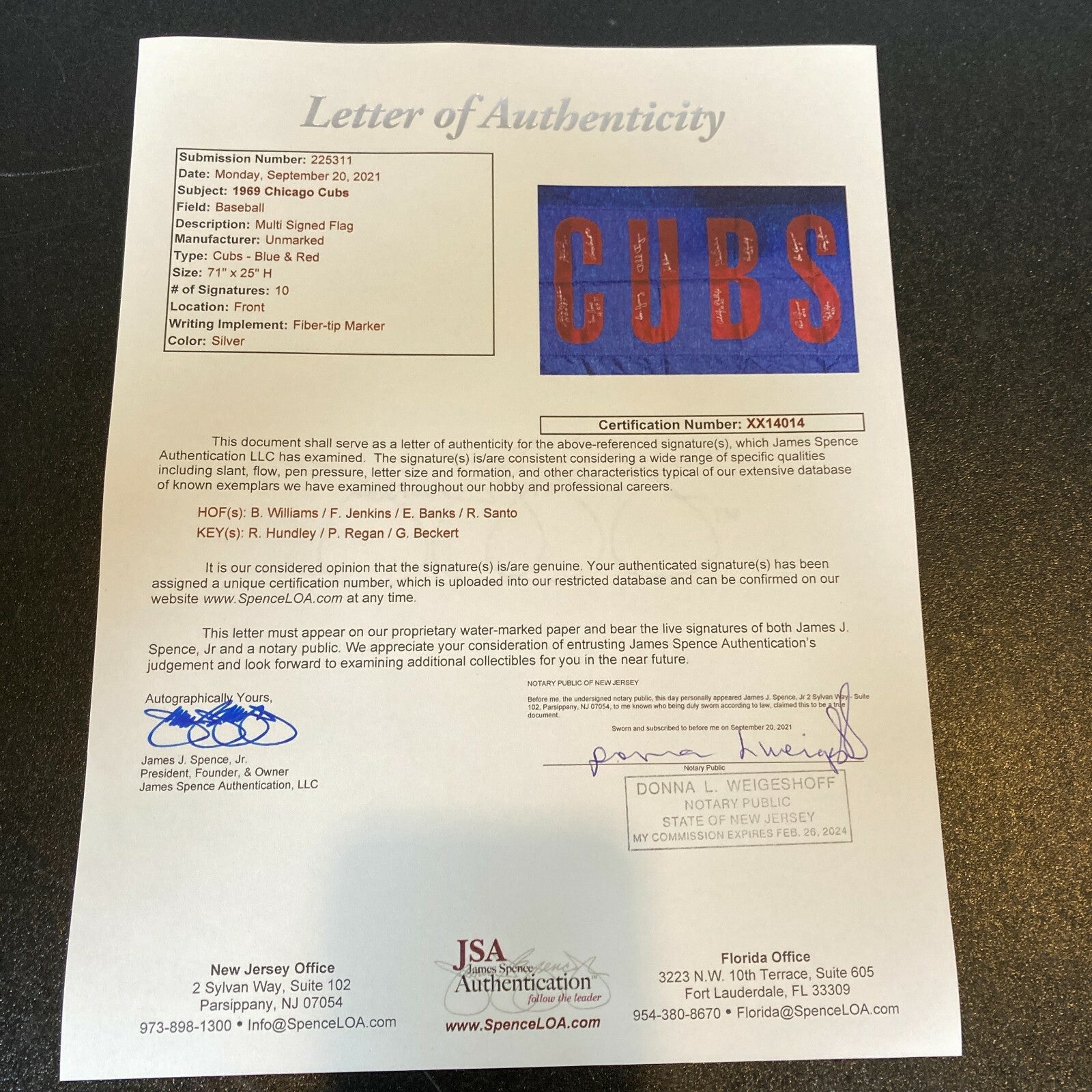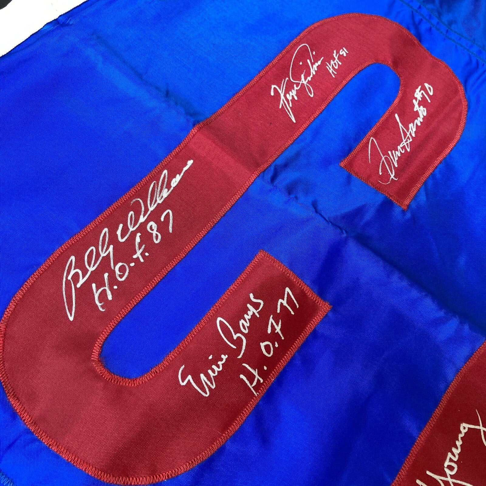 Huge Original 30" x 69" Cubs Wrigley Field stadium flag which has been signed in silver marker on one side by 13 players including Ron Santo, Fergie Jenkins, Billy Williams, Ernie Banks, Don Young, Phil Regan, Jim Hickman, Adolfo Phillips, Glenn Beckert, Randy Hundley, Paul Popovich, Rich Nye, Don Kessinger and Gene Oliver. I believe this flag was actually flown at Wrigley Field. Comes with full letter JSA COA.