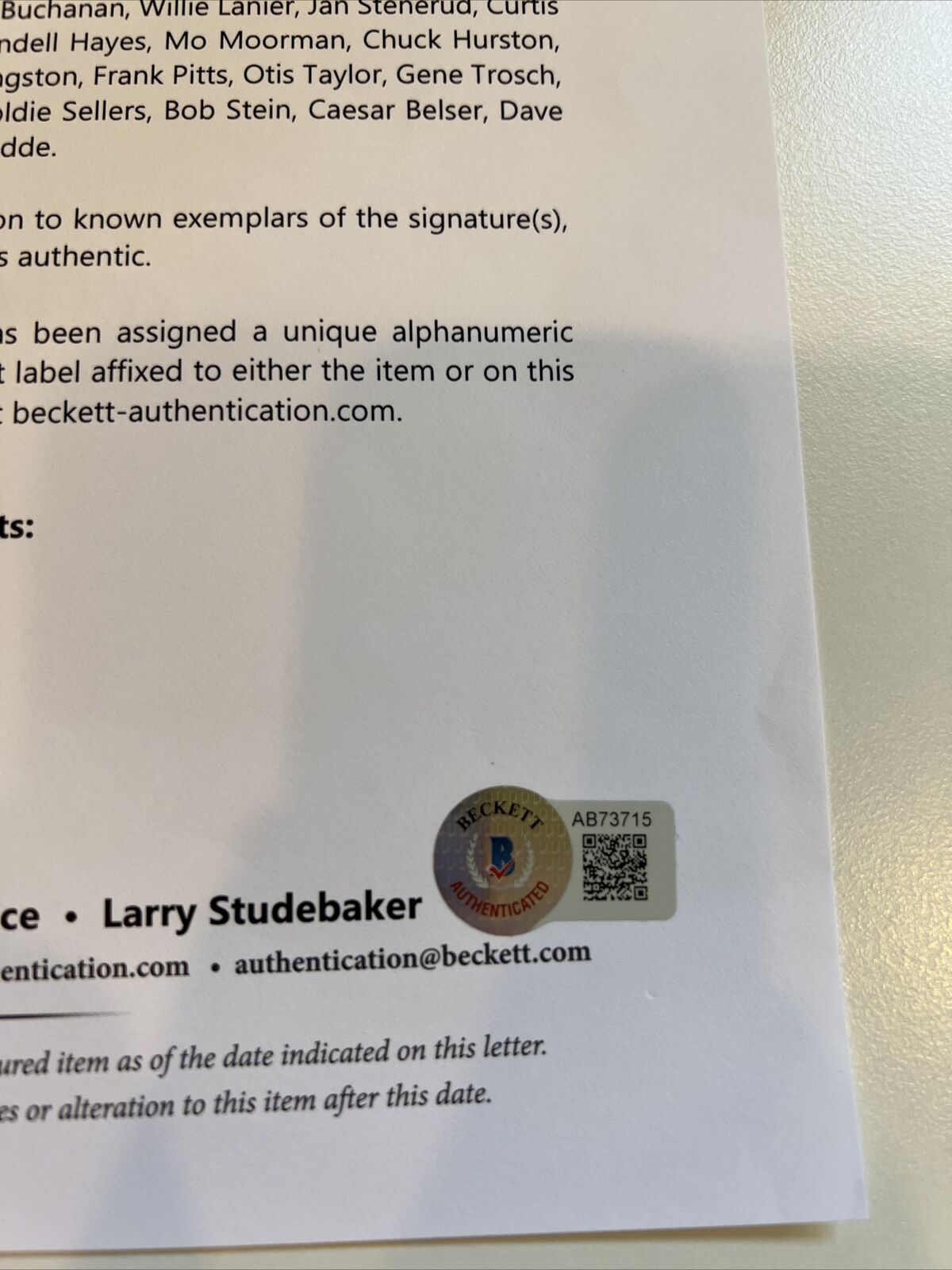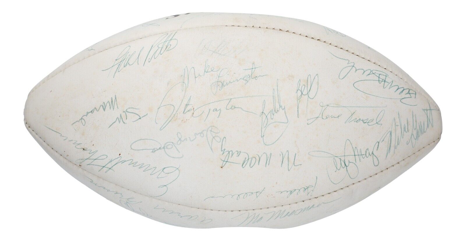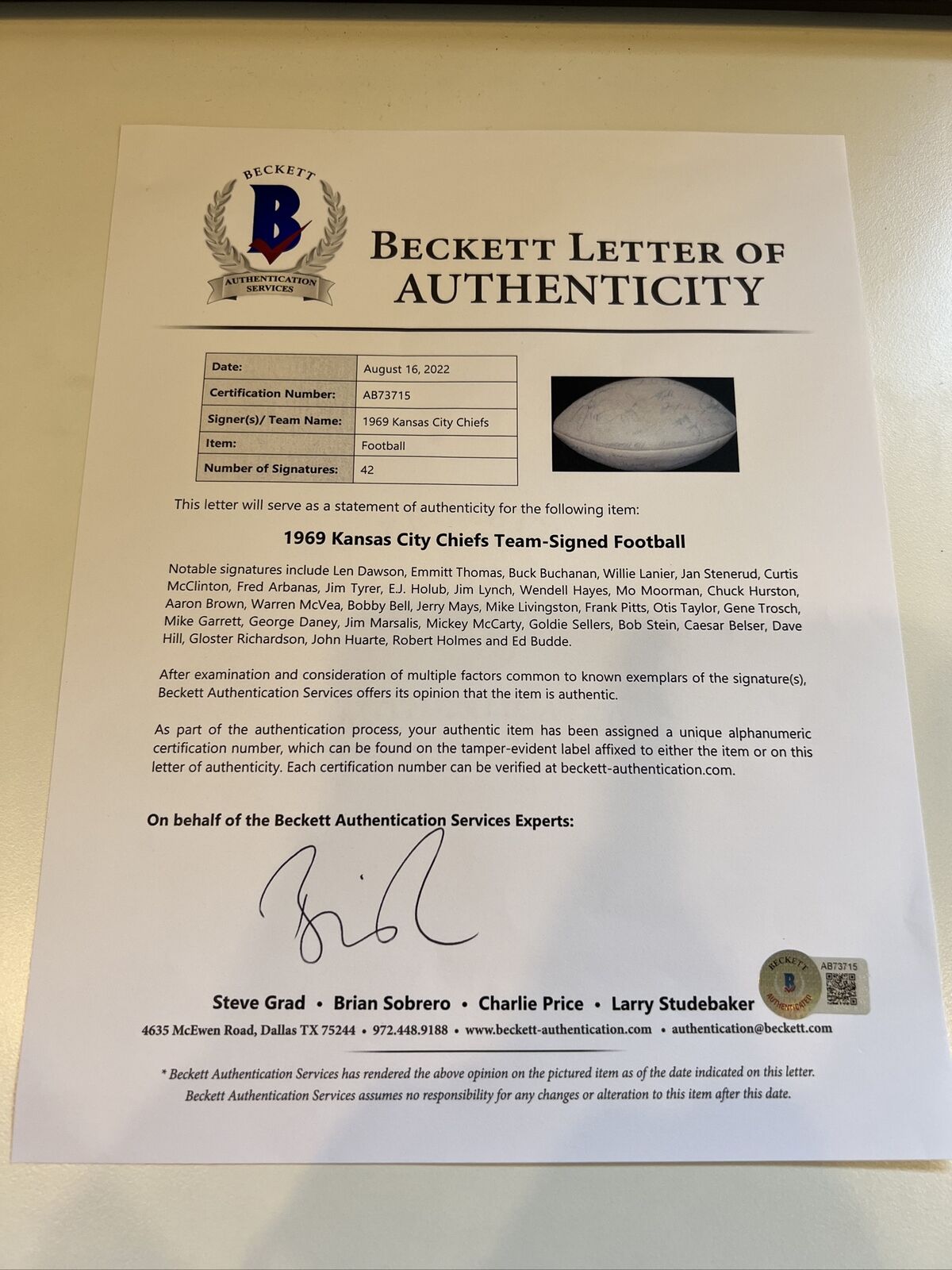 Presented is a Spalding period football with three white panels that have been signed by 42 members of the Super Bowl IV winning Kansas City Chiefs. All of the signatures have been signed in blue and include Hall of Famers Len Dawson, Emmitt Thomas, Buck Buchanan, Willie Lanier, Jan Stenerud, and Bobby Bell. Other signatures include Curtis McClinton, Fred Arbanas, Jim Tyrer, EJ Holub, Jim Lynch, Wendell Hayes, Mo Moorman, Chuck Hurston, Aaron Brown, Warren McVea, Jerry Mays, Mike Livingston, Frank Pitts, Otis Taylor, Gene Trosch, Mike Garrett, George Daney, Jim Marsalis, Mickey McCarty, Goldie Sellers, Bob Stein, Caesar Belser, Dave Hill, Gloster Richardson, John Huarte, Robert Holmes, Ed Budde, and others. This multi-signed football comes with a LOA from Beckett Authentication.