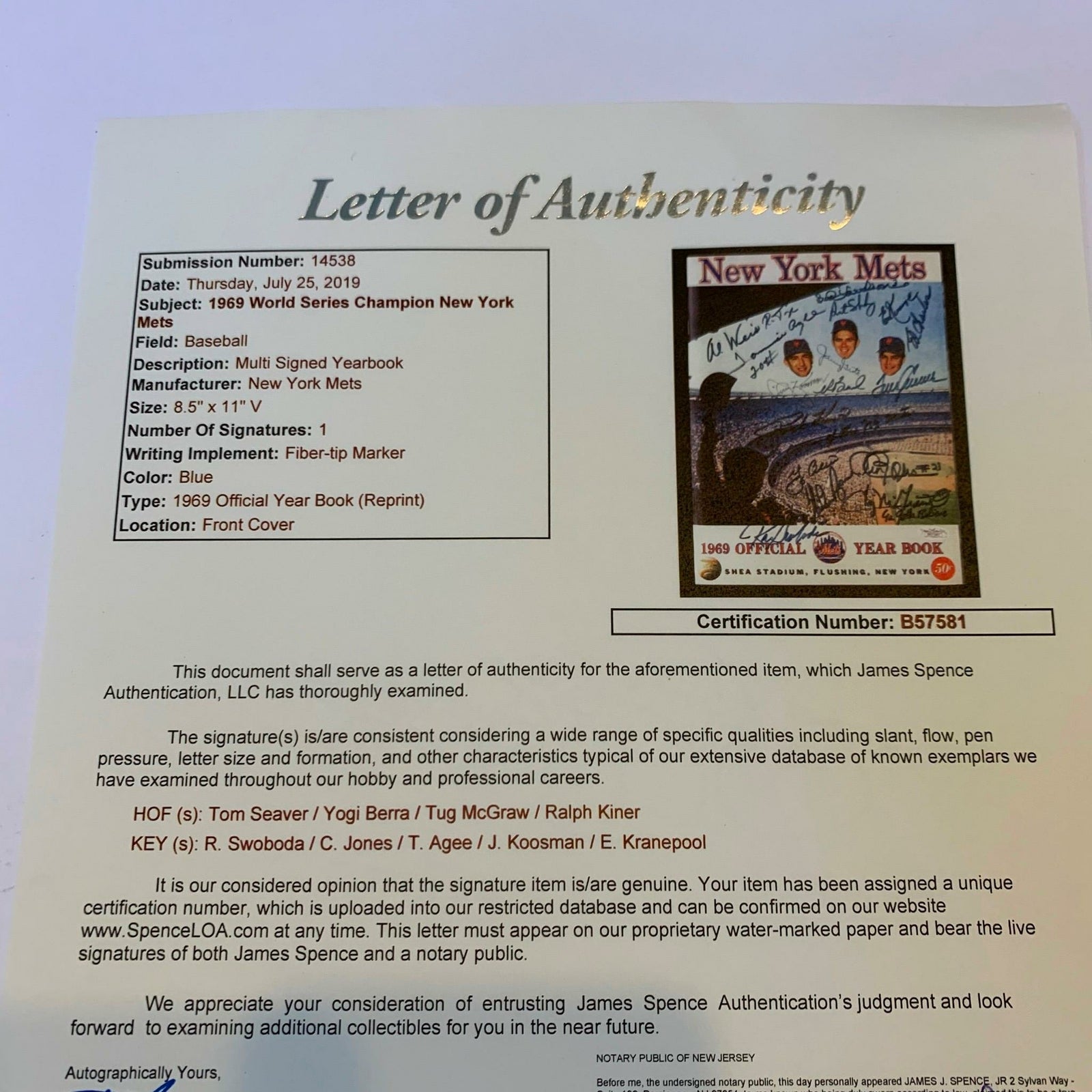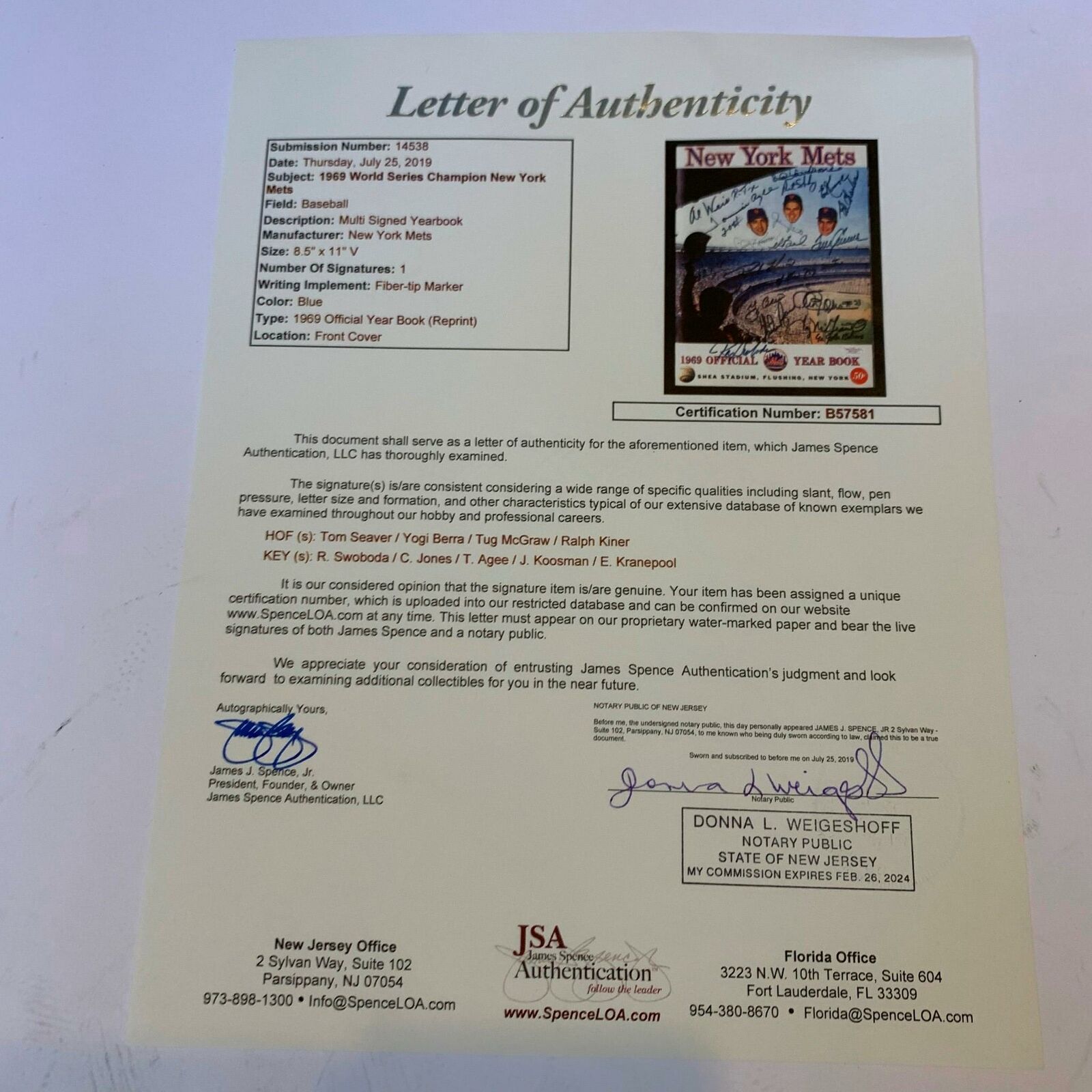 1969 Yearbook: Signed on the front cover in blue marker by: Agee (inscribed “20#”), Berra (coach), Boswell, Charles, Gentry, Grote, Harrelson, Jones (inscribed “#21”), Kiner (inscribed “The voice of the NY Mets”), Koosman, Kranepool, McGraw (inscribed “Ya Gotta Believe”), Nolan Ryan, Tom Seaver, Shamsky, Swoboda, Taylor and Weis. Accompanying is a full photo LOA from JSA.