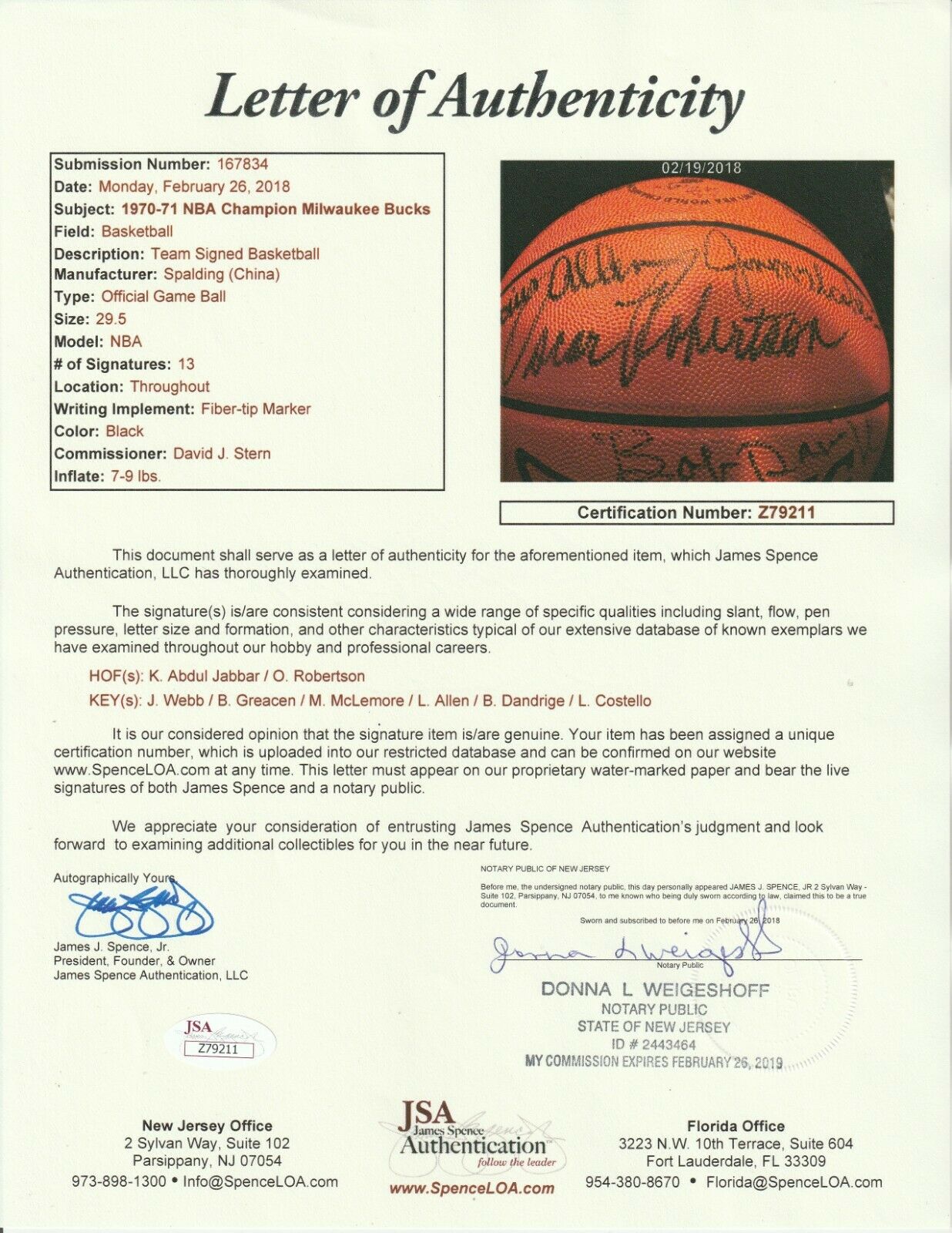 Offered is a 1970-1971 National Basketball Association Champion Milwaukee Bucks team-signed Spalding Official NBA David J. Stern basketball with 13 signatures, including Kareem Abdul-Jabbar and Oscar Robertson. The signatures are in black marker on the orange pebbled leather basketball embossed in black with the legend “1970-1971 NBA World Champions Milwaukee Bucks” over the Bucks logo. The Hall of Fame center who played as “Lew Alcindor” in the ’70-71 season has signed his name “Abdul Jabbar”. Other notable signatures include Robertson, Lucius Allen, Jon McGlocklin, Bob Dandridge, Jeff Webb, Greg Smith, Bob Boozer, Bob Greacen, McCoy McLemore, Dick Cunningham and coach Larry Costello. The 1970–71 Milwaukee Bucks season was the third season for the Bucks, and they posted a 66–16 record A key part of this championship season was the acquisition of Robertson. Other role players on the Bucks included players such as Bob Dandridge (18.4 ppg), Jon McGlocklin (15.8 ppg), power forward Greg Smith and key reserves such as Lucius Allen, Bob Boozer and Dick Cunningham. This season included a 20-game winning streak, the NBA's longest at the time, and still ranked fifth all-time. The Bucks became the first team from the Midwest Division to win the NBA title; it would be 23 years before the Houston Rockets would do the same. Abdul-Jabbar (then Alcindor) was both the regular-season and NBA Finals Most Valuable Player. This item comes with a COA from JSA.