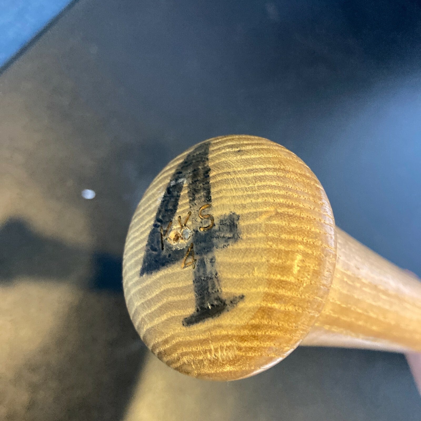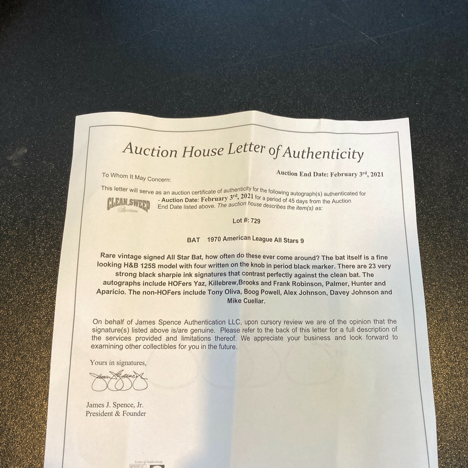 Rare vintage signed All Star Bat. The bat itself is a fine looking H&B 125S model with #4 written on the knob in period black marker. There are 23 very strong black sharpie ink signatures that contrast perfectly against the clean bat. The autographs include HOFers Yaz, Killebrew,Brooks and Frank Robinson, Palmer, Hunter and Aparicio. The non-HOFers include Tony Oliva, Boog Powell, Alex Johnson, Davey Johnson and Mike Cuellar. Comes with JSA COA.