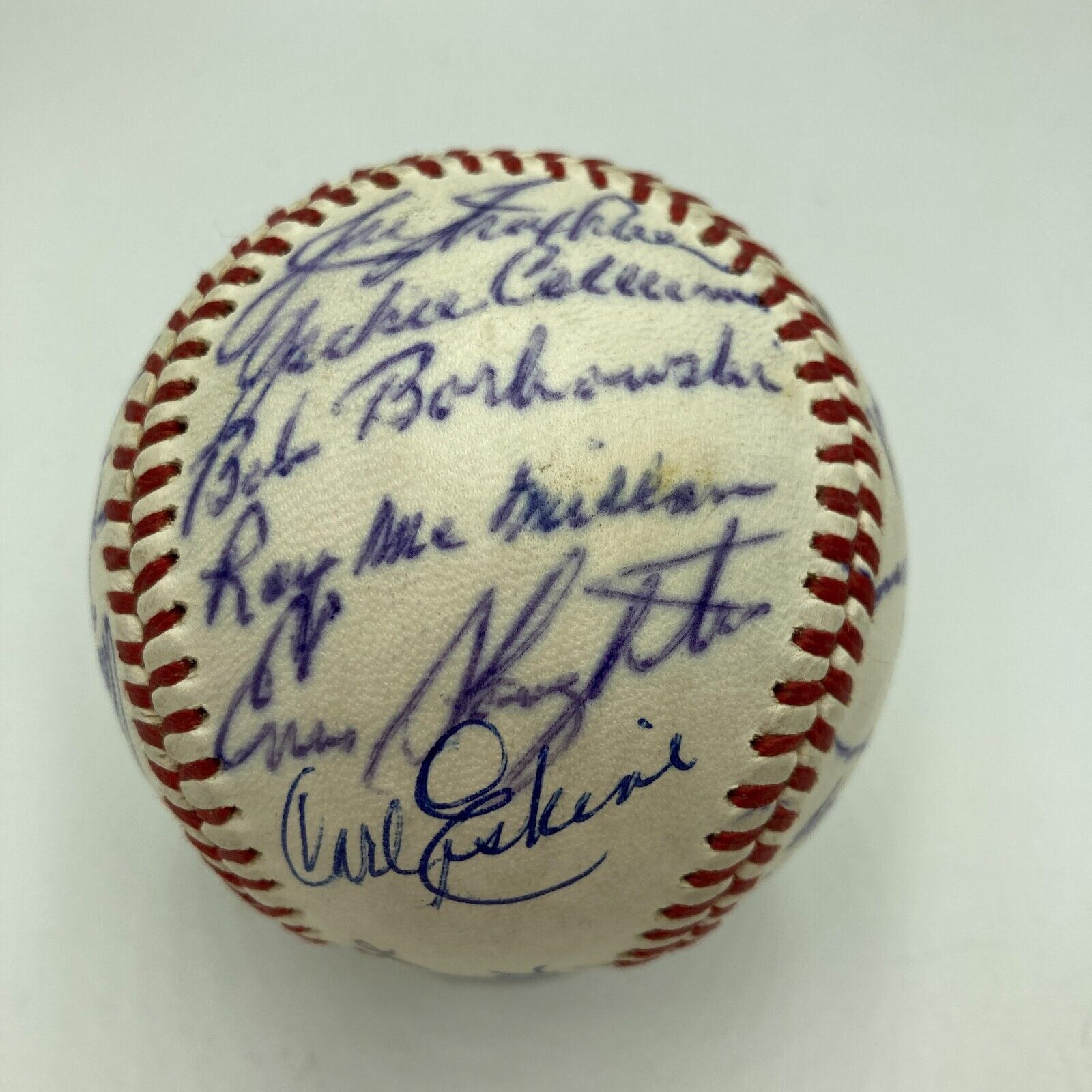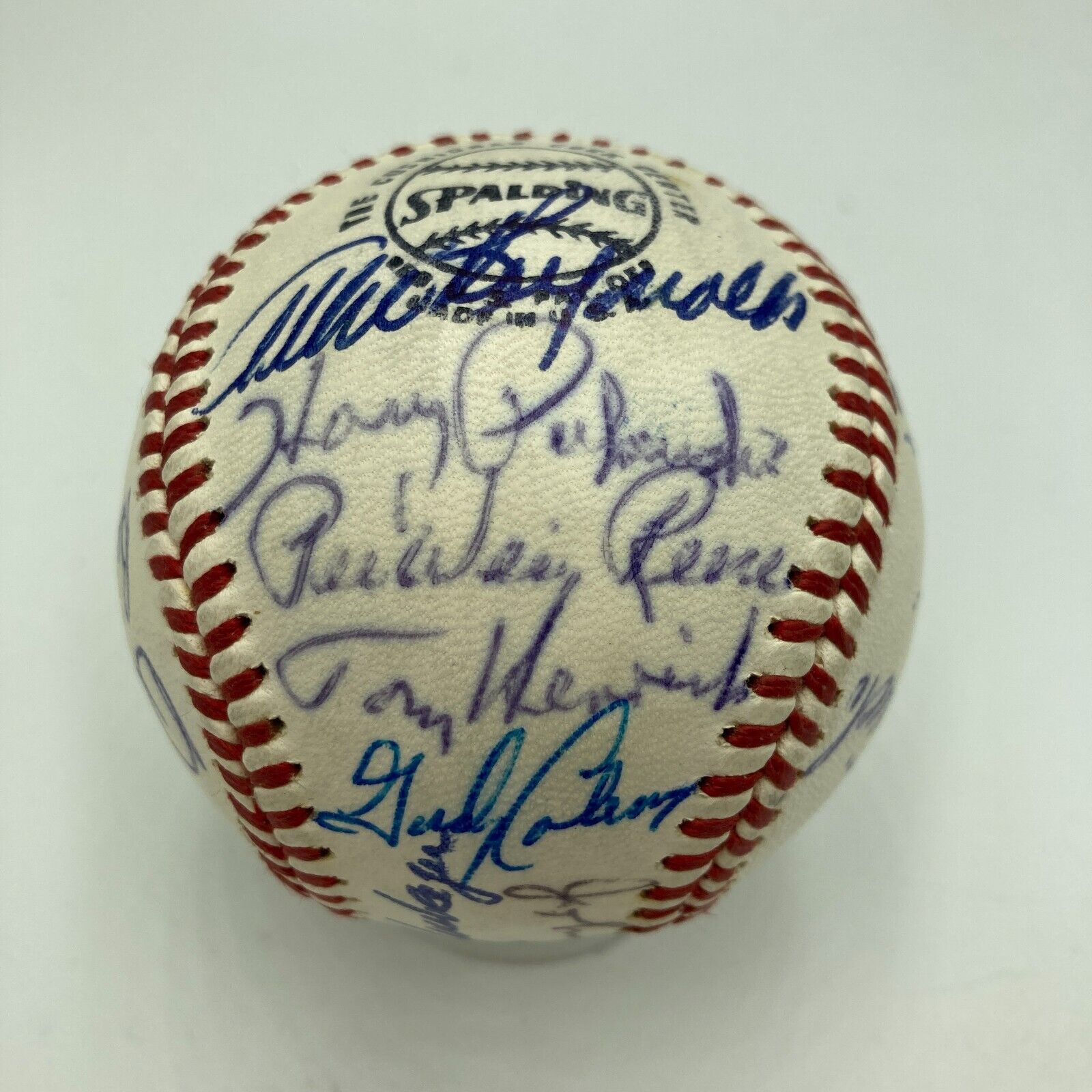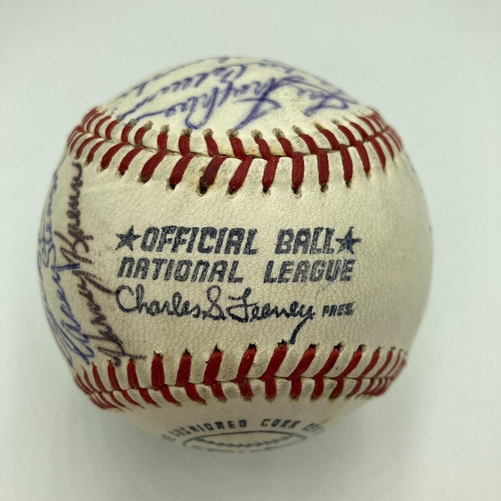 Old Timers Day multi-signed baseball with HOFers, c.early 1970s (EX/MT). C.Feeney NL ball signed by (24) including Casey Stengel, Johnny Mize, Pee Wee Reese, Enos Slaughter, Tom Henrich, Harvey Kuenn, Andy Seminick, Joe Nuxhall, Allie Reynolds, Wes Westrum, Harvey Haddix, Harry Perkowski, Gordy Coleman, Ken Raffensberger, Gus Bell, Bob Borkowski, Roy McMillan, Carl Erskine, Clyde King, Bill Gardner, and others.