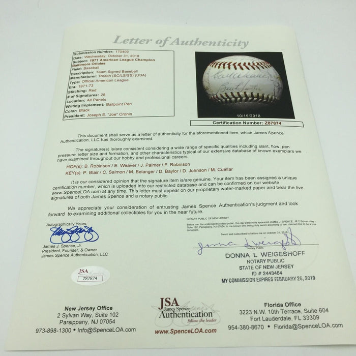1971 Baltimore Orioles American League Champs Team Signed Baseball With JSA COA