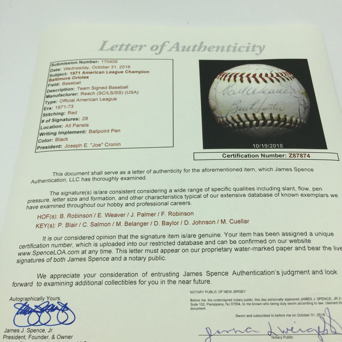 1971 Baltimore Orioles American League Champs Team Signed Official American League Baseball. 28 signatures with Brooks Robinson, Earl Weaver, Jim Palmer, Frank Robinson, Paul Blair, Davey Johnson and many others.