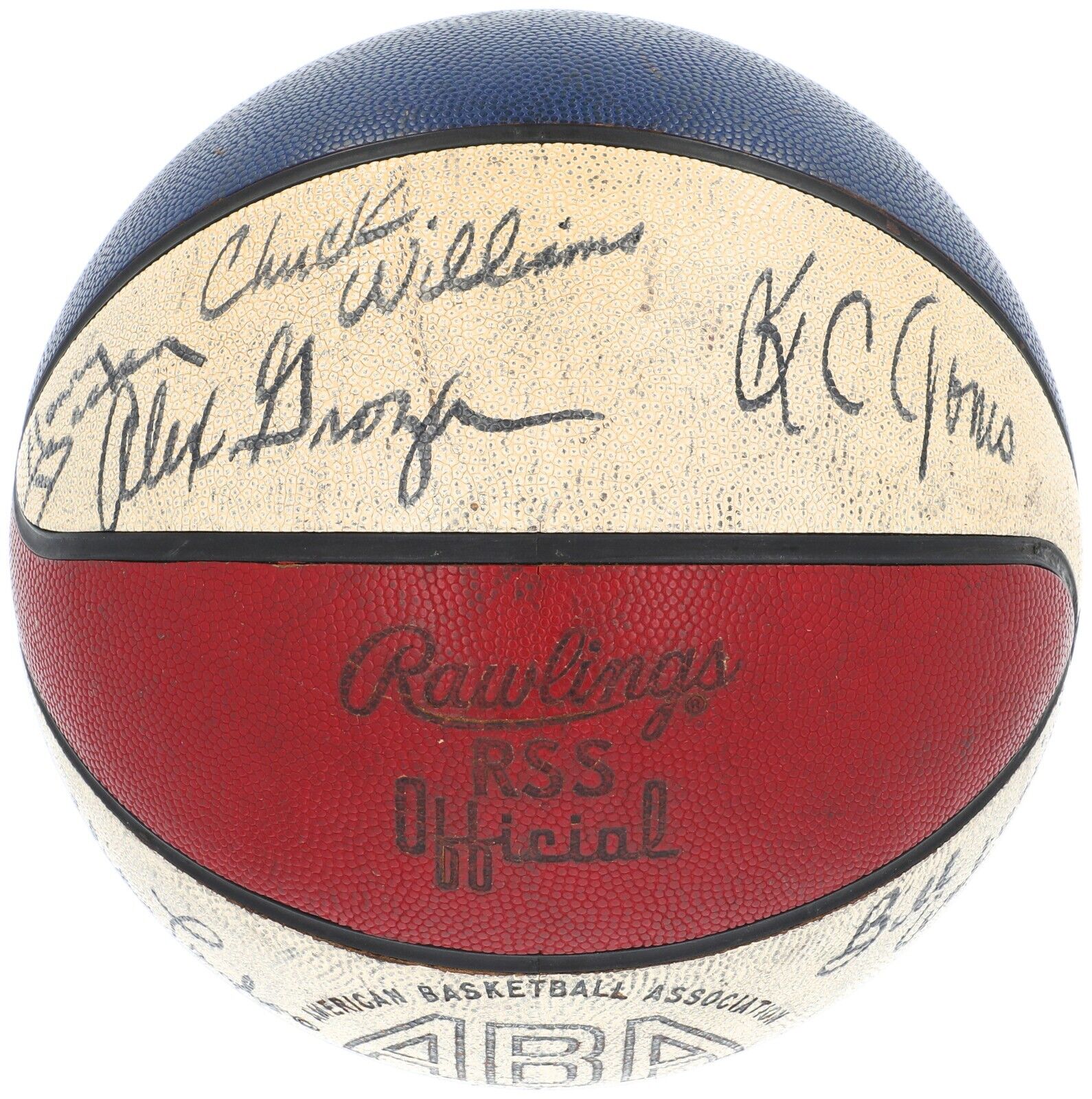 Offered here is a San Diego Conquistadors Team Signed ABA basketball signed by 16 players from the franchise, known as the "Q's." The Leonard Bloom-founded franchise played in the ABA from 1972-75, and an incomplete season as the Sails during 1975-76. The red, white, and blue Official ABA Rawlings basketball is signed in black marker, with key signatures from Bill Antonini, Ollie Taylor, Chuck Williams, Eugene Moore, George Adams, Red Robbins, Larry Miller, Stew Johnson, and Henry Bacon. The ball contains multiple stains, scuffing, and light cracking. It comes with an LOA from JSA for the signatures.