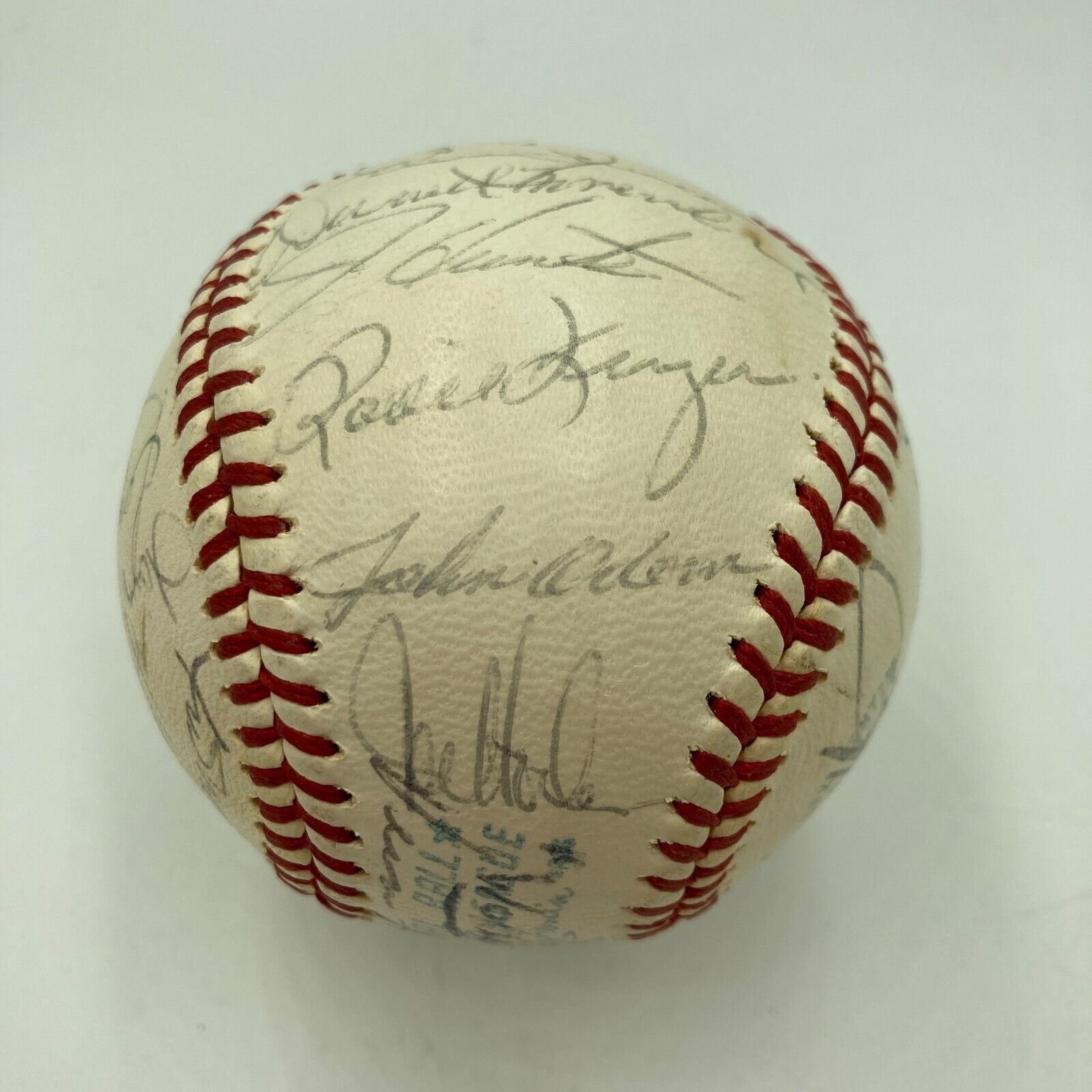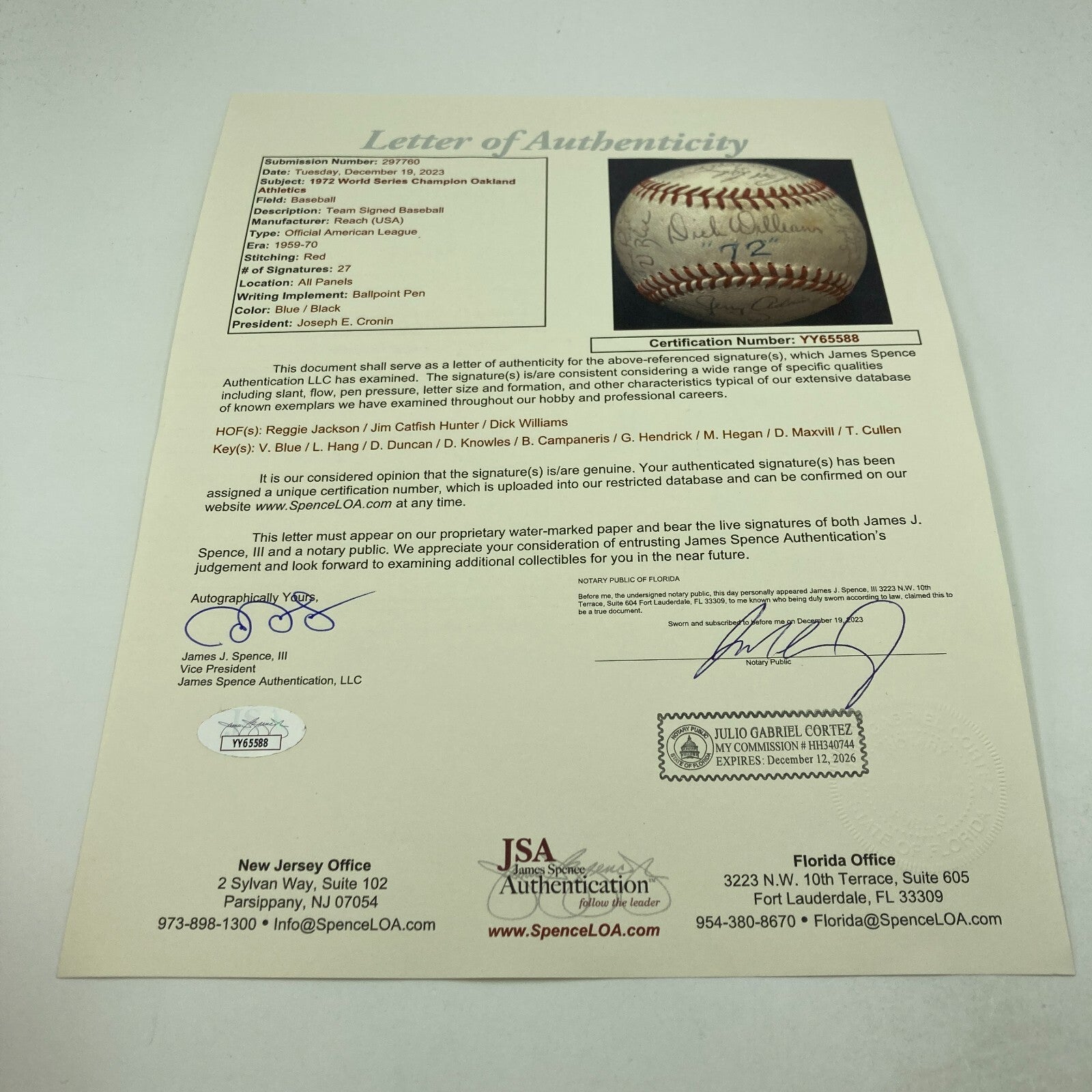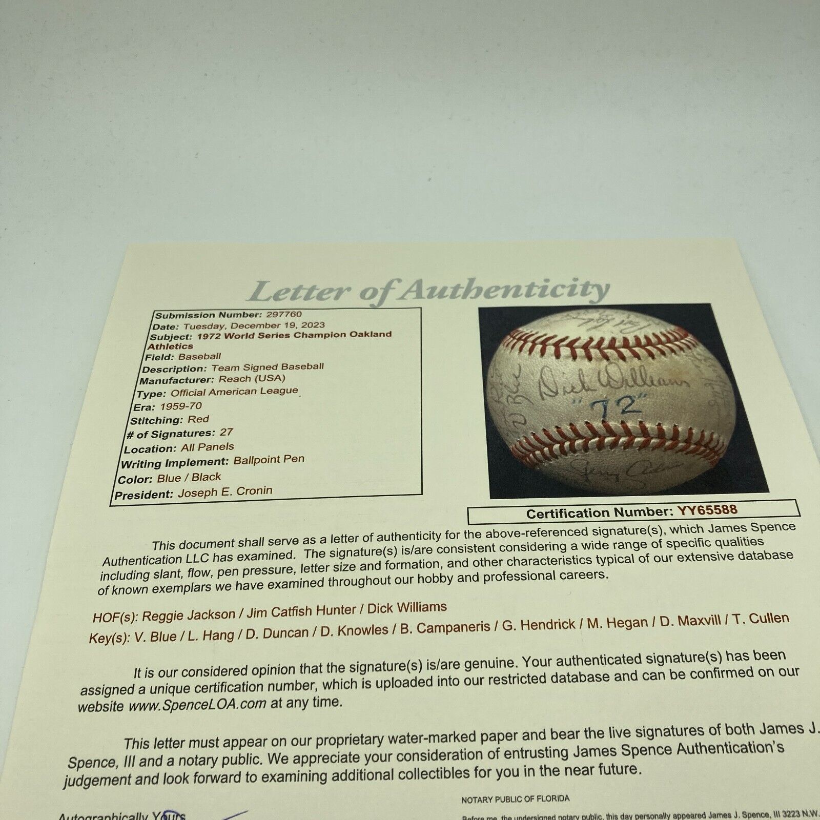 With manager Dick Williams and "72" commanding the sweet spot, this Reach Official American League baseball houses 27 signatures from the World Champion 1972 Oakland Athletics team. Hall of Famers Reggie Jackson and Catfish Hunter have signed the orb, with other key signatures including Blue, Duncan, Knowles, Campanaris, Maxvill, Hegan, and Hendrick. Full letter LOA from JSA.