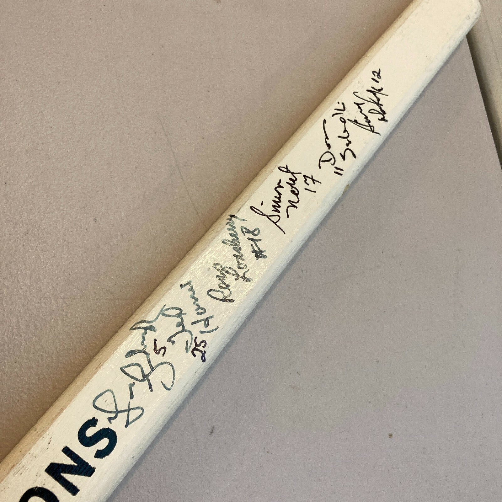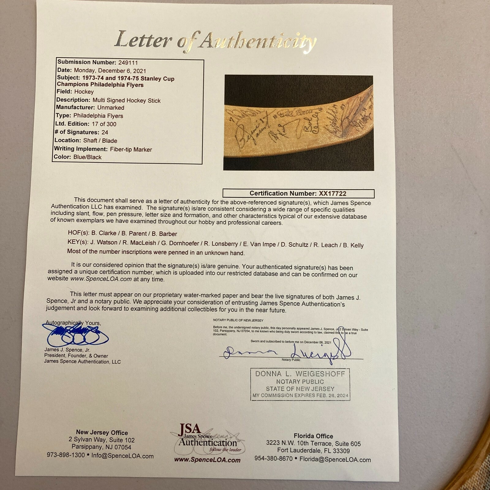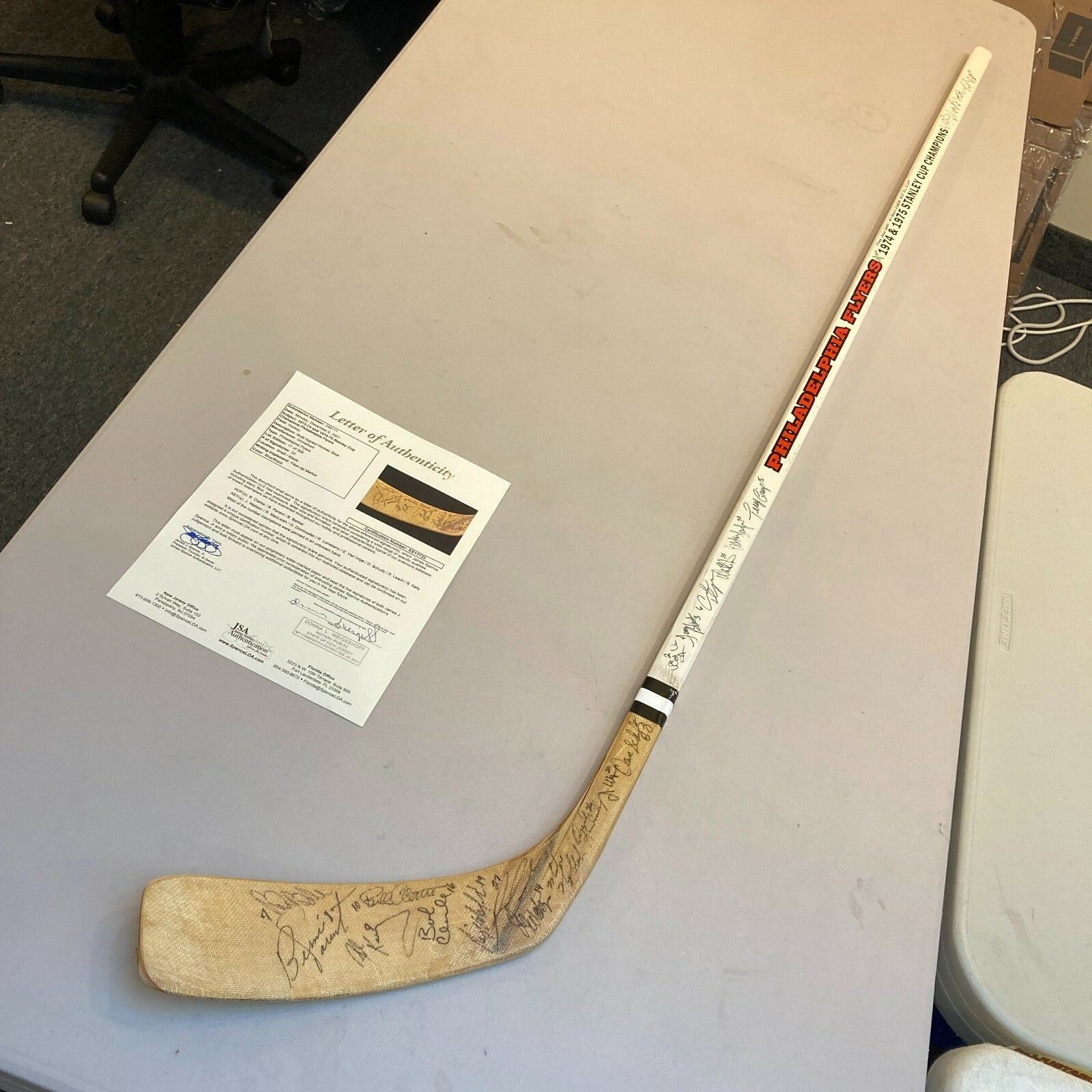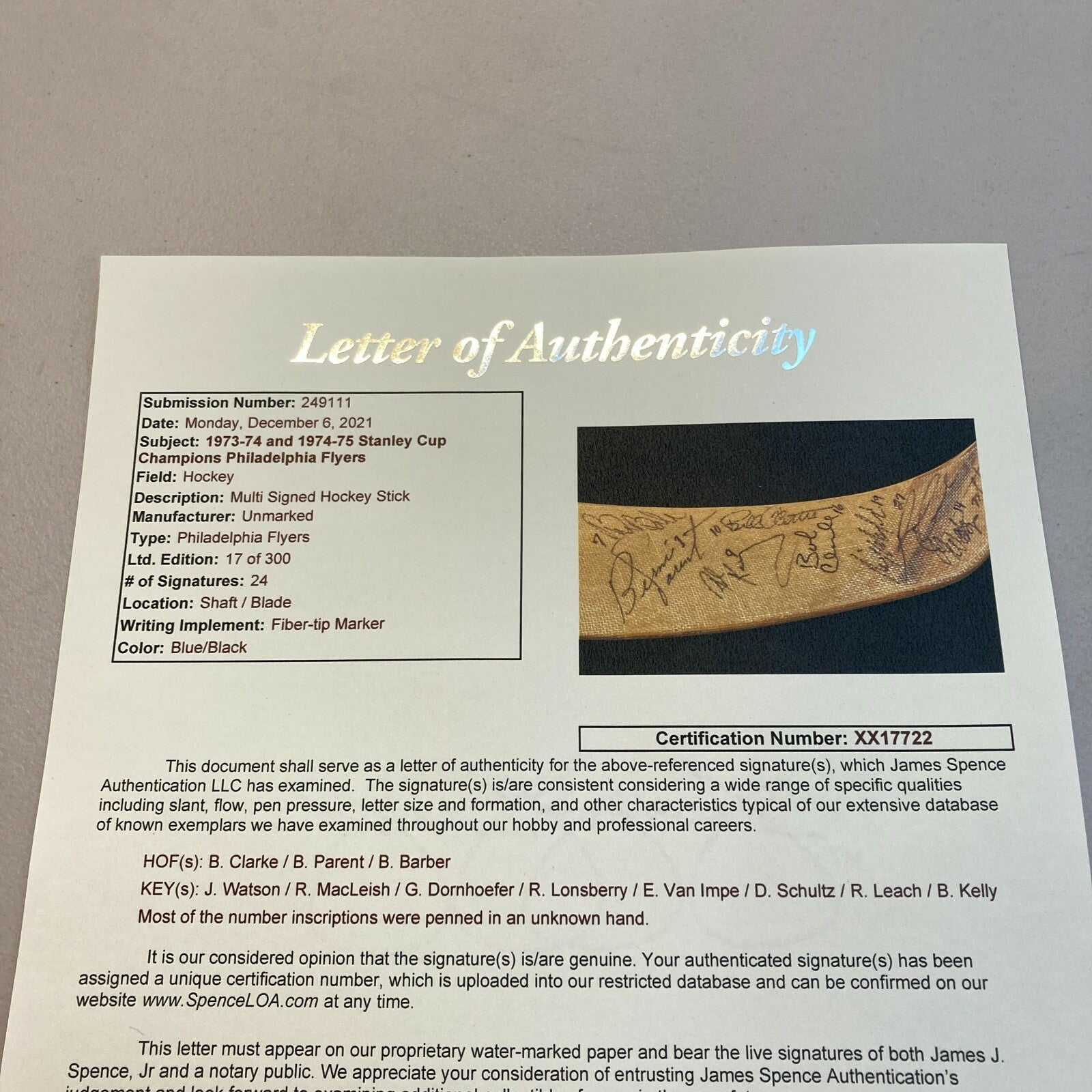 1974-75 Philadelphia Flyers reunion team signed hockey stick. Stanley Cup Champions commemorative stick signed by (24) including Bernie Parent, Bob Clarke, Bill Barber, Reggie Leach, Tom Bladon, Rick MacLeish, Andre Dupont, Jimmy Watson, Ed Van Impe, Joe Watson, Ross Lonsberry, Gary Dornhoefer, Simon Nolet, Dave Schultz, and others.