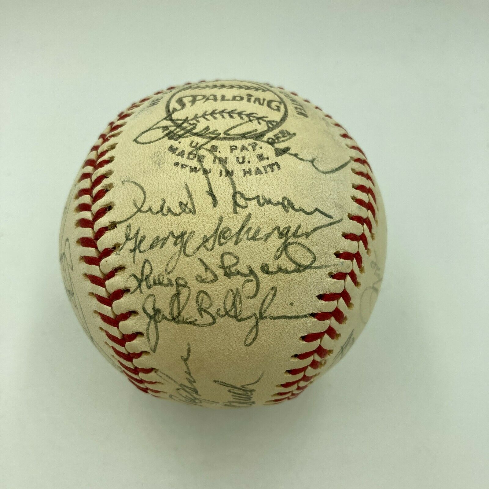 Official National League (Feeney) ball signed in black ink by the following twenty-four members of the 1975 World Seires Champion Cincinnati Reds: Anderson (Mgr., sweet spot), Bench (sweet spot), Morgan, Perez, Rose, Gullett, Armbrister, Foster, Rettenmund, Flynn, Griffey, Chaney, Concepcion, Geronimo, Darcy, Nolan, Norman, Scherger (coach), Sheppard (coach), Billingham, Kluszewski (coach), Plummer, Carroll, and Crowley. The signatures are all fairly uniform in grade, averaging "8," with the exception of Foster and Rose ("5"). The year, "1975," is written in blue ink on the ball label. Near Mint condition. Full LOA from Beckett Authentication