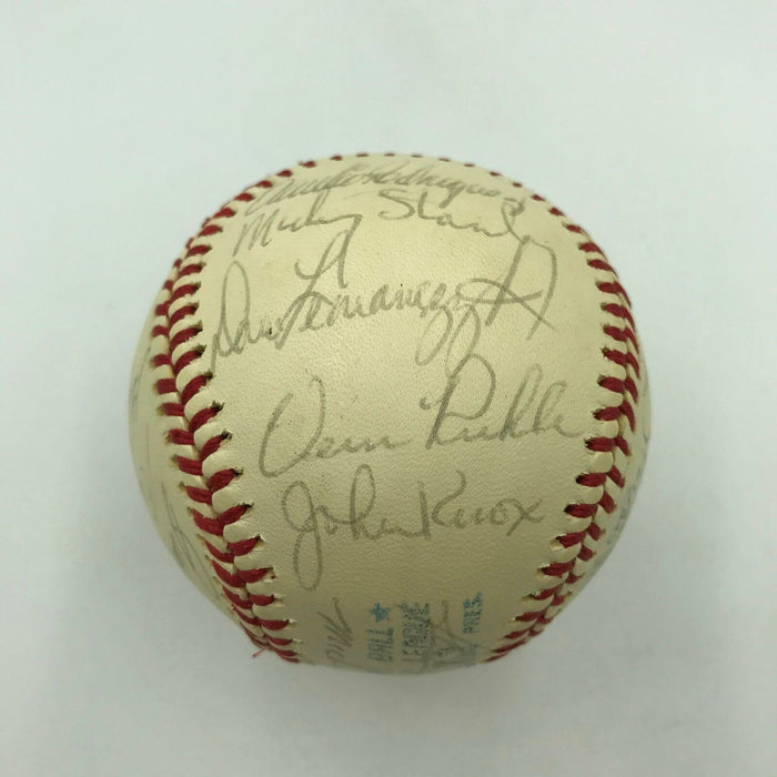 Official American League, Leland S. MacPhail Jr. Baseball. 26 signatures. Includes M. Lolich, S. Hamilton, B. Freehan, R. LeFlore, A. Rodriguez, W. Horton, G. Brown, M. Stanley, and others. Comes with Letter of Authenticity from JSA.