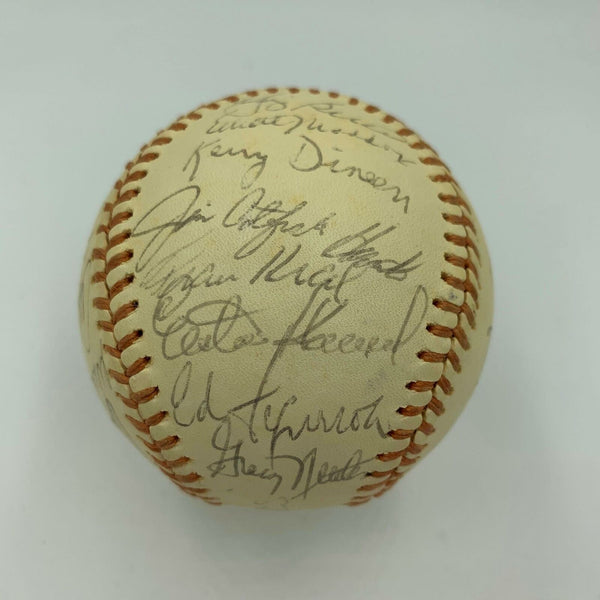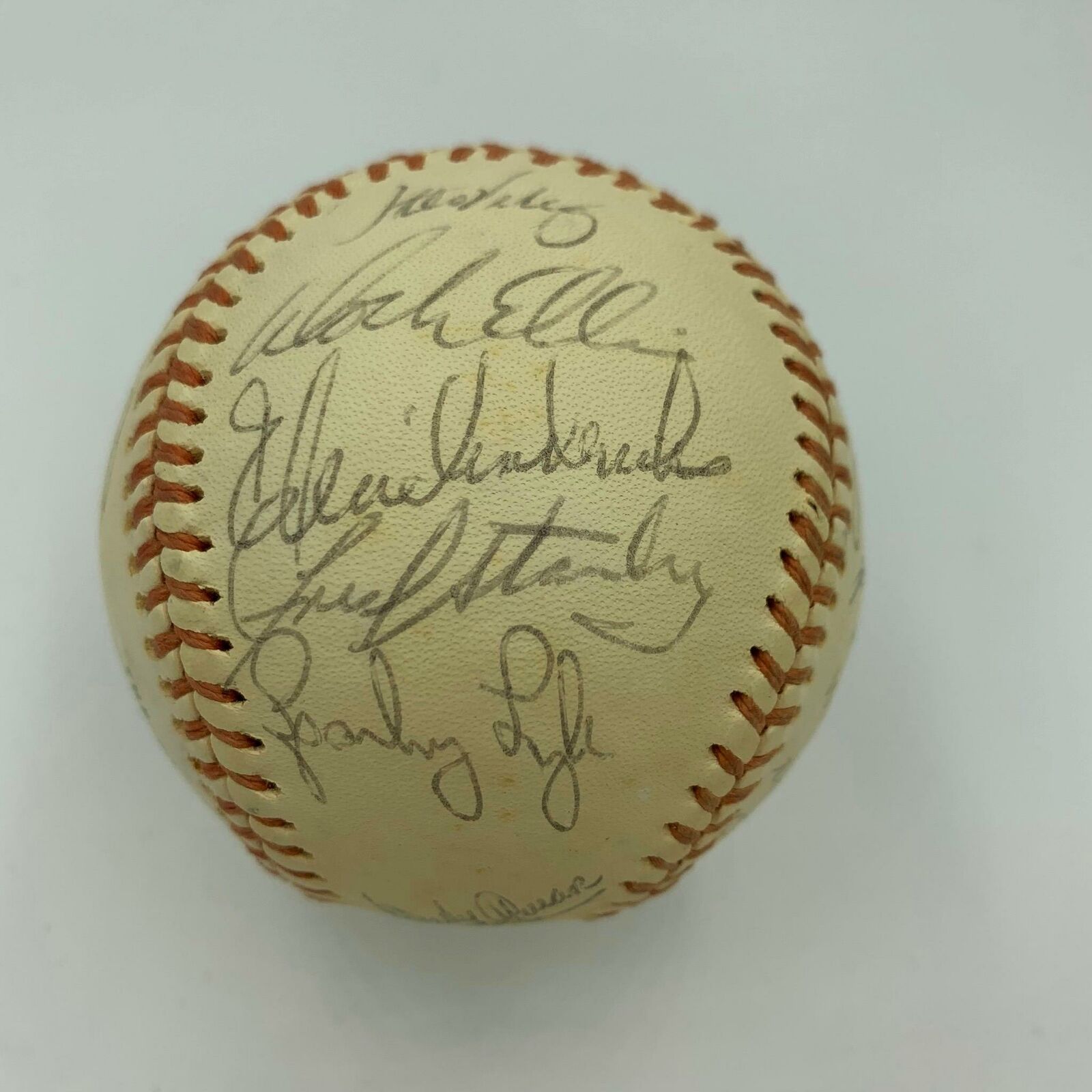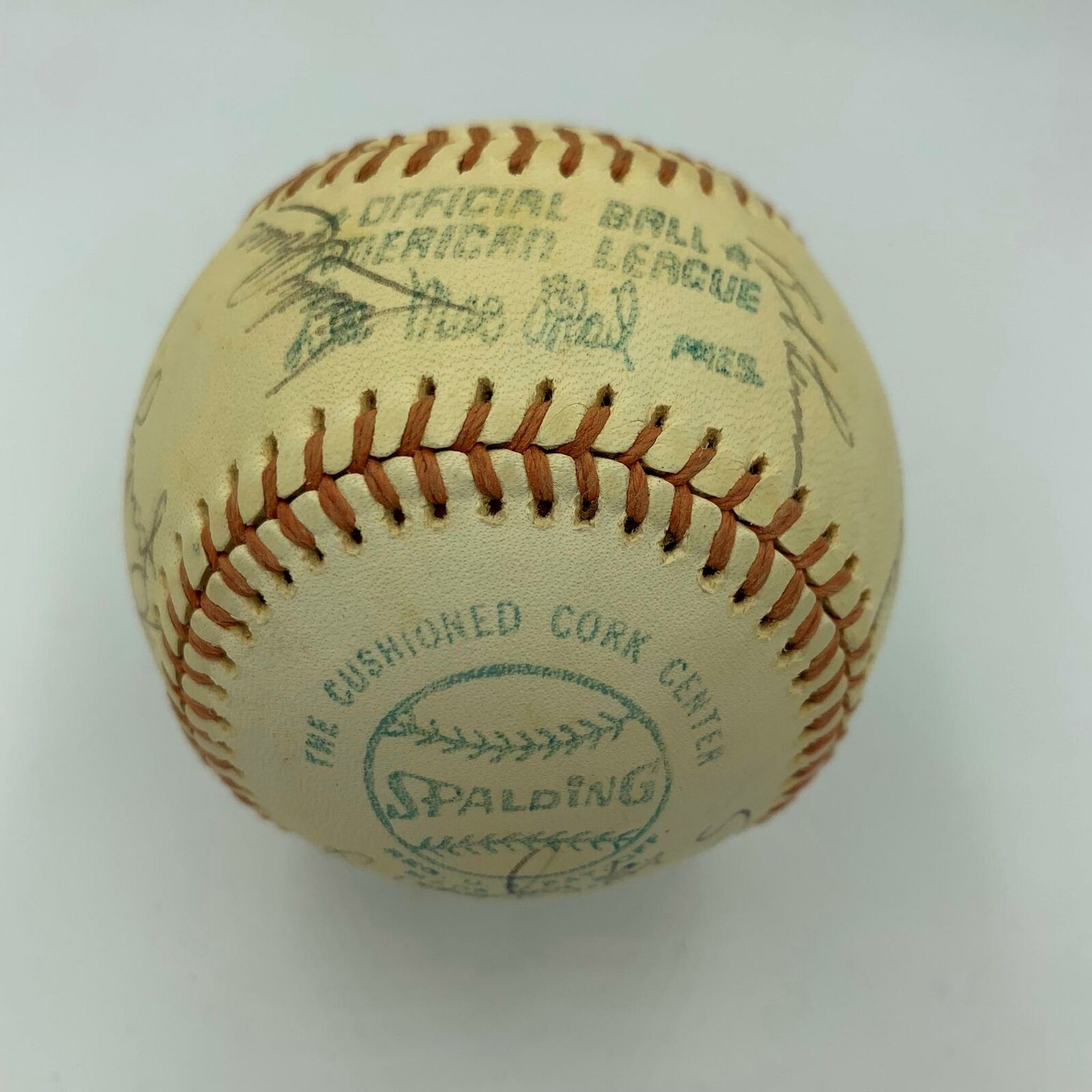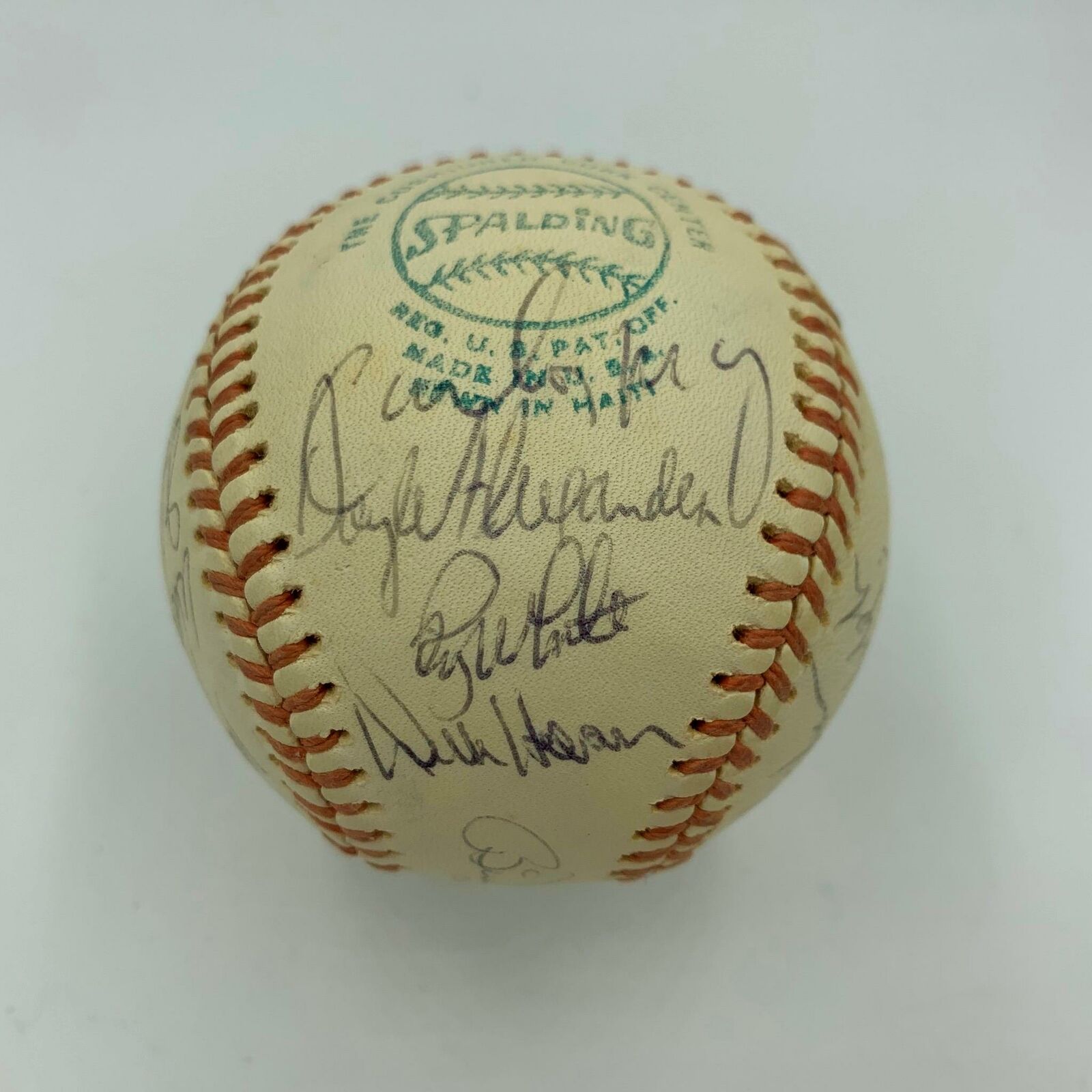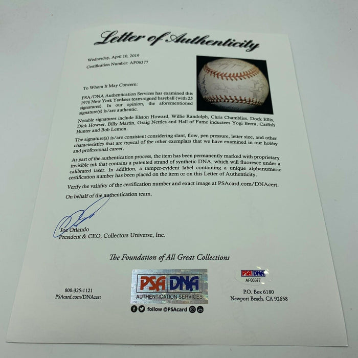 1976 New York Yankees Team Signed American League Baseball. 25 signatures with Yogi Berra, Bob Lemon, Catfish Hunter, Elston Howard, Willie Randolph, Doc Ellis, Billy Martin, Craig Nettles and many others. PSA DNA COA.