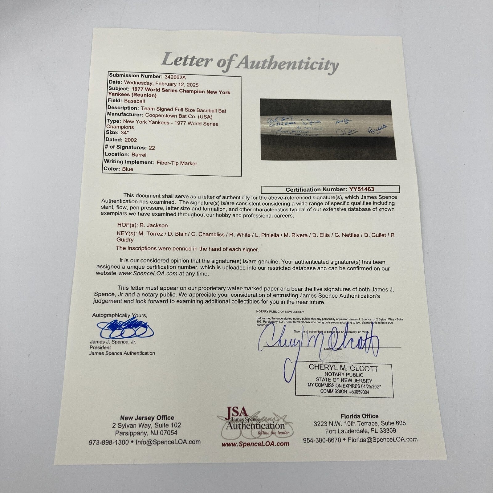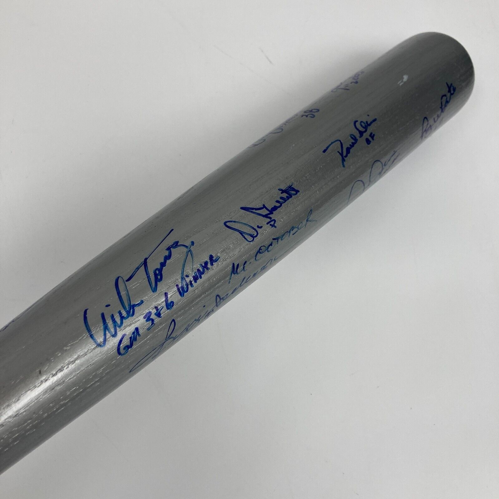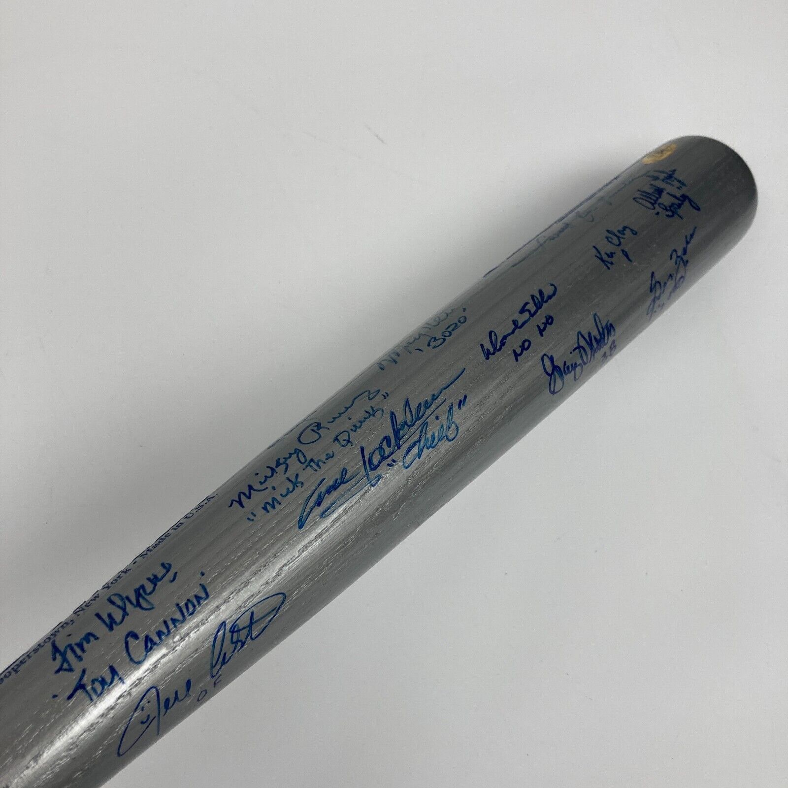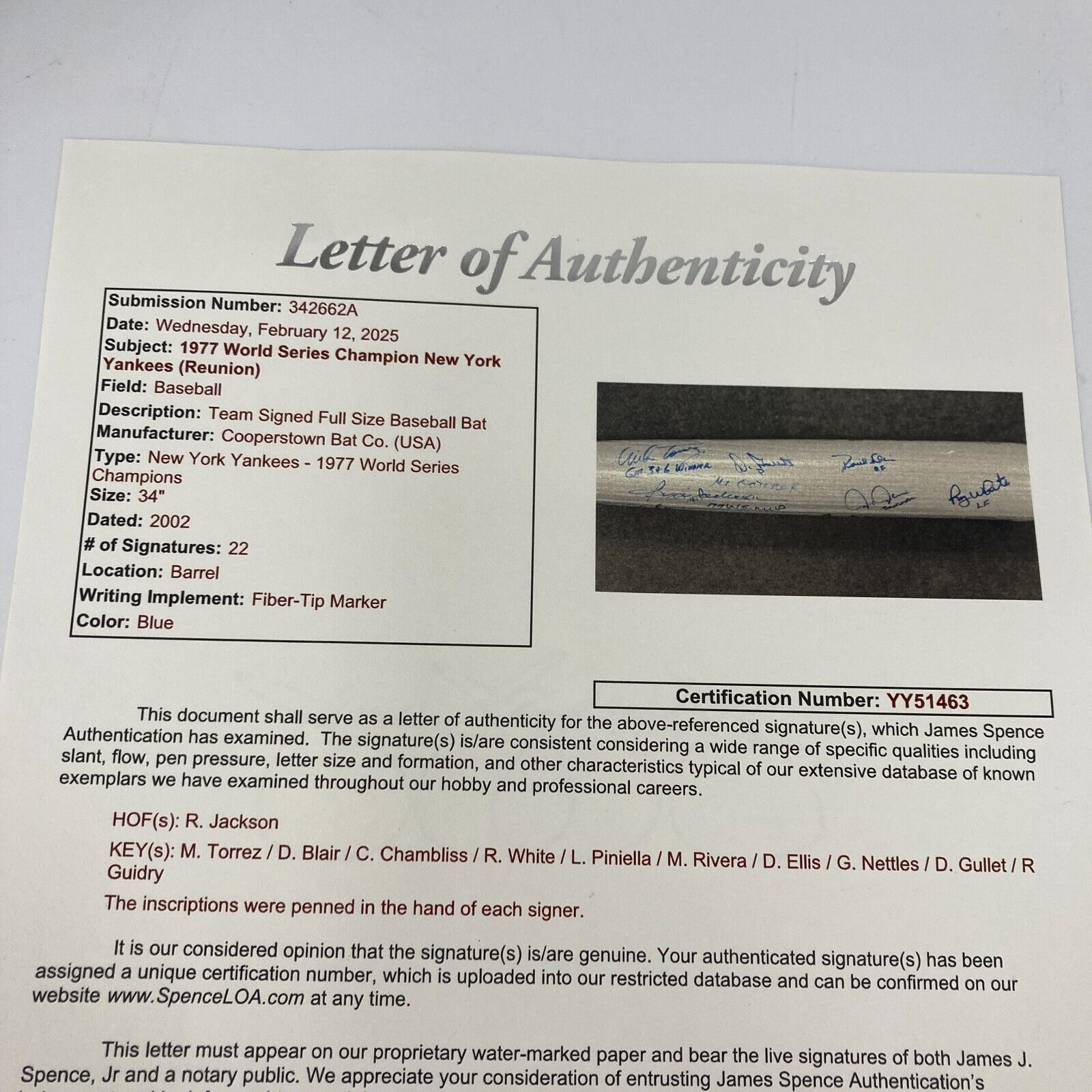 Presented is a silver Cooperstown Bat Co. bat signed by over 20 members of the 1977 New York Yankees World Series champion team. The bat is 34 inches long and includes the Yankees' NY logo and text that reads, "New York Yankees, 1977 World Series Champions" engraved on the barrel. Reggie Jackson, Ron Guidry, Mike Torrez, Chris Chambliss, Roy White, Paul Blair, Mickey Rivers, Graig Nettles, Doc Ellis, Sparky Lyle, and many more members of the team signed the bat in blue ink. Making this bat unique is the fact that every signature includes an inscription of an accolade or the player's position on the diamond. Reggie Jackson for example included "Mr. October" and "77 WS MVP" with his signature. Mickey Rivers added his nickname, "Mick The Quick." An MAB hologram is affixed to the end of the bat. The bat is in excellent condition.