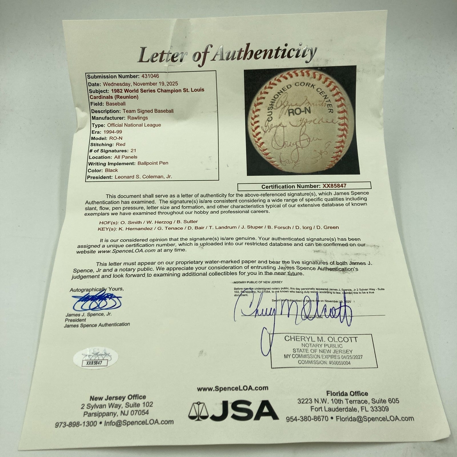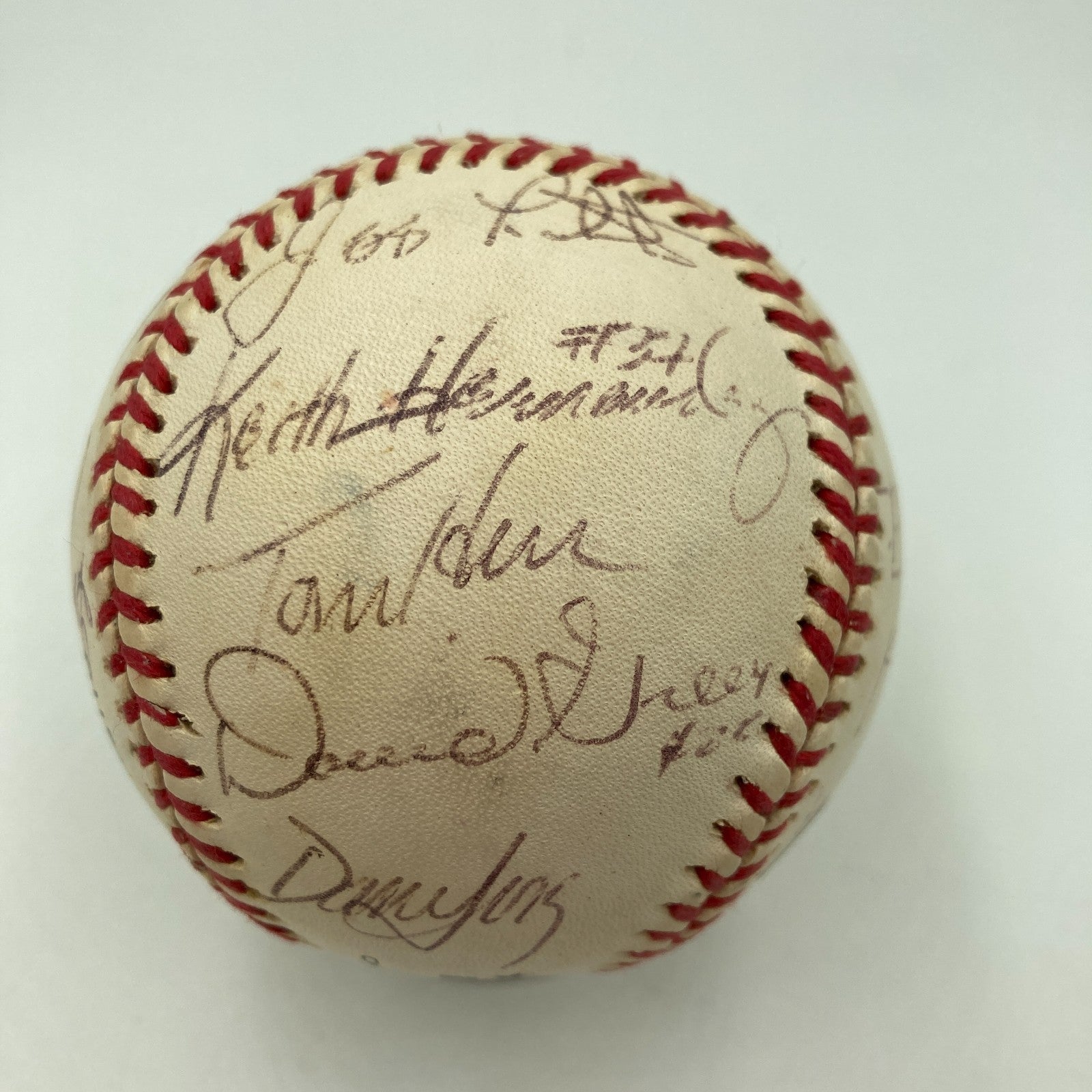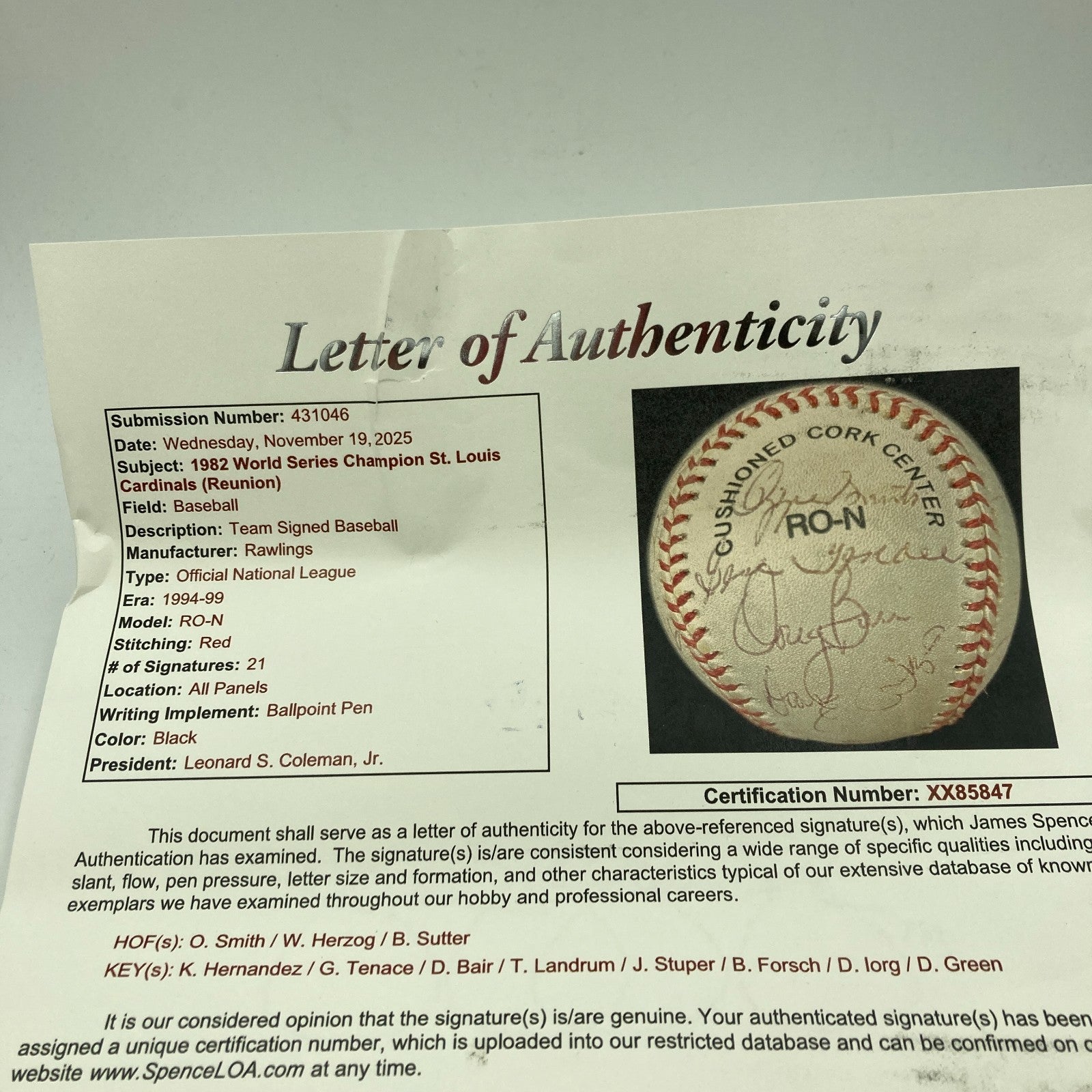 21 signatures with: Ozzie Smith, Whitey Herzog, Bruce Sutter, Keith Hernandez, George Hendrick, Jerry Reuss, Dave LaPoint, Tom Herr, Joaquin Andujar, Ken Oberkfell, Darrell Porter, Lonnie Smith, Willie McGee, Dane Iorg, David Green and many others.