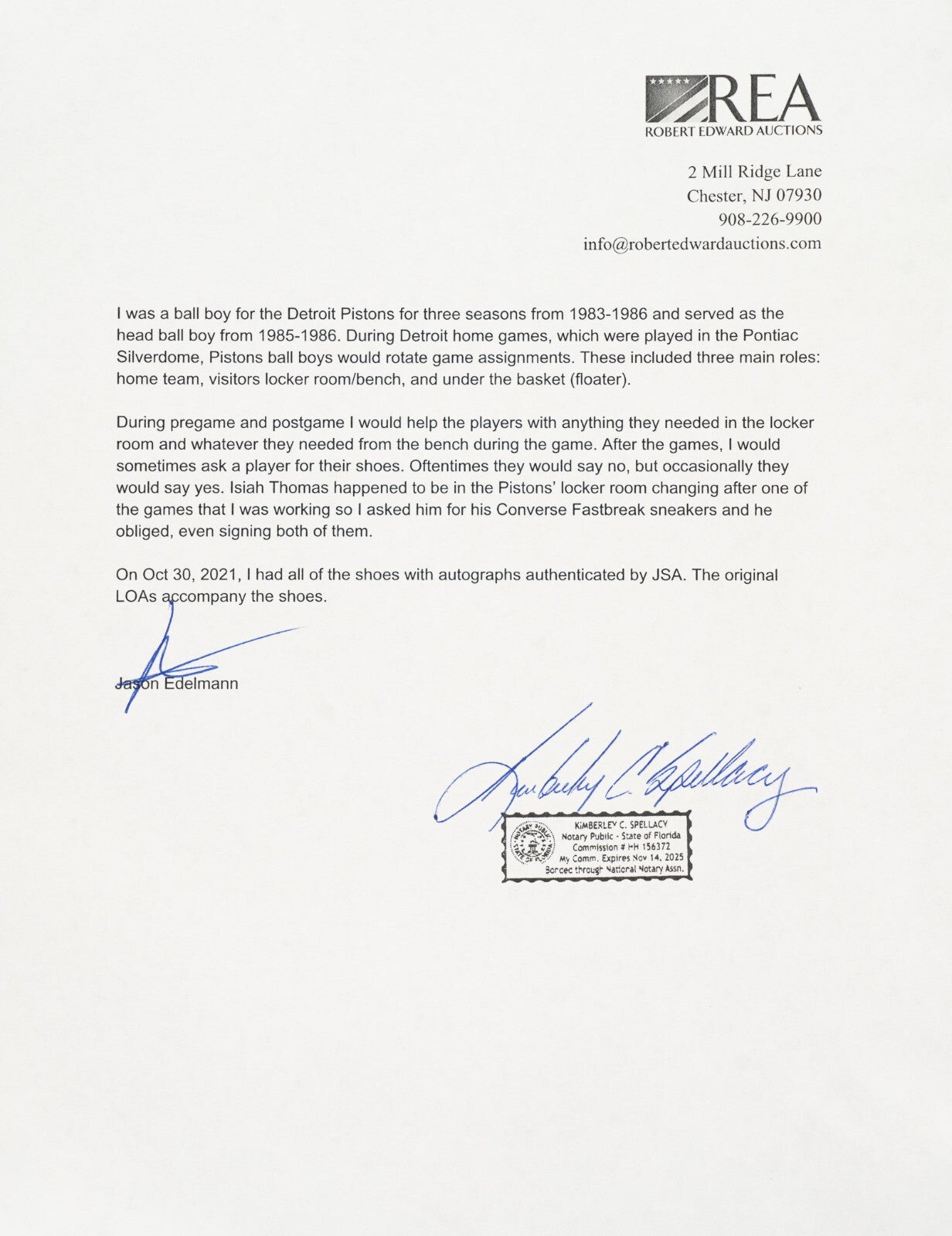 Offered is a pair of Hall of Famer Isiah Thomas signed game-worn sneakers, circa 1983-1984. The sneakers originate from a former Detroit Pistons ball boy, who served in the role for three seasons from 1983-1986. He has provided a letter of provenance detailing their history. After games, he would ask players for their shoes. While most players would say no, some said yes, including Thomas. The sneakers (size 11.5), a pair of white and blue canvas Converse Fastbreak, display heavy wear. A black labeling tag reading "Isiah" is affixed to the right sneaker. There is a small tear along the right sneaker's toe box. Thomas has signed both sneakers in black ink. He has added his uniform number "11" below each signature. Isiah Thomas joined the Detroit Pistons in the 1981-1982 season. A twelve-time All-Star Game selection (all with the Pistons), Thomas averaged 19.2 points and 9.3 assists per game throughout his thirteen-year career. In 1996 the Pistons honored Thomas's accomplishments and contributions to the team by retiring his number "11." He was inducted into the Basketball Hall of Fame in 2000. Full LOA from MEARS. Full LOA from James Spence/JSA.