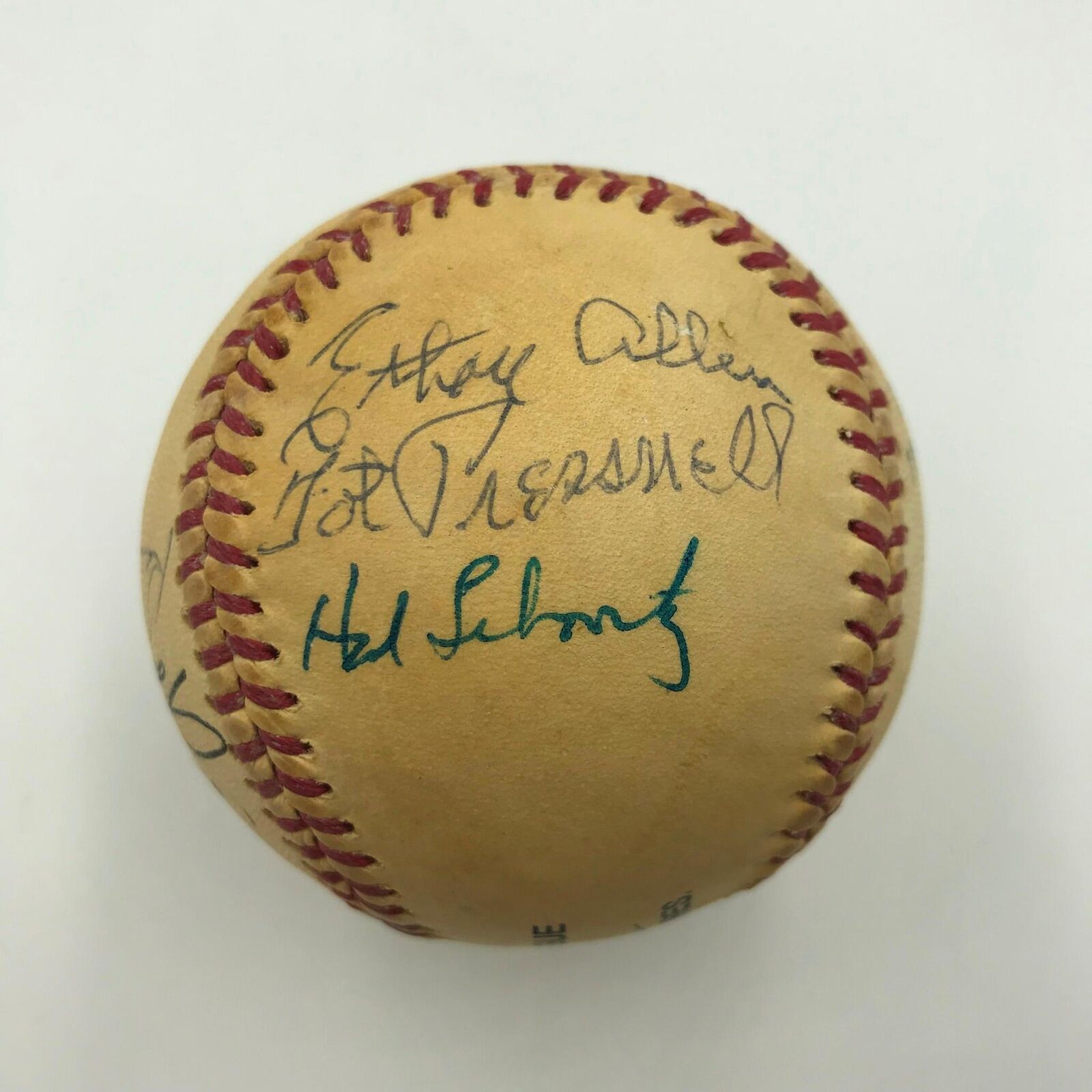 This came from Ken Keltner's personal collection. This is a 1984 Ohio Sports HOF Induction ball, notable for the autograph of star pitcher Mike Garcia, who died the following year (1985). There are six total signatures, including Keltner, Bob Howsam (displayable as a single, very desirable), Tom Eakin, Ethan Allen, Bob Schmitz and Tot Pressnell. JSA LOA. Comes with full letter JSA COA.