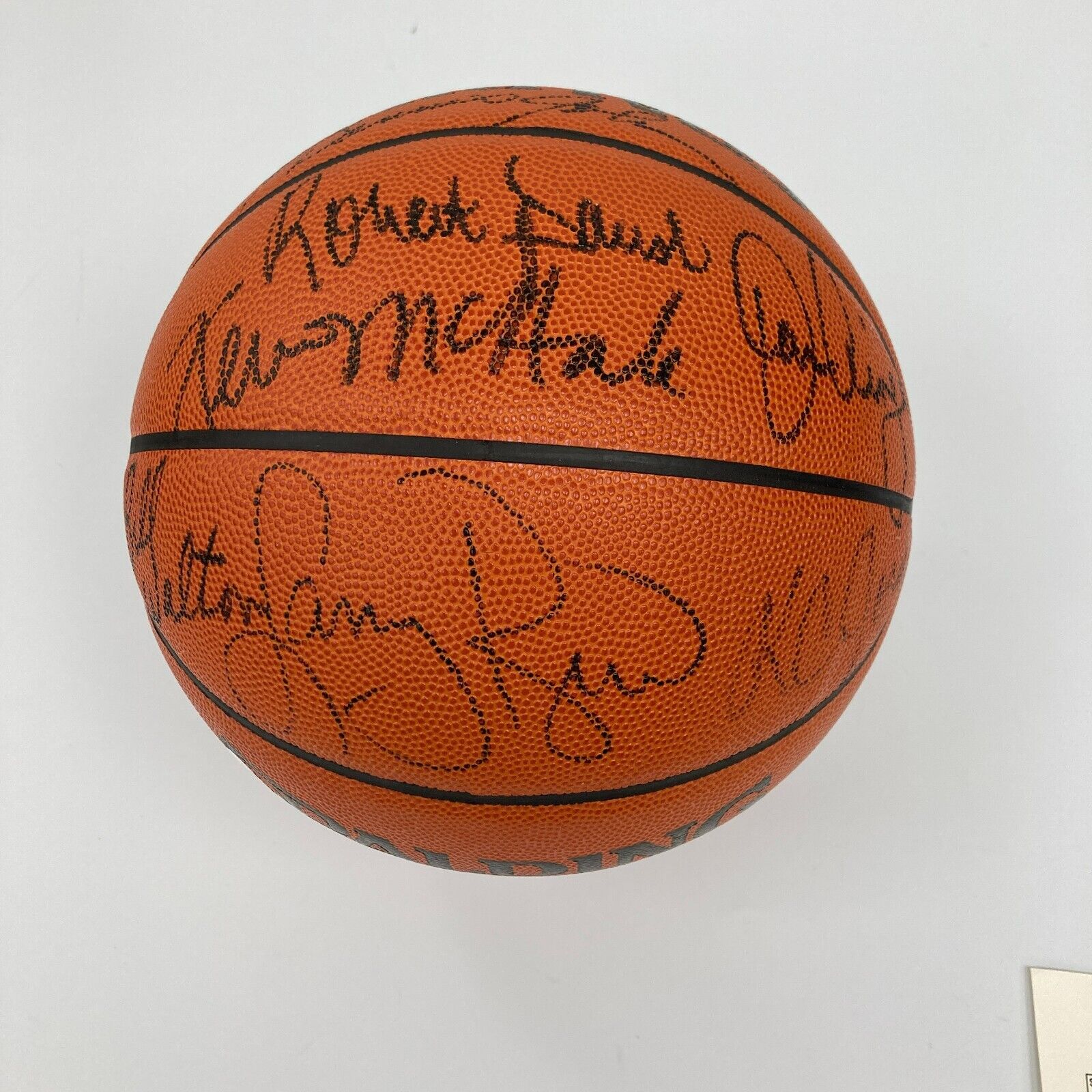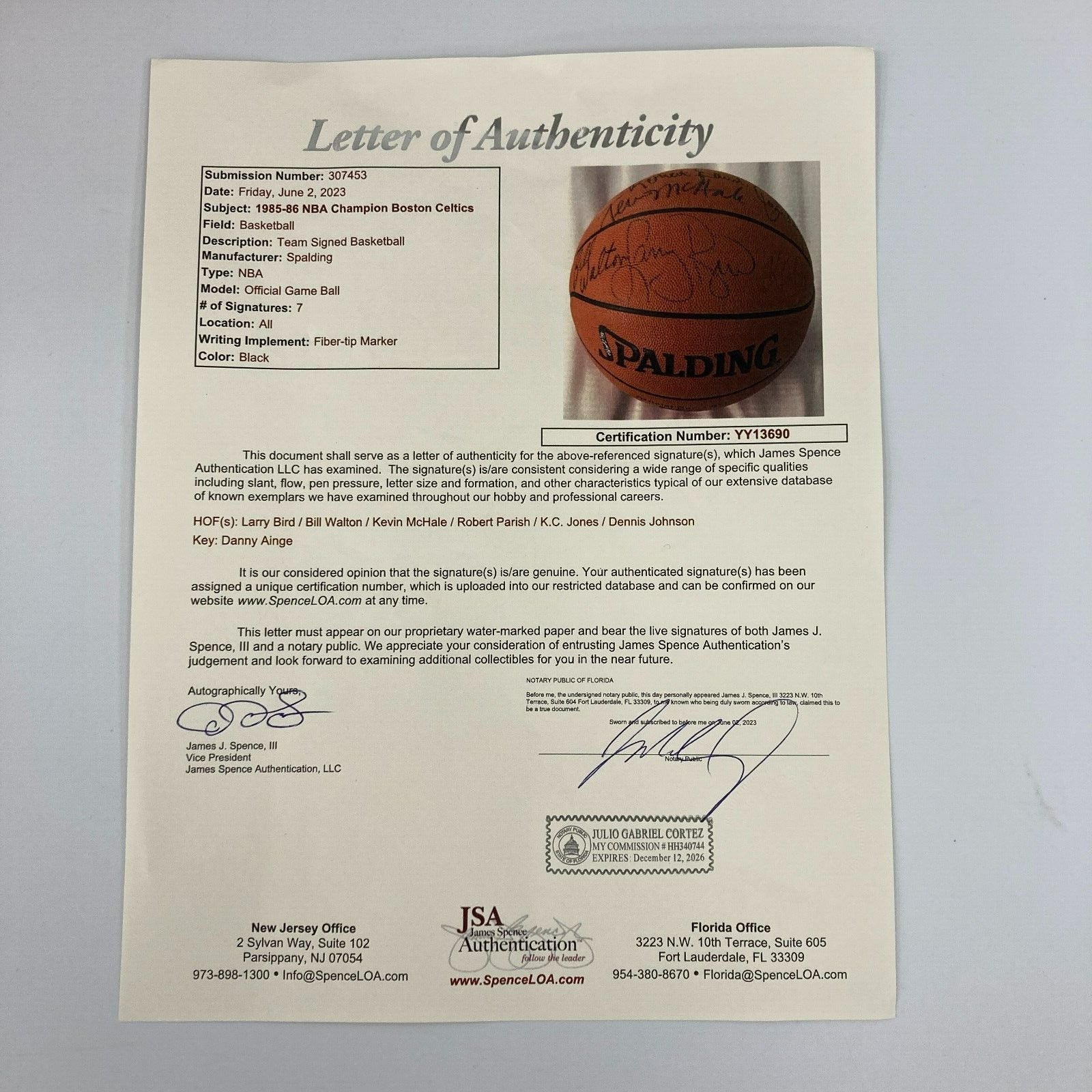 The 1985-86 Boston Celtics posted a mind-boggling 40-1 record at home, setting an NBA record that lasted until 2016. Make no mistake, the team is one of the best to step foot on NBA hardwood, sporting a trio on the front court consisting of Hall of Famers Larry Bird, Kevin McHale, and Robert Parish. The team made their third consecutive NBA Finals, where they faced down the Houston Rockets, defeating them to win their 16th NBA title. Bird captured his third consecutive MVP Award during this season, adding a capstone to a stellar year. This offered Spalding basketball is signed by seven members of the team. The ball is signed by Hall of Famers Larry Bird, Bill Walton, Kevin McHale, Robert Parish, K.C. Jones, and Dennis Johnson, as well as Danny Ainge. The ball comes with an LOA from JSA (YY13690) for the signatures.