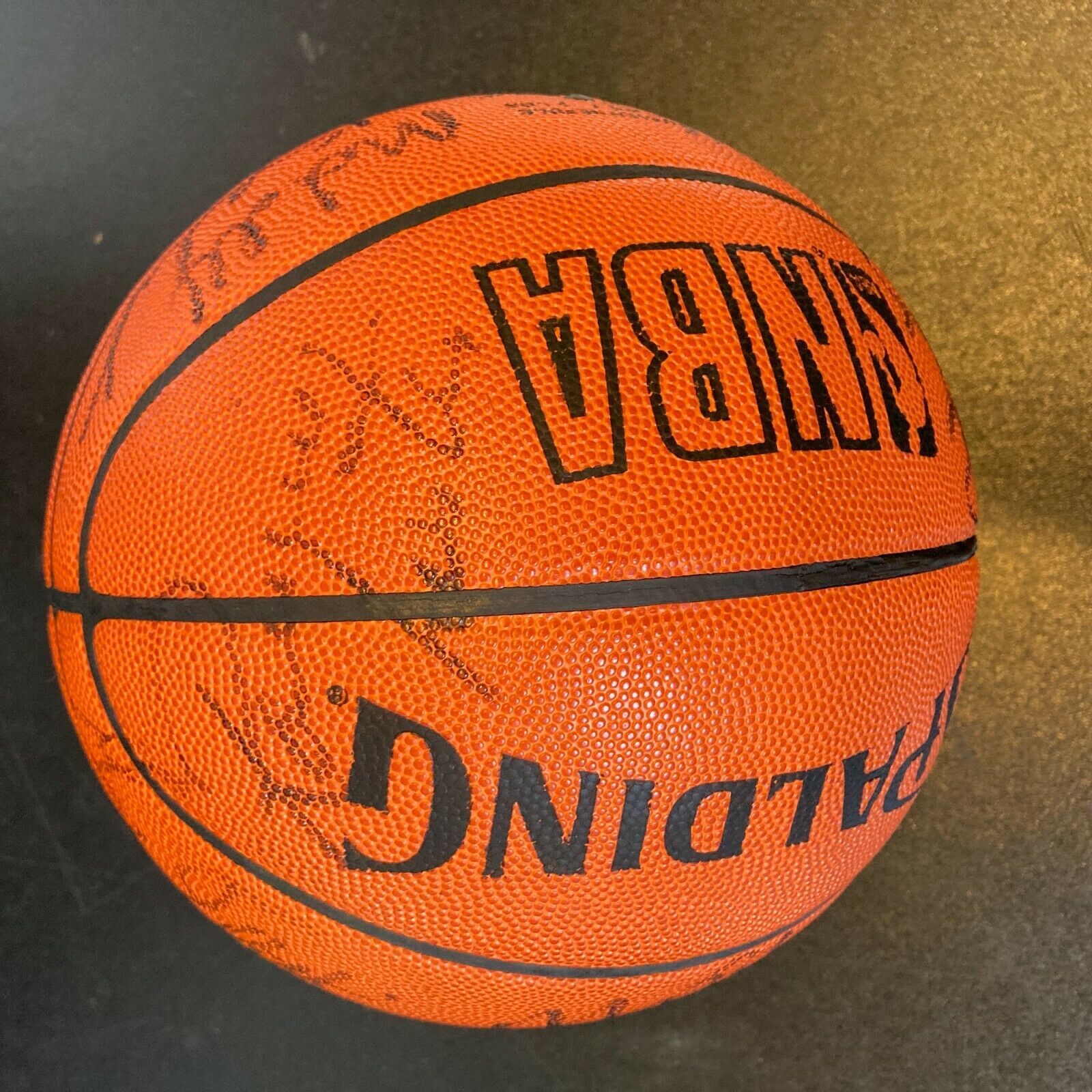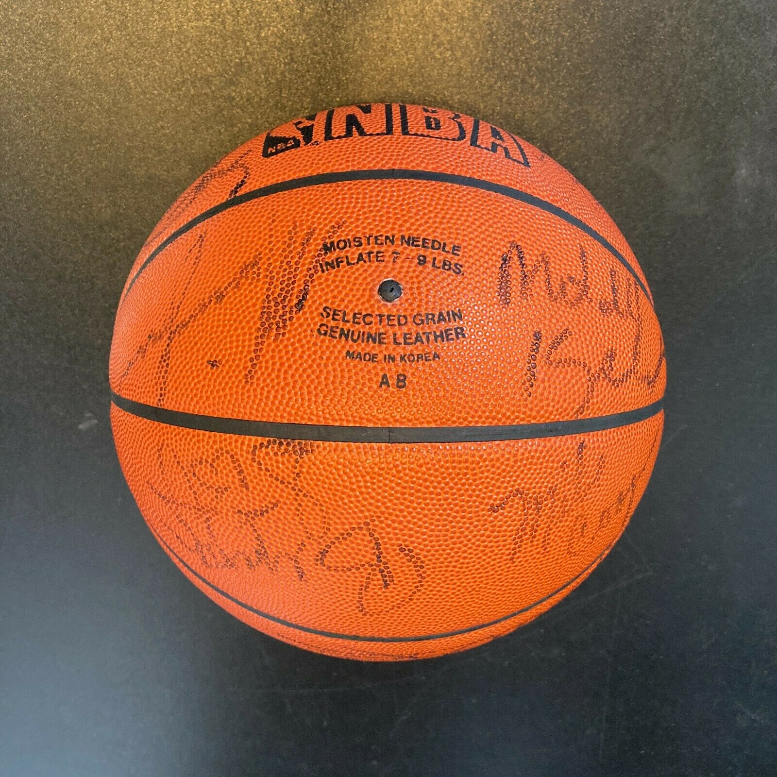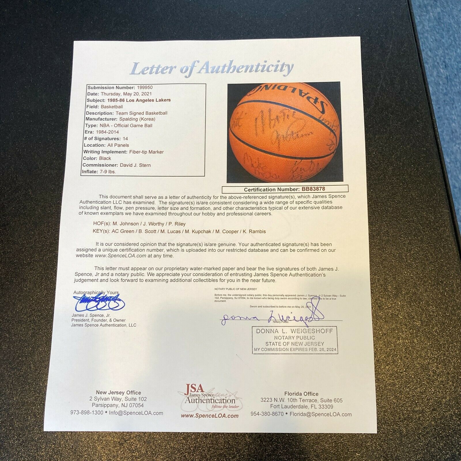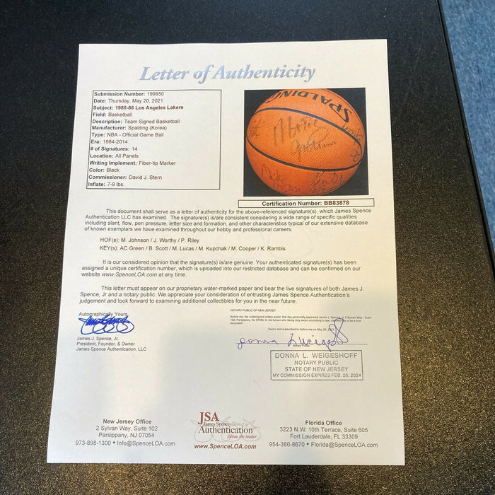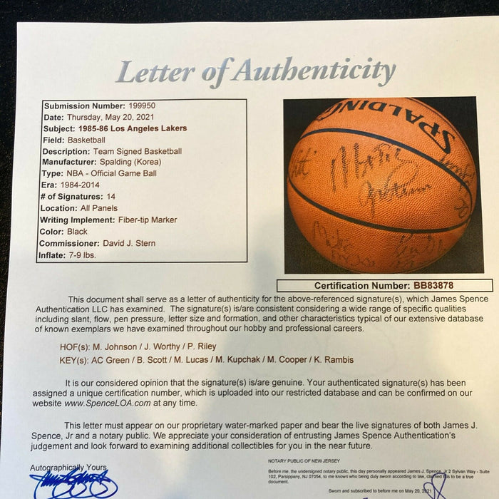 1985-86 Los Angeles Lakers Team Signed NBA Game Basketball. 14 signatures with Magic Johnson, James Worthy, Pat Riley and the rest of the etam. Full letter JSA COA.