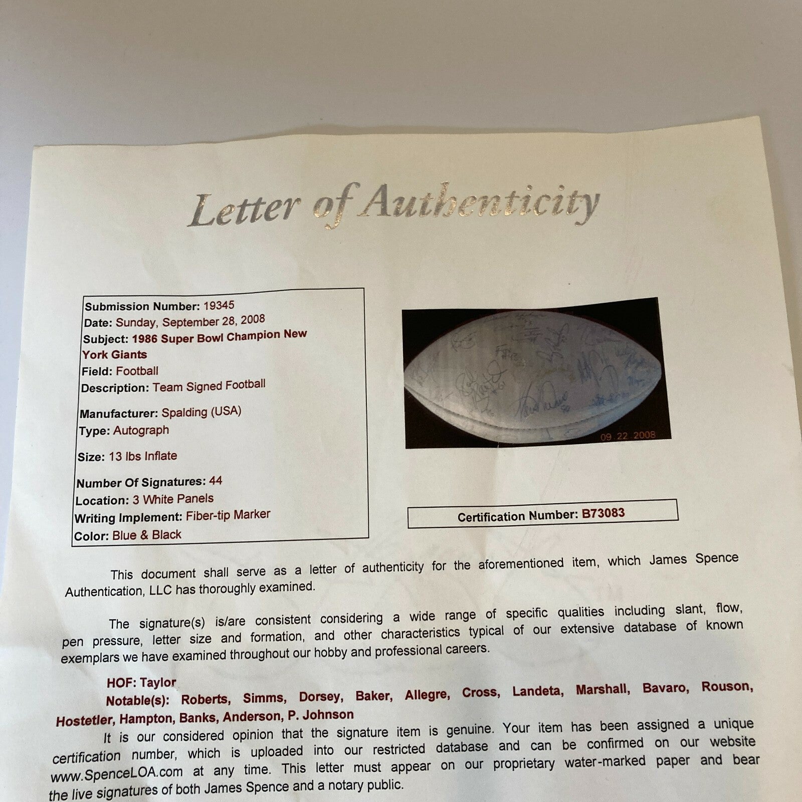 Vintage Spalding white-panel autograph football signed by forty-four members of the 1986 Super Bowl Champion New York Giants team. Notable signatures include Hall of Famer Lawrence Taylor and Super Bowl MVP Phil Simms. Full LOA from James Spence/JSA.