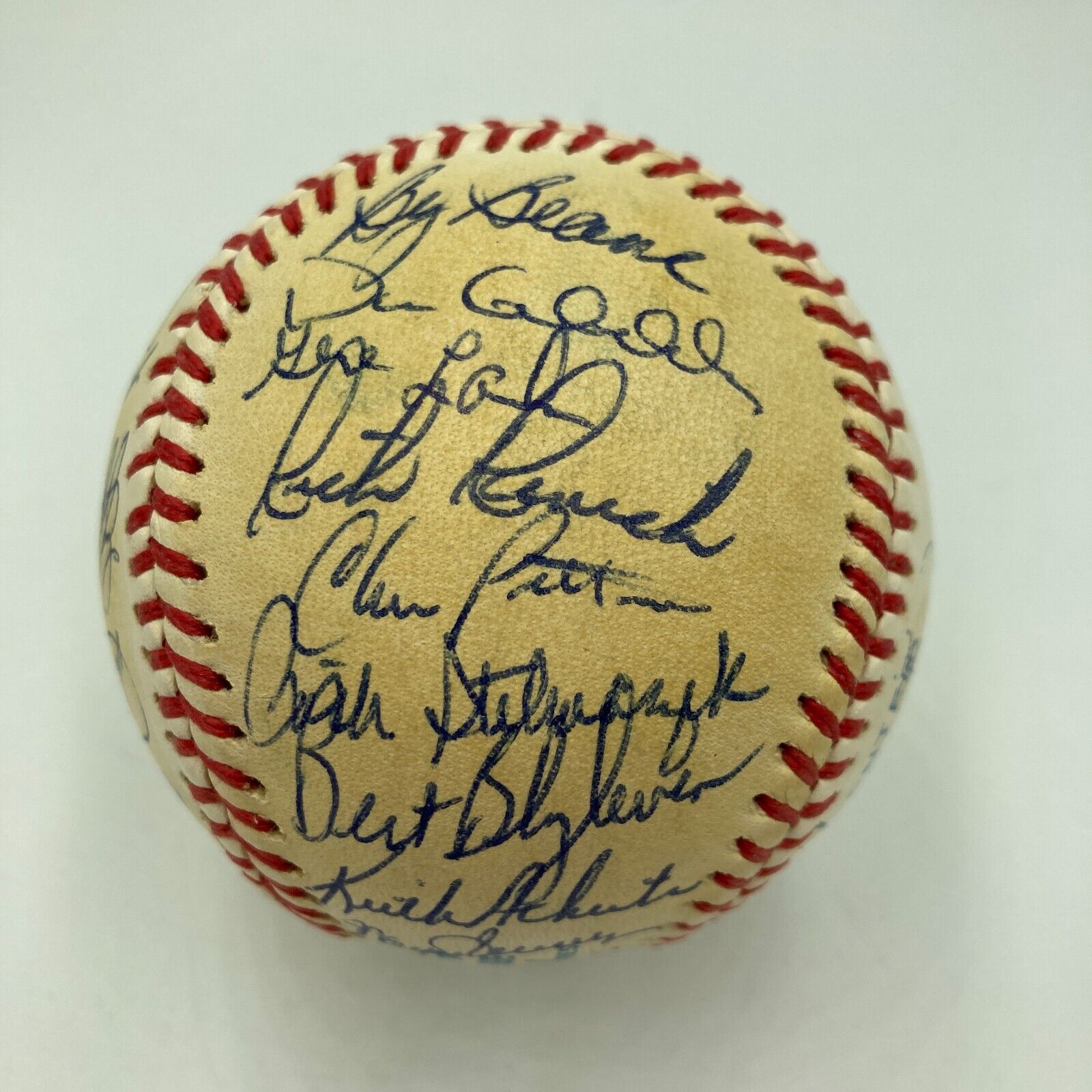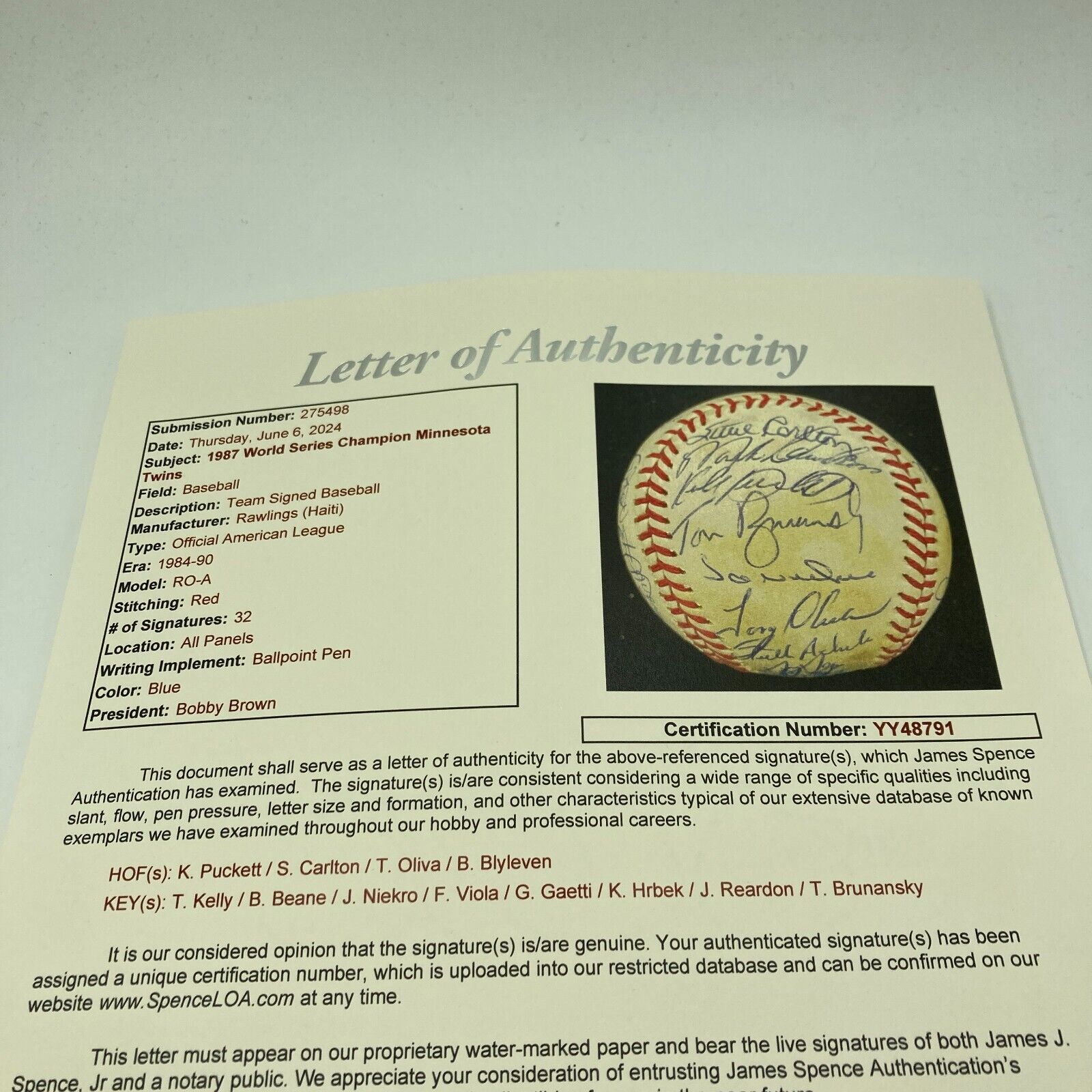 1987 Minnesota Twins Team Signed American League Baseball signed by 32 members of the World Series Champions. The signatures on the ball remain in remarkable condition 36 years later. Signatures Include HOF'ers: Bert Blyleven, Kirby Puckett, Steve Carlton, Tony Oliva. Also signed by Wayne Terwilliger, Steve Lombardozzi, Roy Smalley, Keith Atherton (2x), Rich Stelmaszek, Rich Rennick, Gene Larkin Dan Gladden, Billy Beane, Tom Kelly, Mark Davidson, Tom Brunansky, Joe Niekro, Greg Gagne, Mike Smithson, Jeff Bittiger, Gary Gaetti, Frank Viola, Roy Smith, Randy Bush, Sal Butera, Kent Hrbek, Jeff Reardon, Al Newman, Dick Such, Juan Berenguer and Les Straker. The Twins defeated the Cardinals in 7 games to win their 1st World Series Championship. This ball is a rarity because it contains the signatures of all three Hall of Famers who played for the Twins in 1987, Kirby Puckett, Bert Blyleven and the rarely found Steve Carlton, along with Coach Tony Oliva.