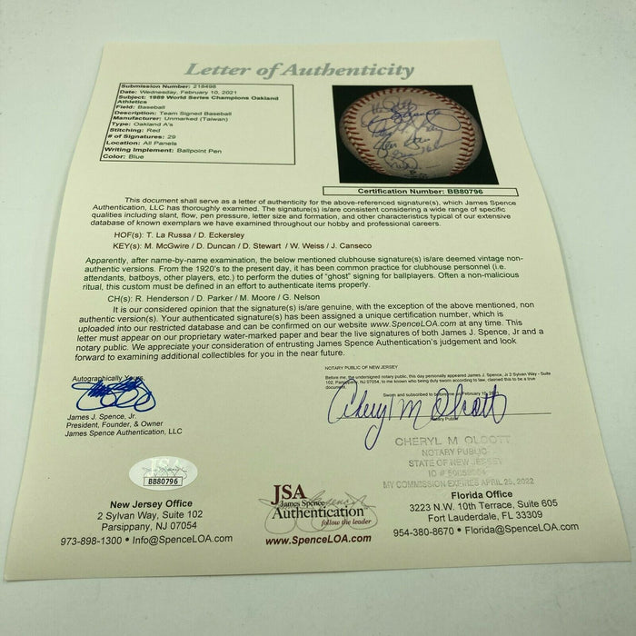 1989 Oakland A's Athletics World Series Champs Team Signed Baseball JSA COA