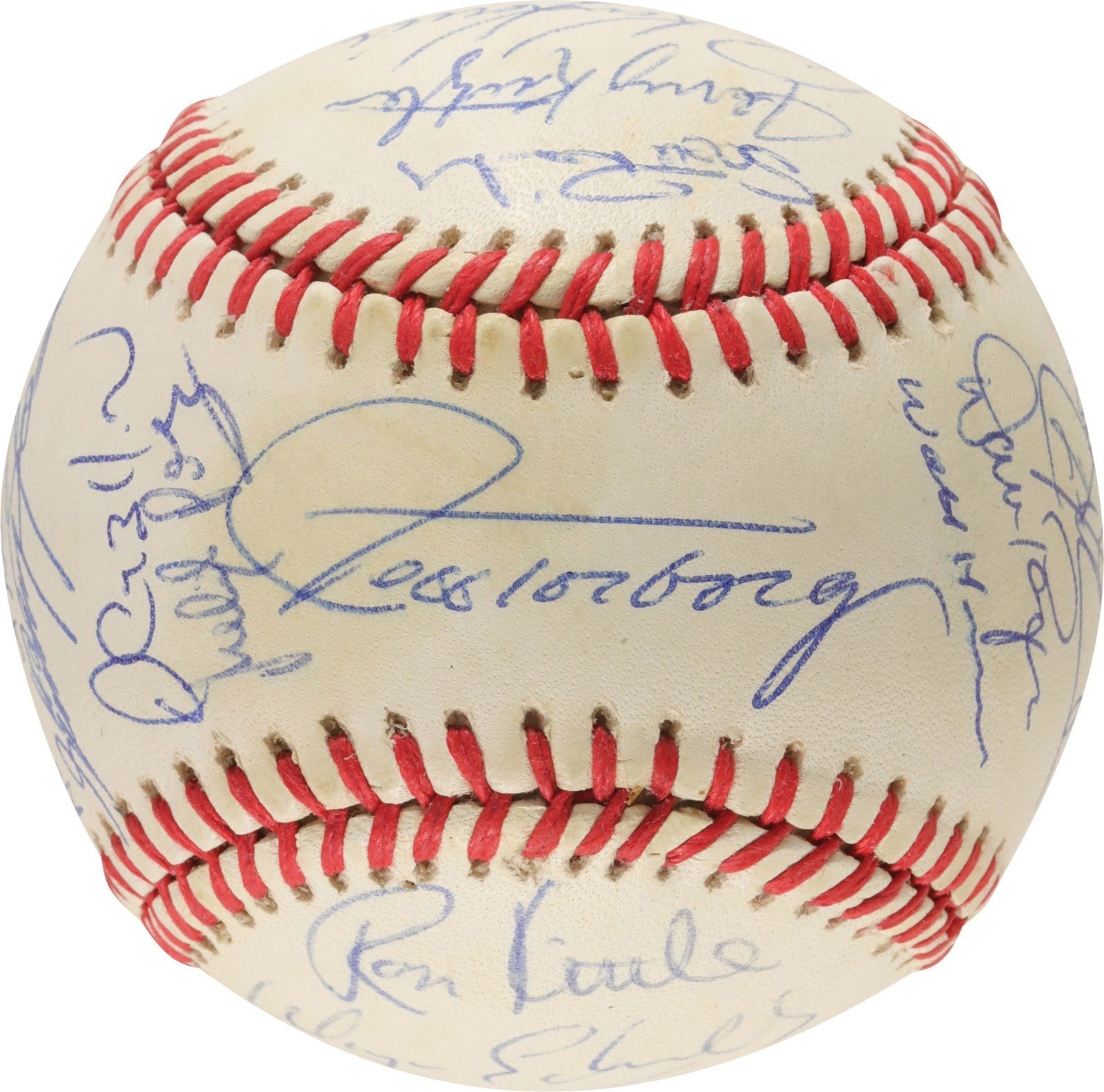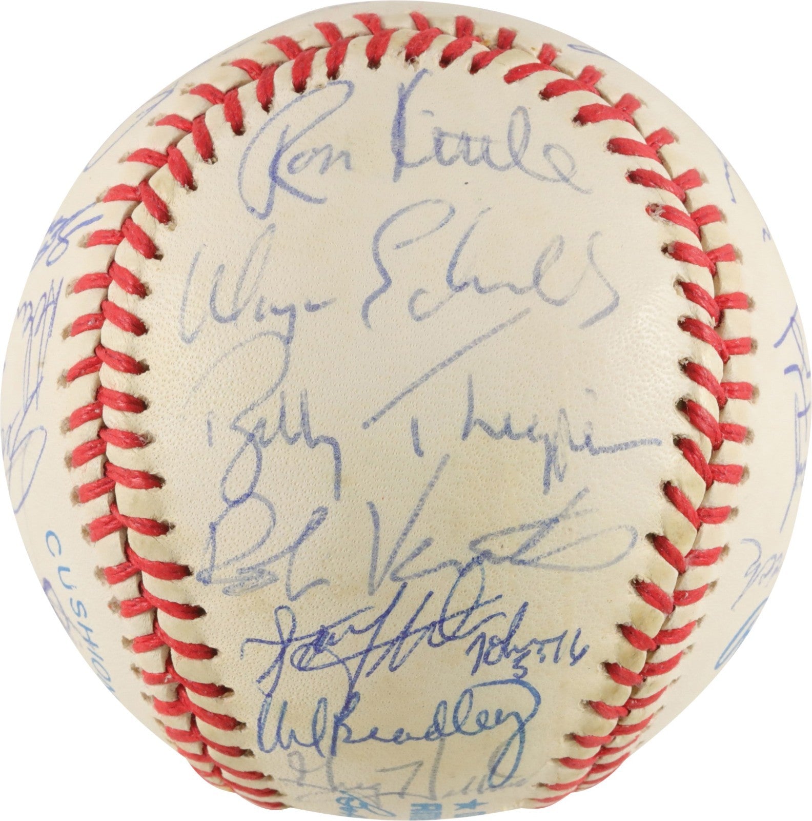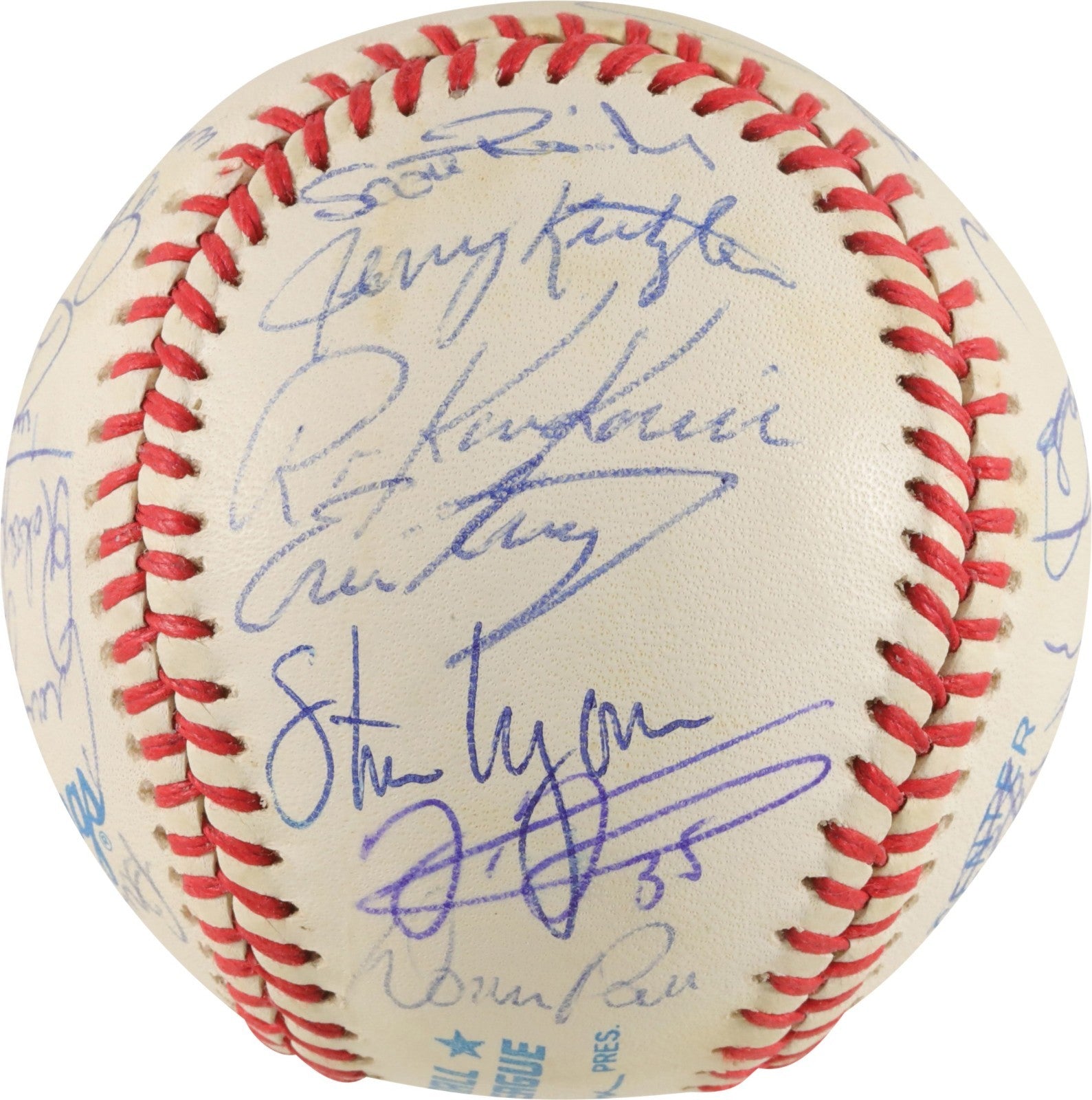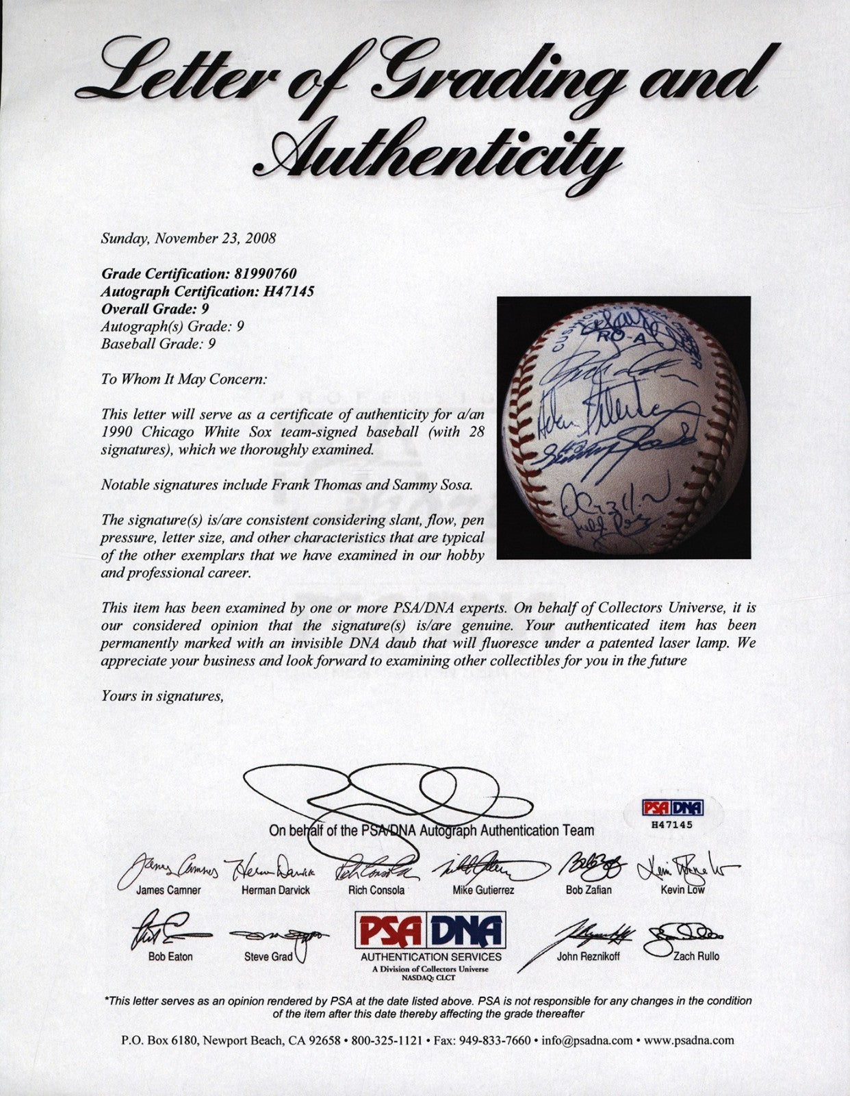 Presented is a 1990 Chicago White Sox team-signed Official American League Ball (Brown) with 28 signatures, including Sammy Sosa and Frank Thomas. Additional signatures include: Jeff Torborg (manager) on sweet spot, Ron Kittle, Rodney McCray, Craig Grebeck, Barry Jones (with a write-over), Steve Lyons, Ron Karkovice, Jerry Kutzler, Robin Ventura, Donn Pall, and more. In 1990, the White Sox finished at 94-68, second in the AL West. Sosa, only 21 years old, hit 15 home runs, while Thomas, only 22 years old, hit 7 home runs.