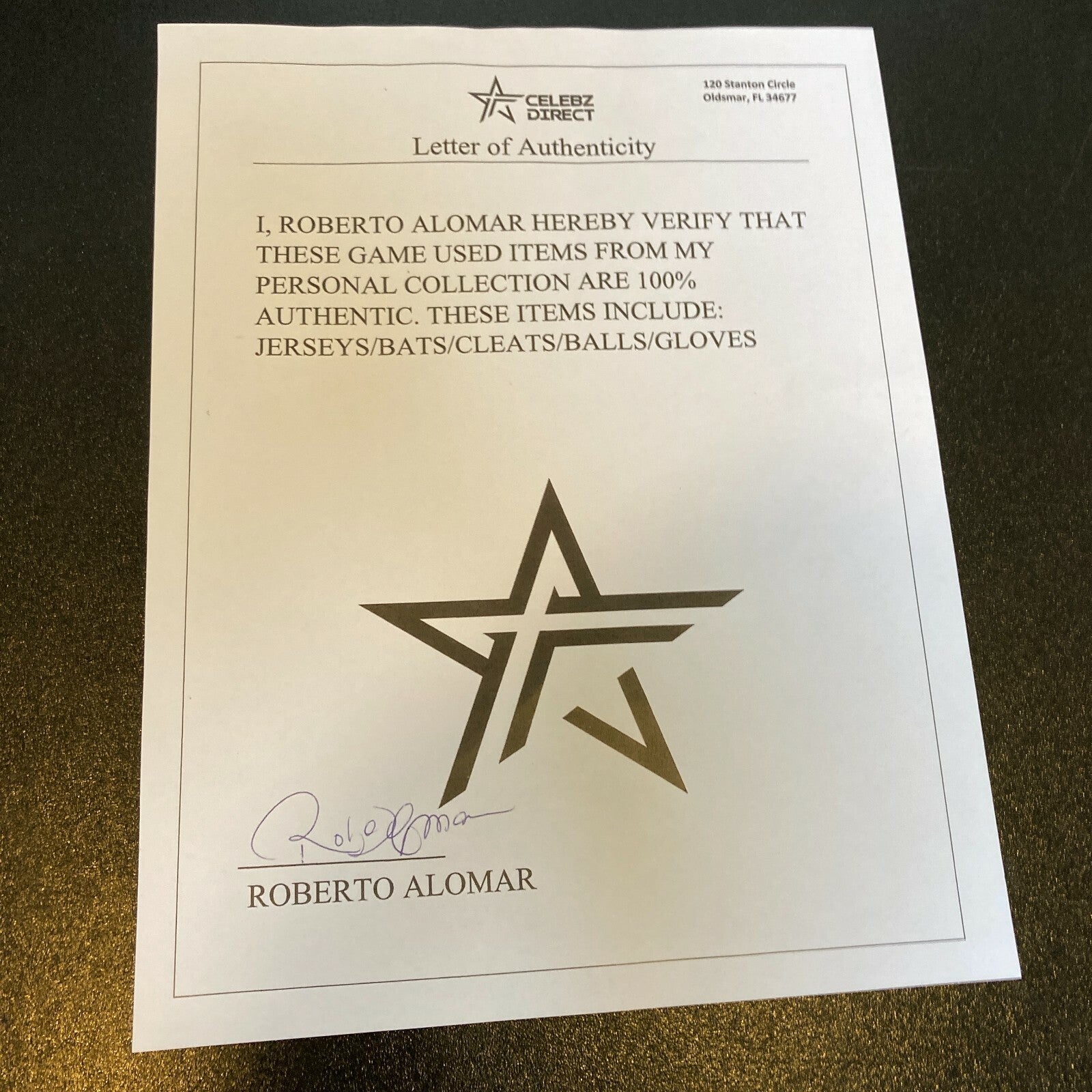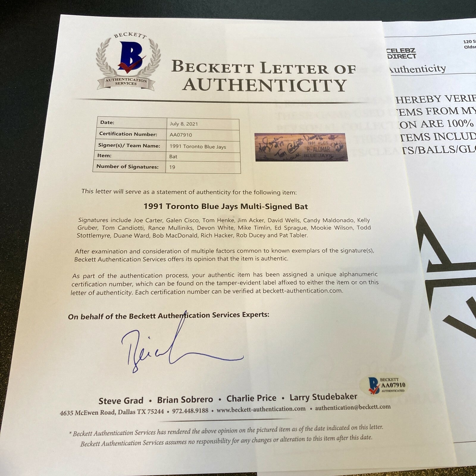 1991 Roberto Alomar Game Issued & Team Signed American League Championship Series Bat with Alomar Letter. This Adirondack model 454B bat (32 ounces and 34.25") was issued to Hall of Famer Roberto Alomar. Alomar's teammates signed on in black felt tip. Included are: Cisco, Henke, Wells, Carter, Acker, Lansford, Candiotti, Maldonado, White, Hacker, MacDonald, Sprague, Wilson, Stottlemyre, Ward, Gruber, Tomlin and a few more. Letter of provenance from Roberto Alomar. Full LOA from Beckett Authentication Services.