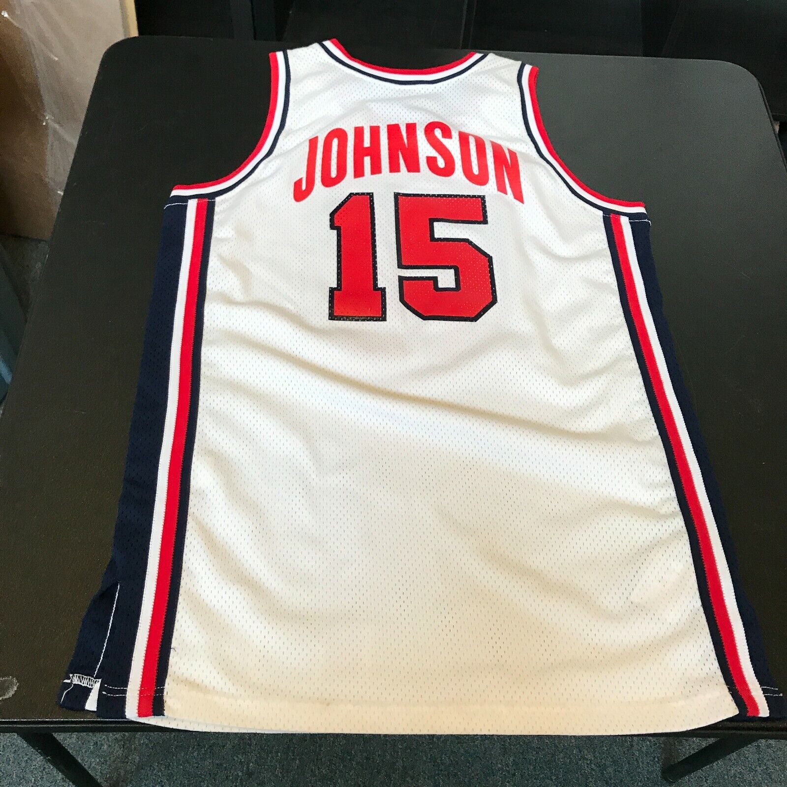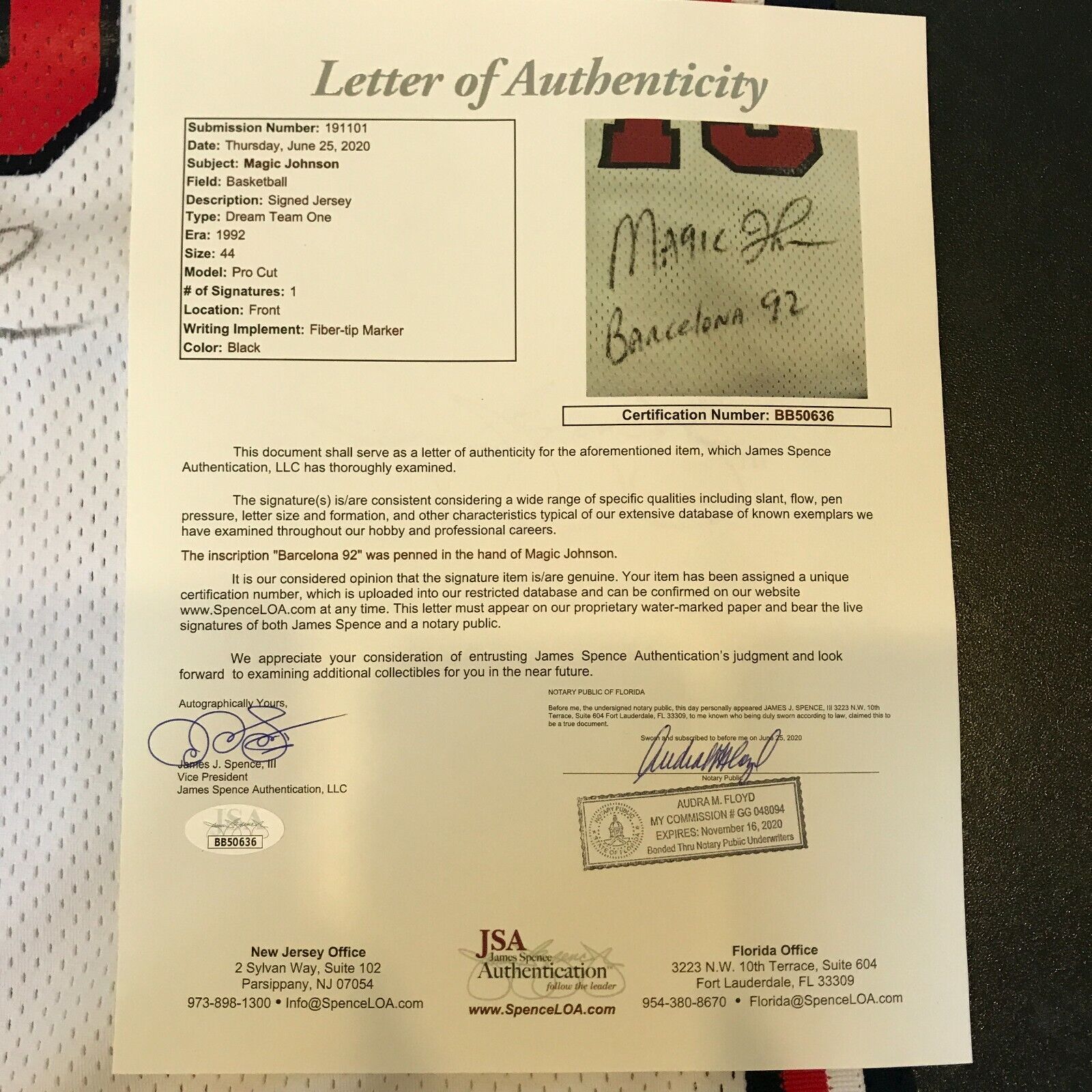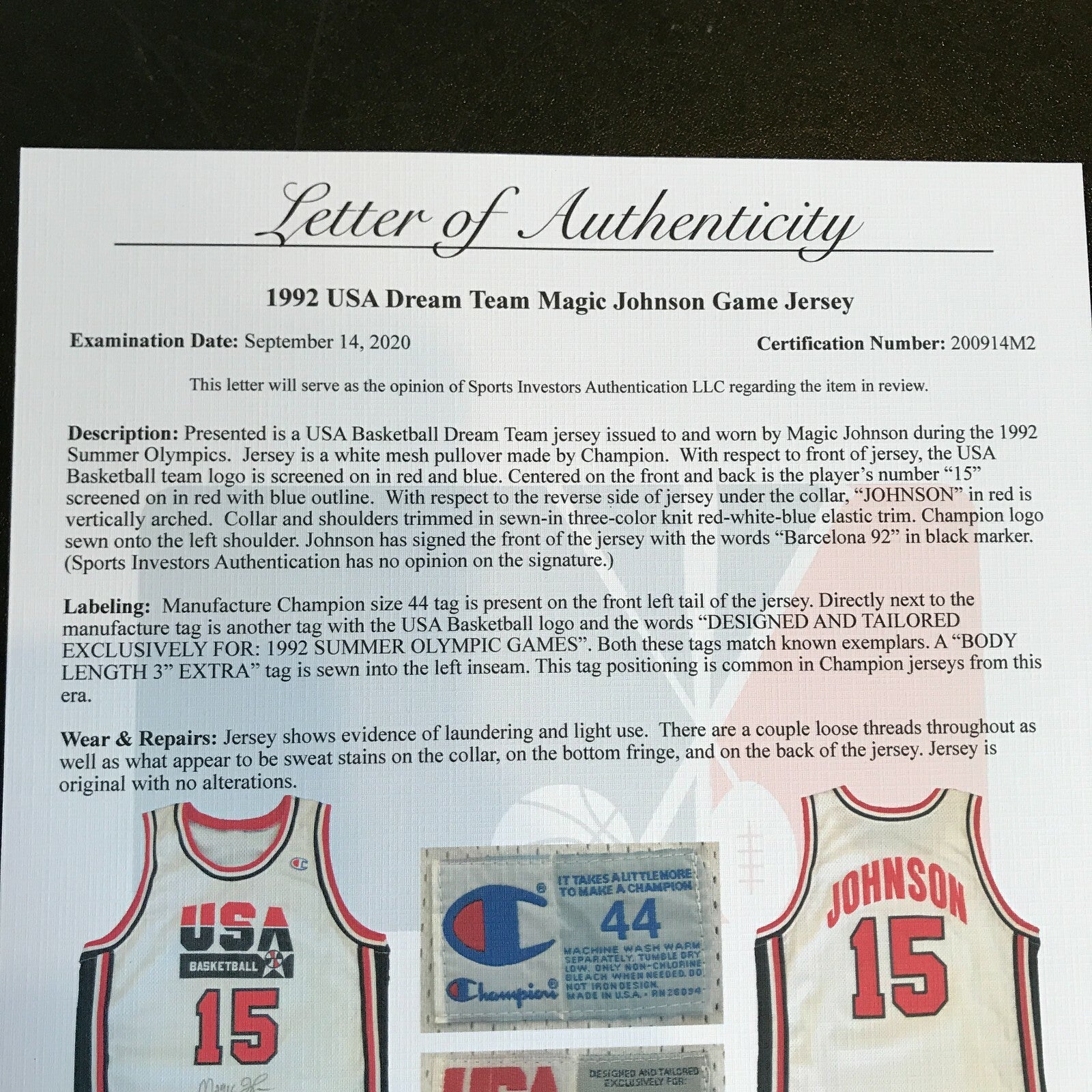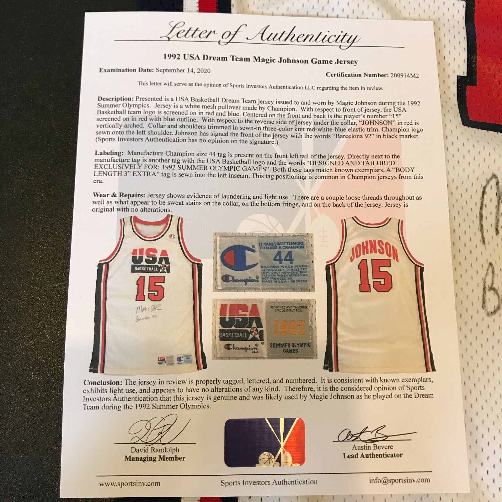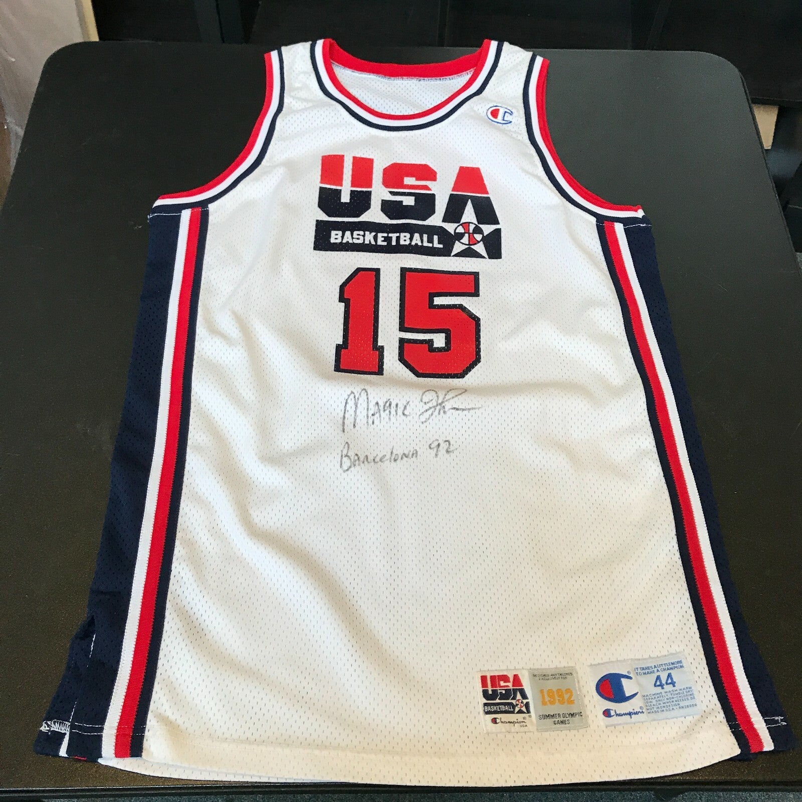 Historic 1992 Magic Johnson Signed Game Used Team USA Olympics Jersey. Magic inscribed in big "Barcelona". Jersey shows great game use with some sweat staining from Magic.
