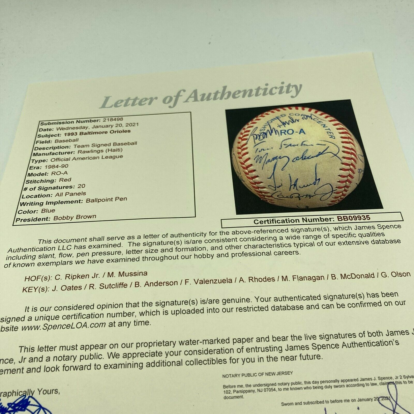 1993 Baltimore Orioles ball with (20) autographs, including keys Johnny Oates, Cal Ripken Jr, Mike Mussina and Fernando Valenzuela. Full letter JSA COA.