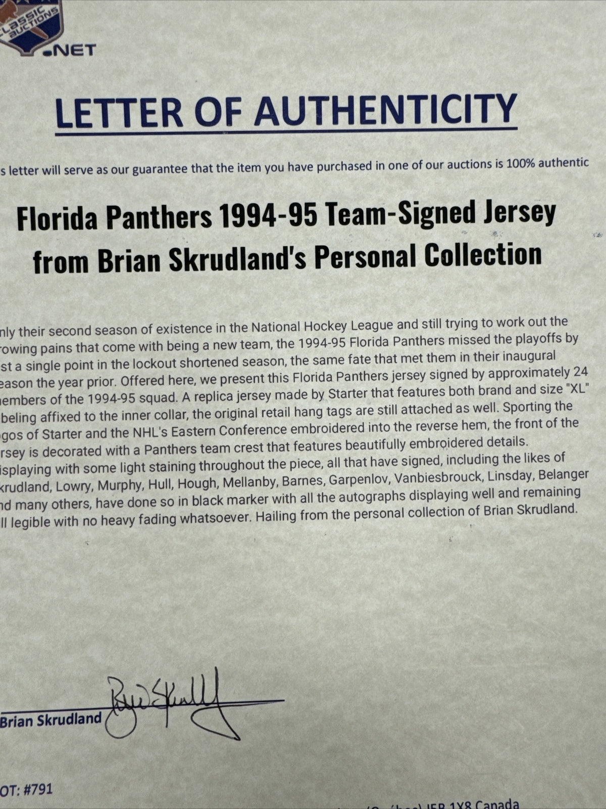 Only their second season of existence in the National Hockey League and still trying to work out the growing pains that come with being a new team, the 1994-95 Florida Panthers missed the playoffs by just a single point in the lockout shortened season, the same fate that met them in their inaugural season the year prior. Offered here, we present this Florida Panthers jersey signed by approximately 24 members of the 1994-95 squad. A replica jersey made by Starter that features both brand and size "XL" labeling affixed to the inner collar, the original retail hang tags are still attached as well. Sporting the logos of Starter and the NHL's Eastern Conference embroidered into the reverse hem, the front of the jersey is decorated with a Panthers team crest that features beautifully embroidered details. Displaying with some light staining throughout the piece, all that have signed, including the likes of Skrudland, Lowry, Murphy, Hull, Hough, Mellanby, Barnes, Garpenlov, Vanbiesbrouck, Linsday, Belanger and many others, have done so in black marker with all the autographs displaying well and remaining full legible with no heavy fading whatsoever. Hailing from the personal collection of Brian Skrudland, the piece comes accompanied by his signed LOA.