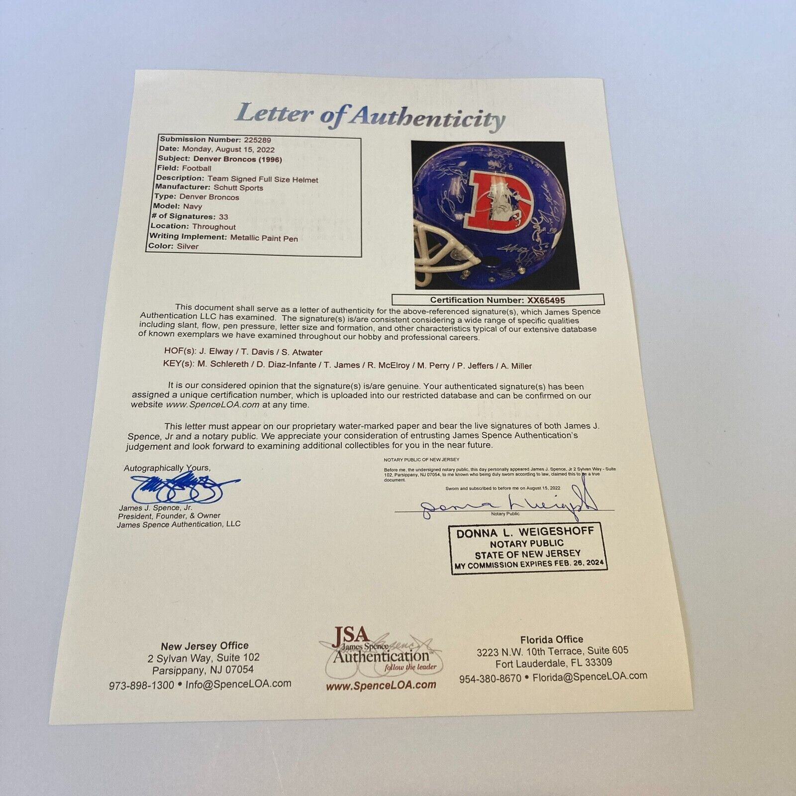 Official Schutt Air Denver Broncos full-size football helmet, signed in silver ink by over 30 players from the star-studded 1996 team, including: John Elway (on the team logo), Terrell Davis, Shannon Sharpe, Steve Atwater, Tom Nalen, Reggie McElroy, Britt Hager, Lionel Washington, Michael Perry, Mike Lodish, Anthony Miller, Harald Hasselbach, Maa Tanuvasa, Aaron Craver, David Diaz-Infante, Tory James, and others.