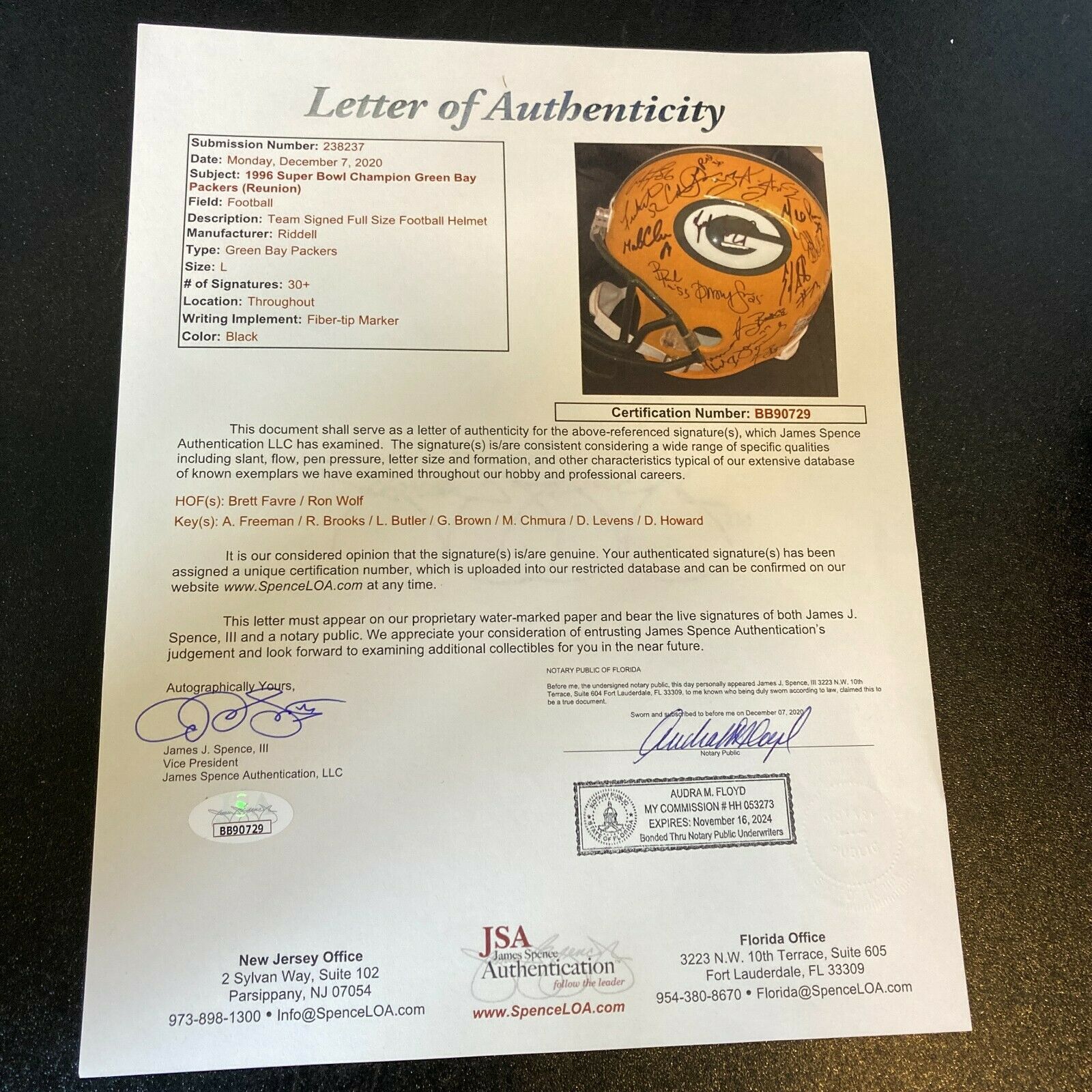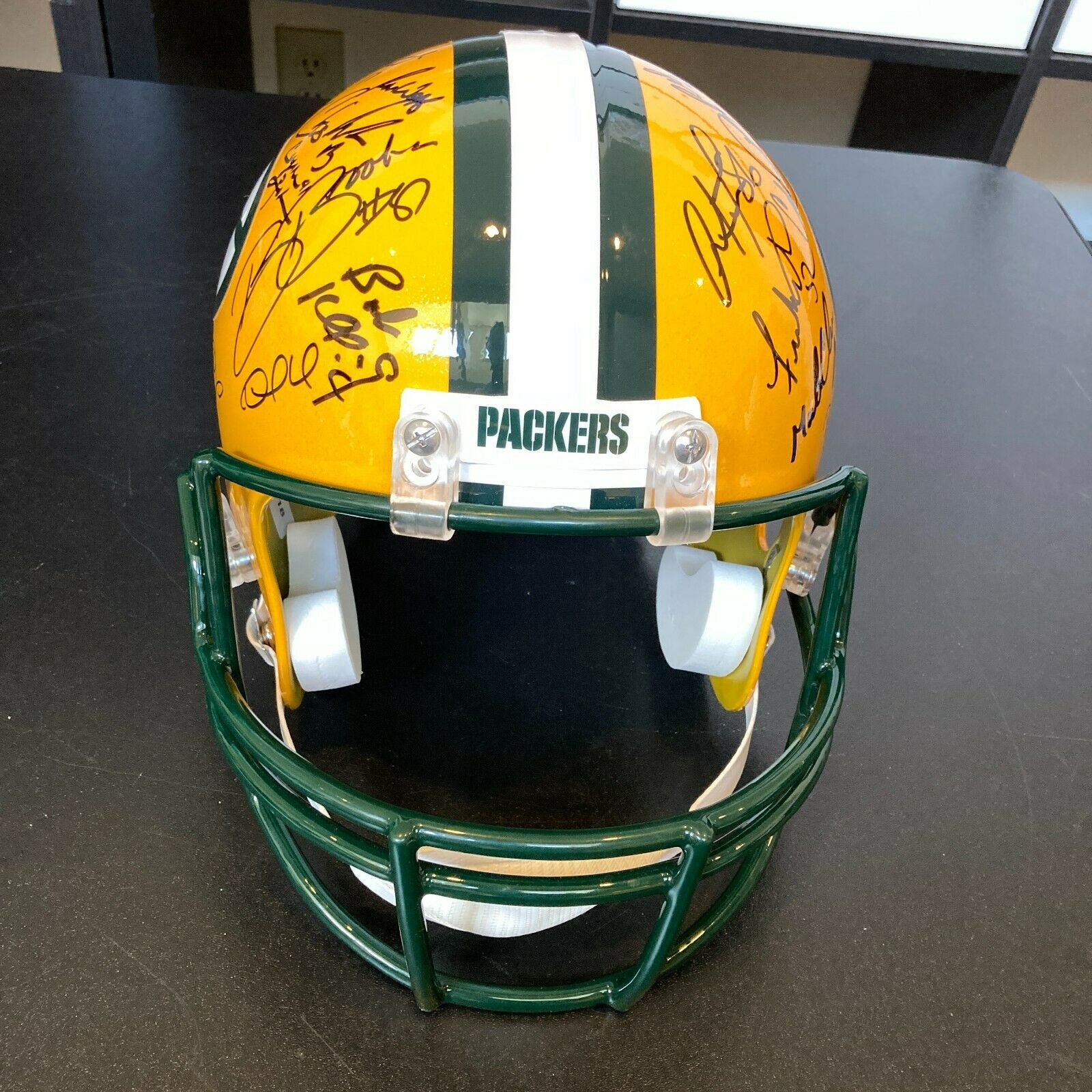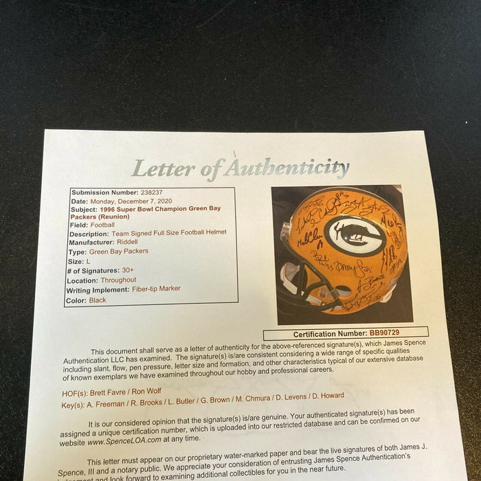 During the 39 year period between 1929-1967, the Green Bay Packers enjoyed eleven championship seasons. After that, they went into an extended slump, with just two measly playoff appearances during the span 1968-1992. Then came the Brett Favre era and a return to greatness, which has been sustained by Aaron Rodgers and crew to the present day. The crowning point of Favre's time at the helm was the 1996 season, which ended with a Packers win in Super Bowl XXXI. Celebrate this memorable victory, with this 1996 Super Bowl XXXI champions reunion team-signed helmet. Signed by a total of (34), this like-new helmet makes a fantastic commemoration of this franchise redeeming triumph. Full photo LOA from JSA.