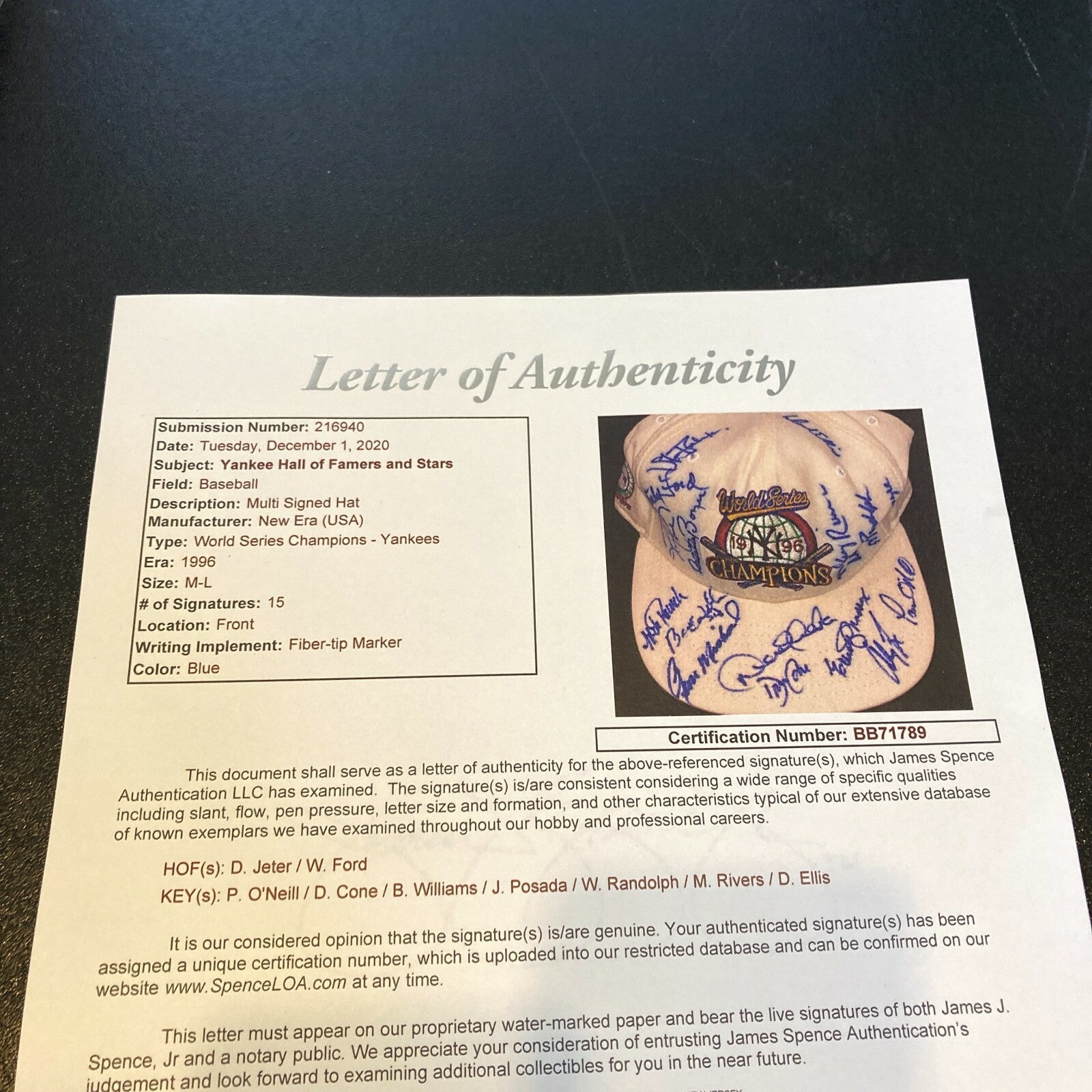 15 signatures with Derek Jeter, Whitey Ford , David Cone, Mickey Rivers, Paul O’Neill, Bernie Williams, Jorge Posada, Gene Michael, Mel Stottlemyre, Willie Randolph and others. Comes with full letter JSA COA.