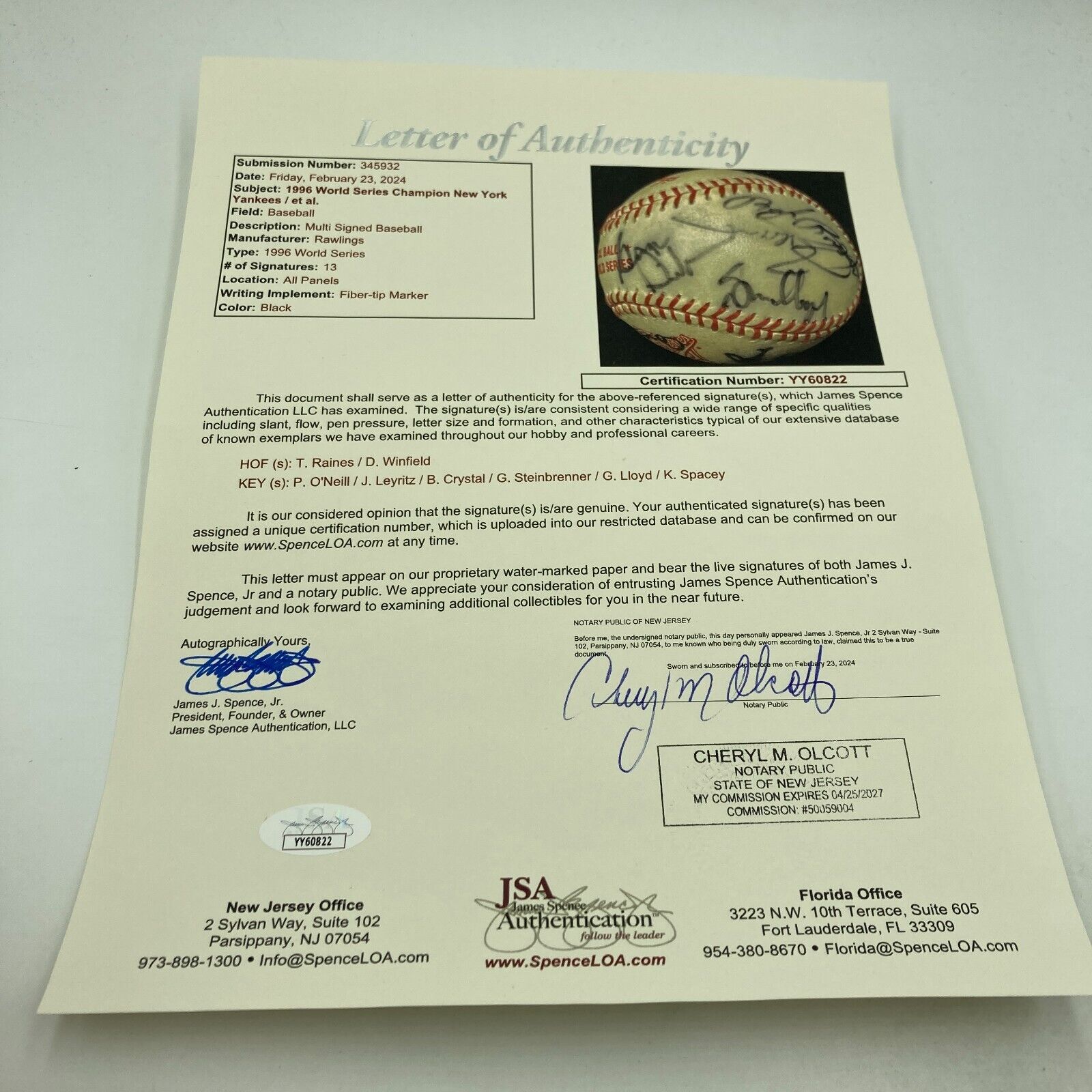 1996 New York Yankees Multi signed 1996 World Series Baseball. 13 signatures with: Tim Raines, Dave Winfield, Paul O'neill, Jim Leyritz, Graham Lloyd, George Steinbrenner, Billy Crystal and Kevin Spacey. Comes with full letter JSA COA.